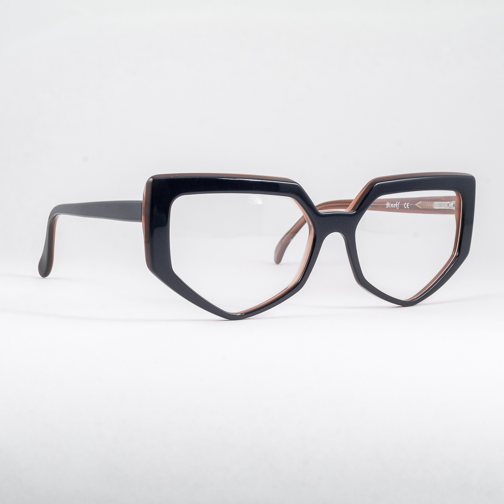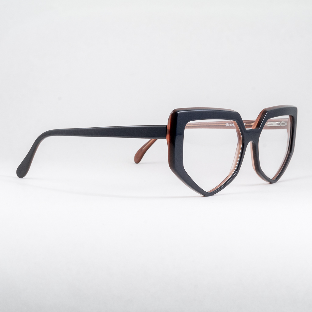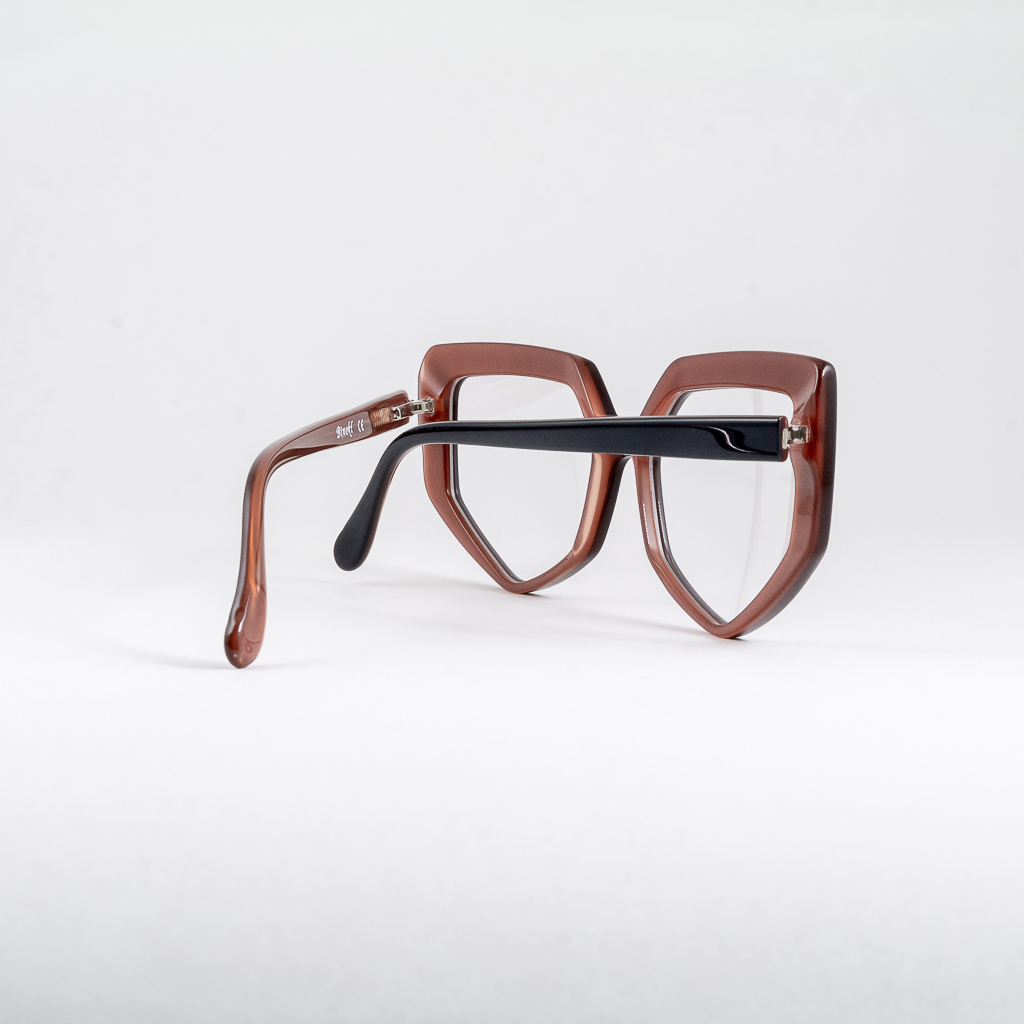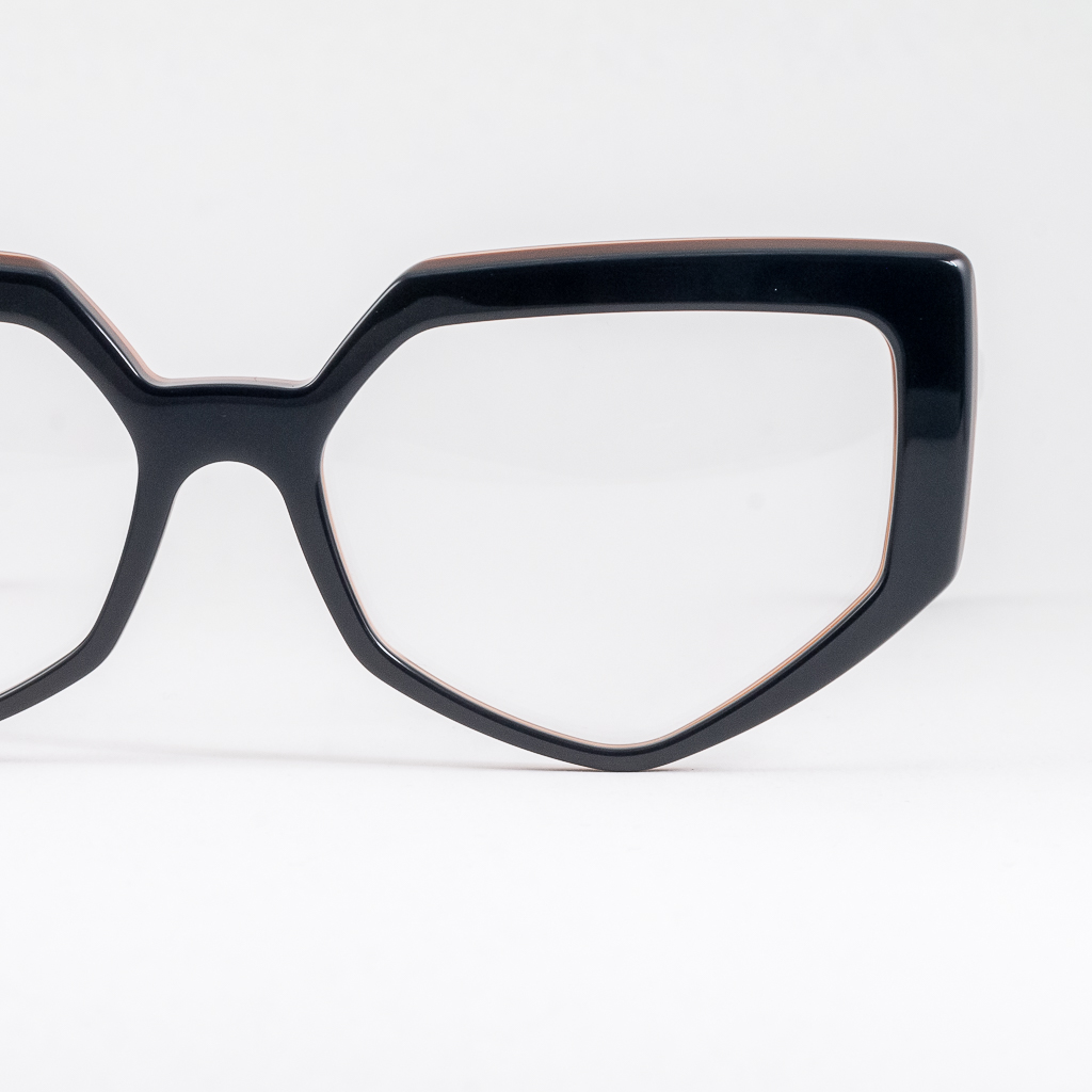 Oprawa damska wykonana z tworzywa, od polskiej marki Binokl. Tarcze w nietypowym kształcie wielokąta ściętego na linii brwi i wyciągniętego do dołu. Od zewnątrz połyskująca czerń. Od wewnątrz kolor ceglasty widoczny pod transparentną warstwą (uwaga: jaśniejszy i żywszy niż na zdjęciach). Na łączeniach powyższych kolorów widać staranny frez. Zawiasy typu flex sprzyjają dłuższemu życiu okularów i komfortowi użytkowania.