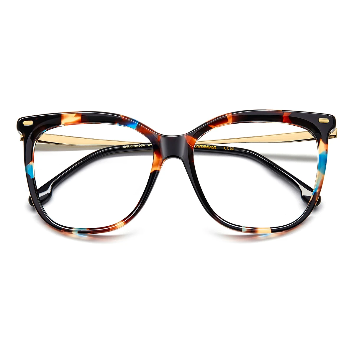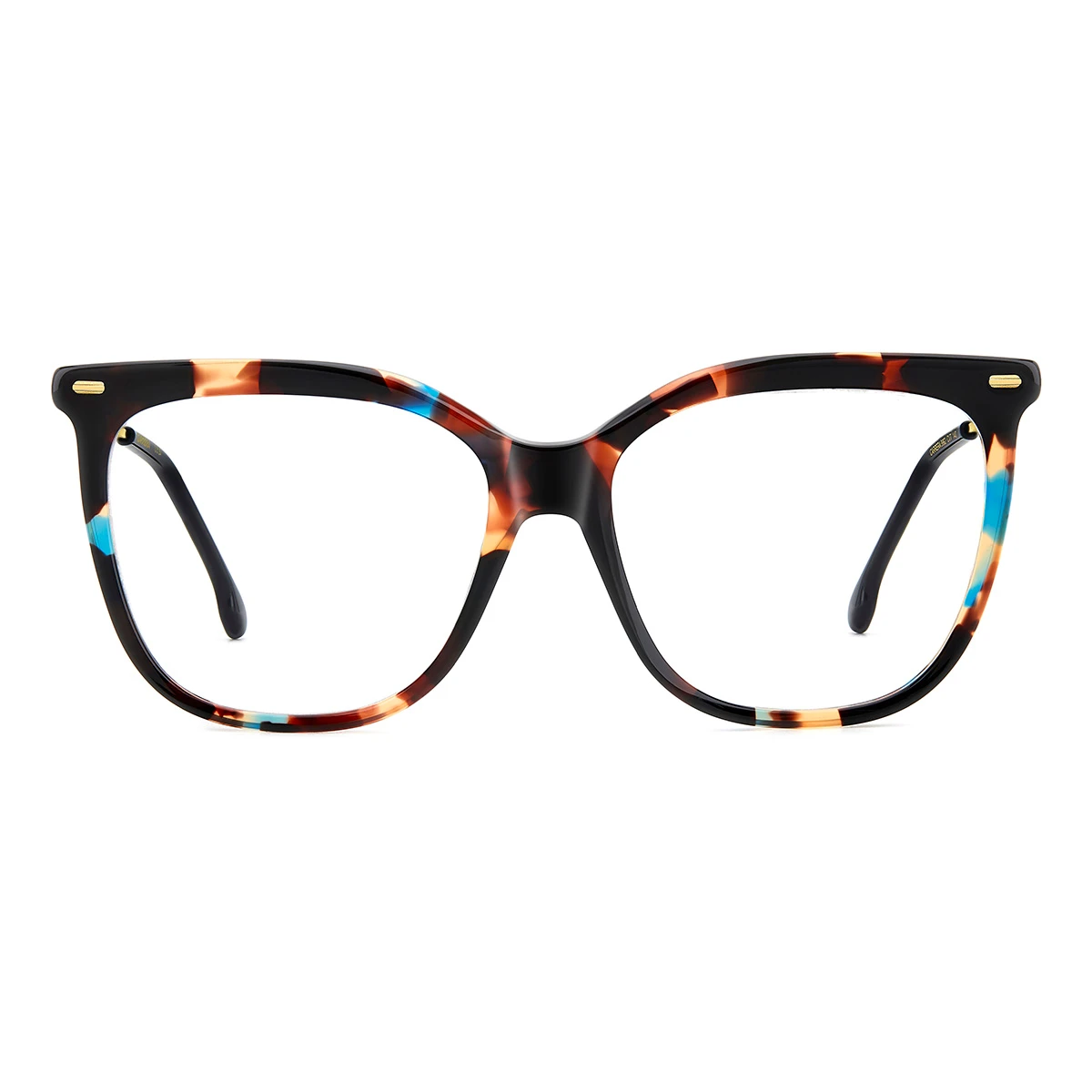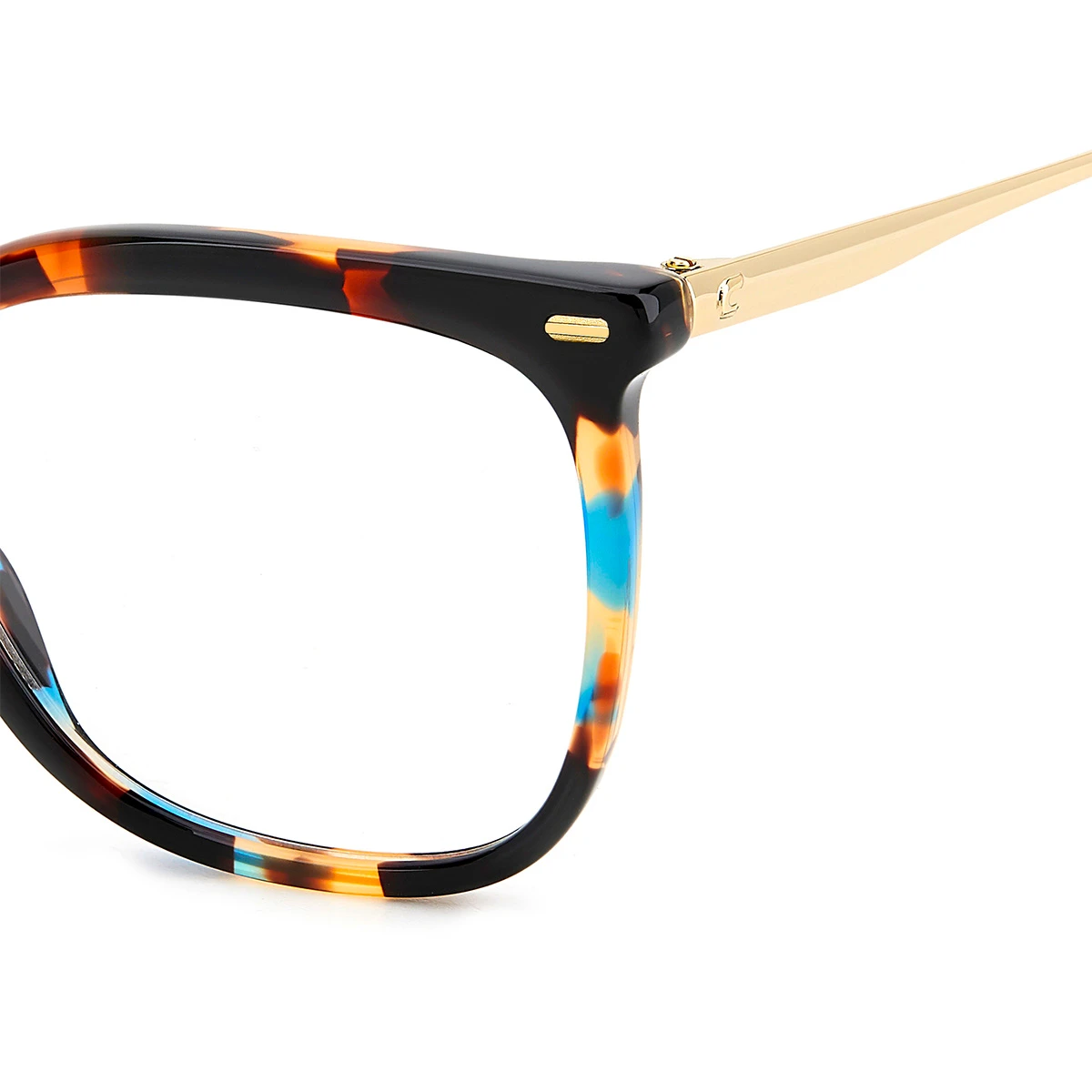Front oprawki wykonany z acetatu w unikalnym kolorze – mieszanka brązu, beżu, czerni i kontrastowych niebieskich akcentów tworzy efektowny melanż. Kształt tarcz zbliżony do klasycznego kwadratu, ale z miękko zaokrąglonymi krawędziami. Zauszniki wykonane z metalu w kolorze jasnego złota kontrastują z kolorowym frontem. Subtelne logo Carrera na zausznikach przy zawiasach. Charakterystyczne metalowe detale w rogach frontu.