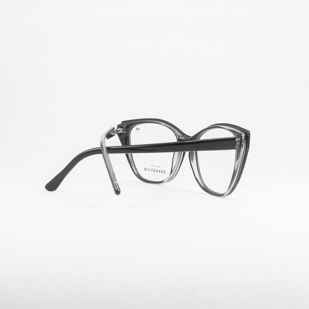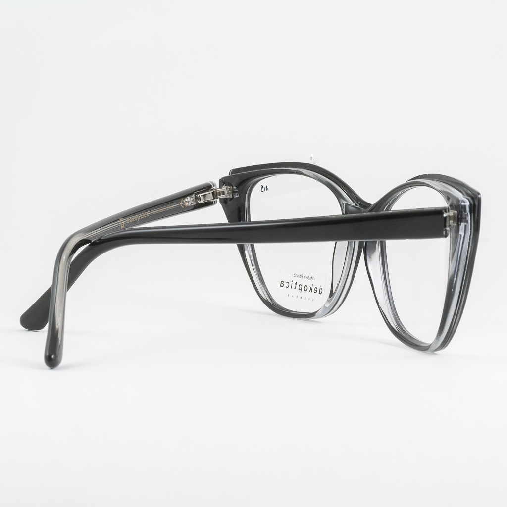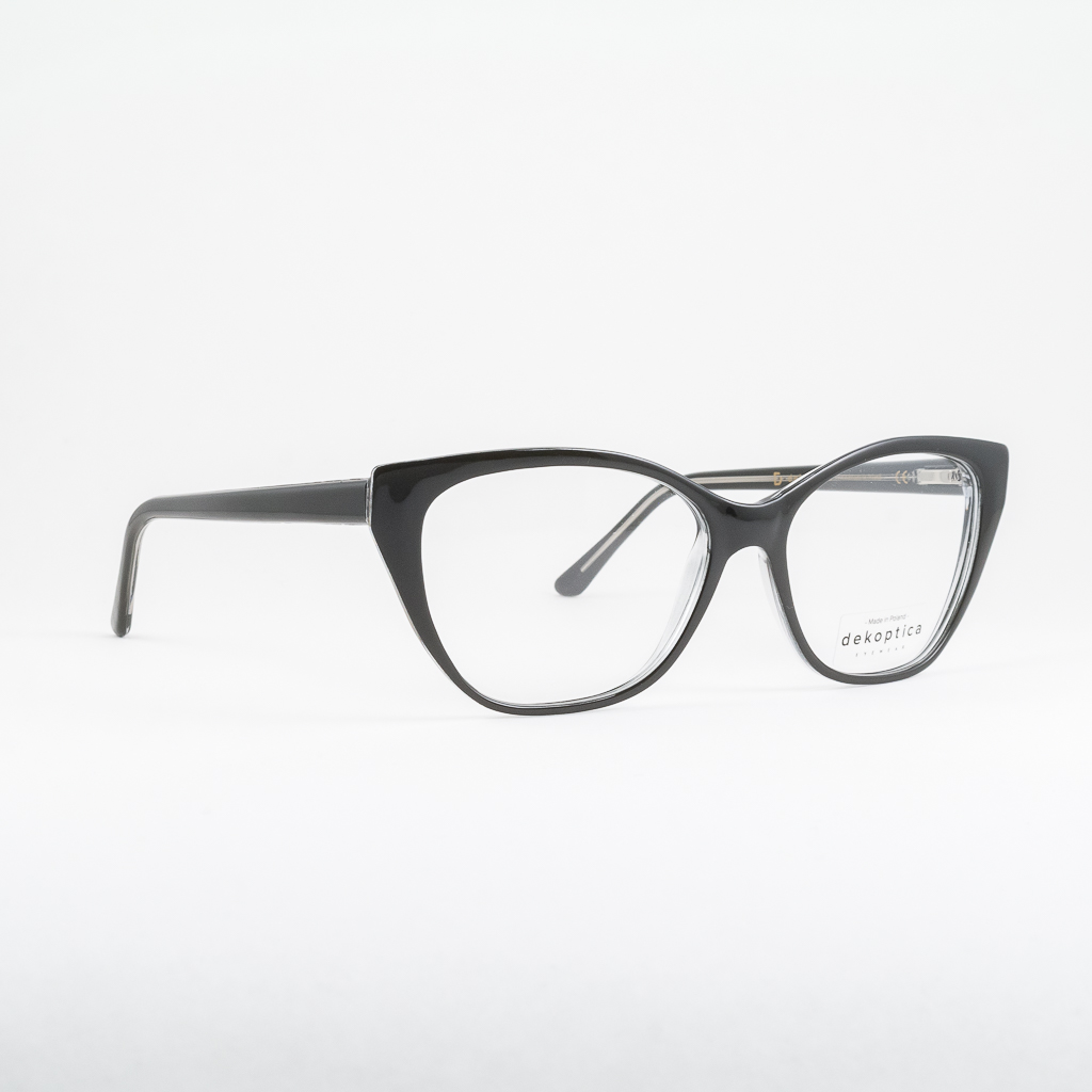 Plastikowe oprawki damskie od polskiego producenta Dekoptica. Tarcze wyciągnięte w kocie oczy, oprawki w jednolitym kolorze czarnym. Wnętrze frontu transparentne. Zawias typu flex sprzyja komfortowi użytkowania i dłuższemu życiu okularów.