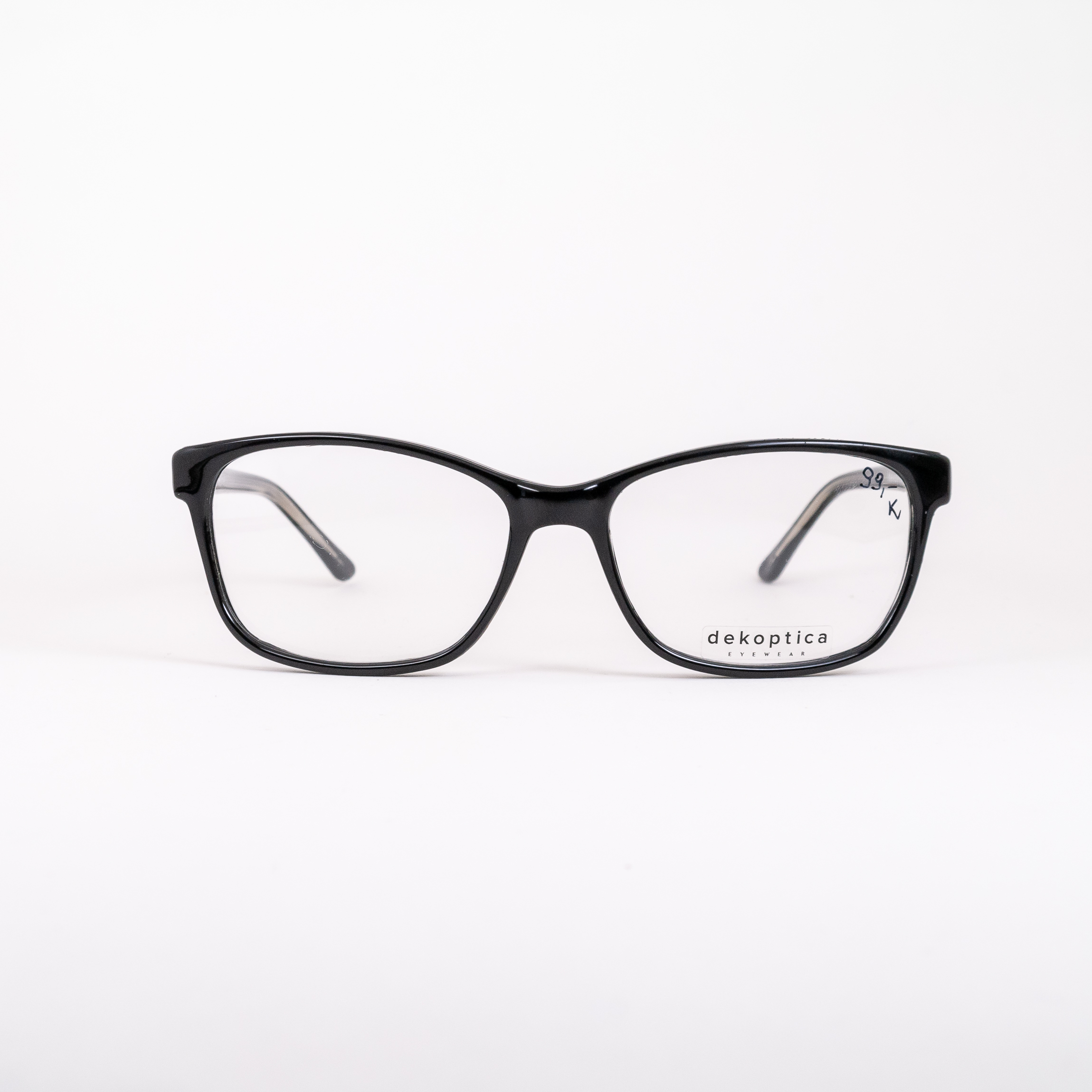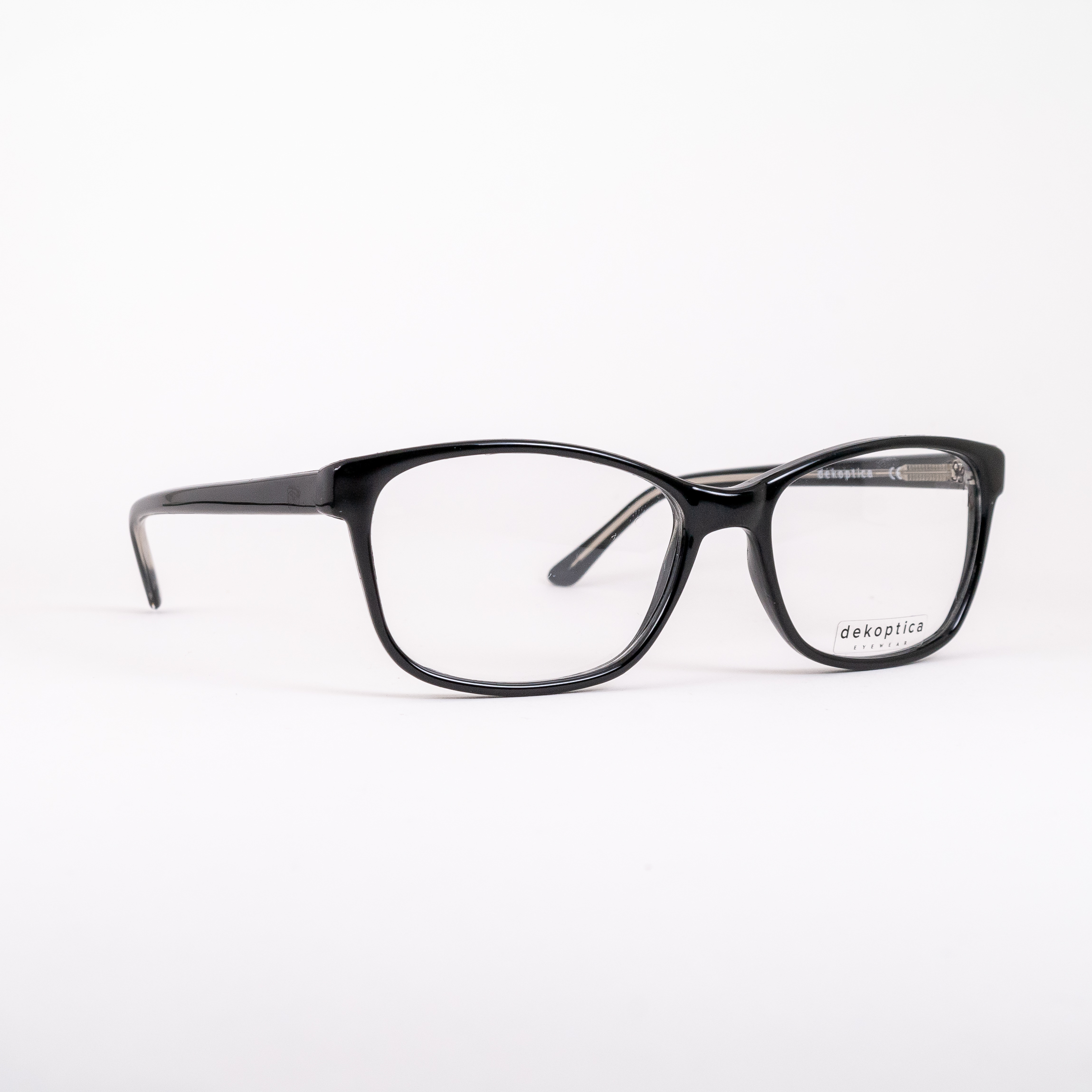 Plastikowa oprawa damska od polskiego producenta Dekoptica. Tarcze w kształcie motyla, całe oprawki w jednolitym kolorze czarnym.