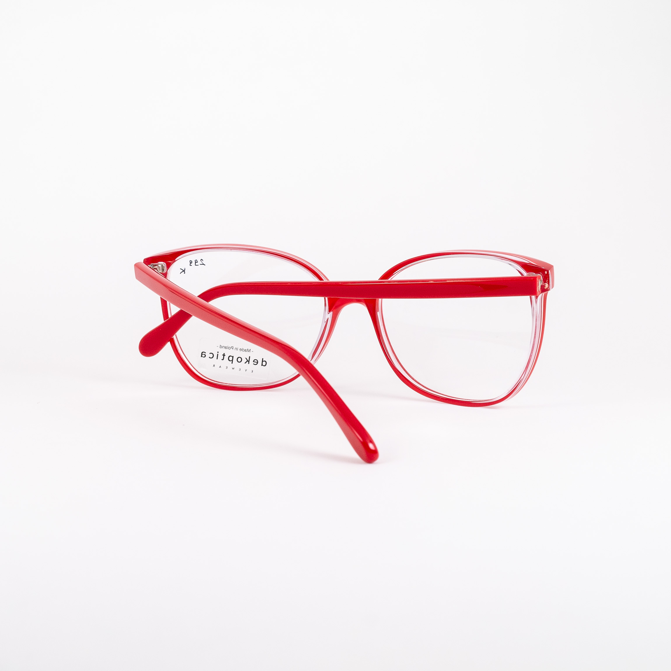 Plastikowe oprawki damskie polskiej marki Dekoptica. Lekko obniżony mostek i wyciągnięta ku górze linia brwi, czyli kobiecy kształt motyla. Całość w intensywnej czerwieni, front podbity transparentną warstwą.