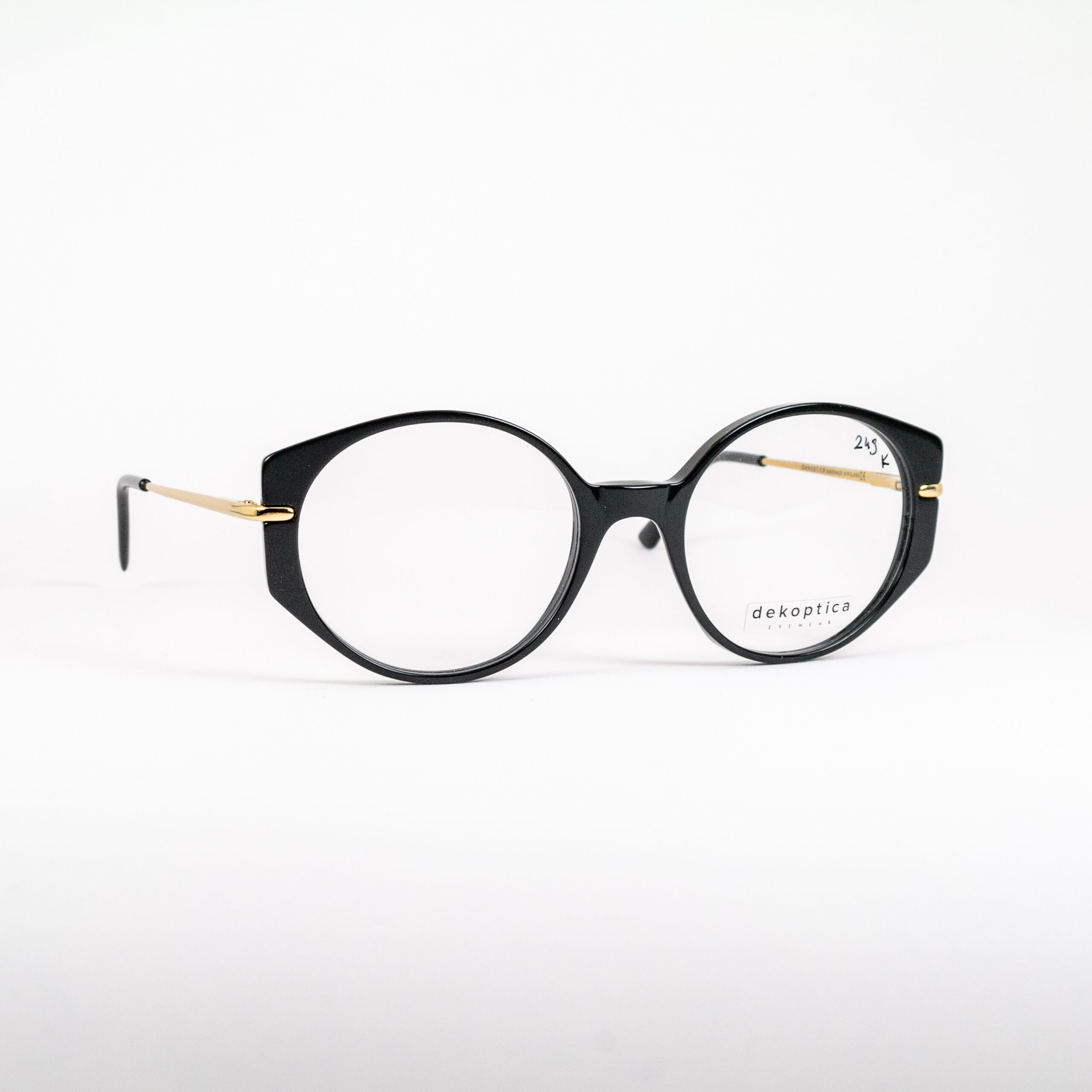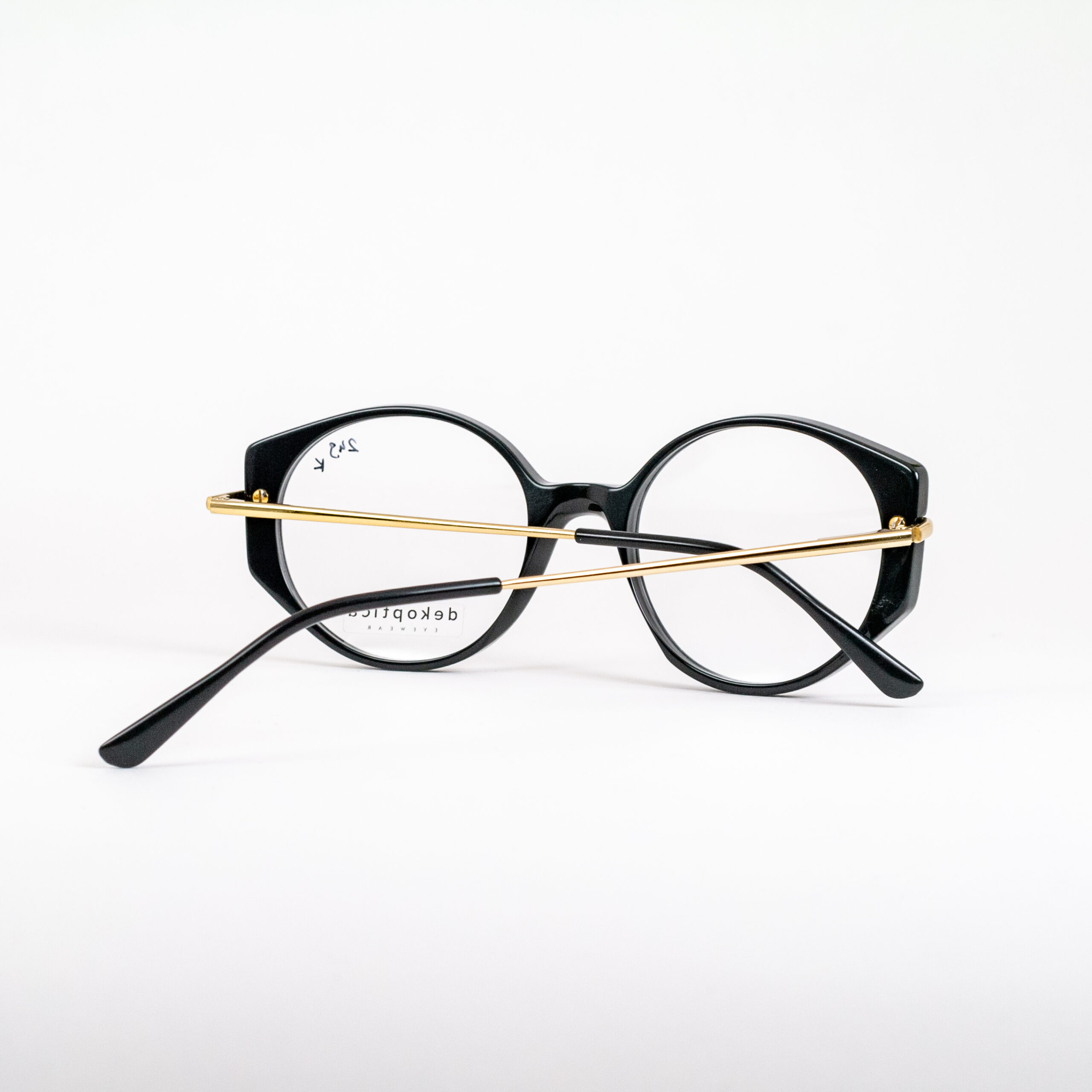 Oprawki damskie z łączonych materiałów z owalnymi tarczami od polskiej marki Dekoptica. Plastikowy front w klasycznej czerni. Zahaczające o front metalowe zauszniki w kolorze złotym zakończone czarnym plastikiem.