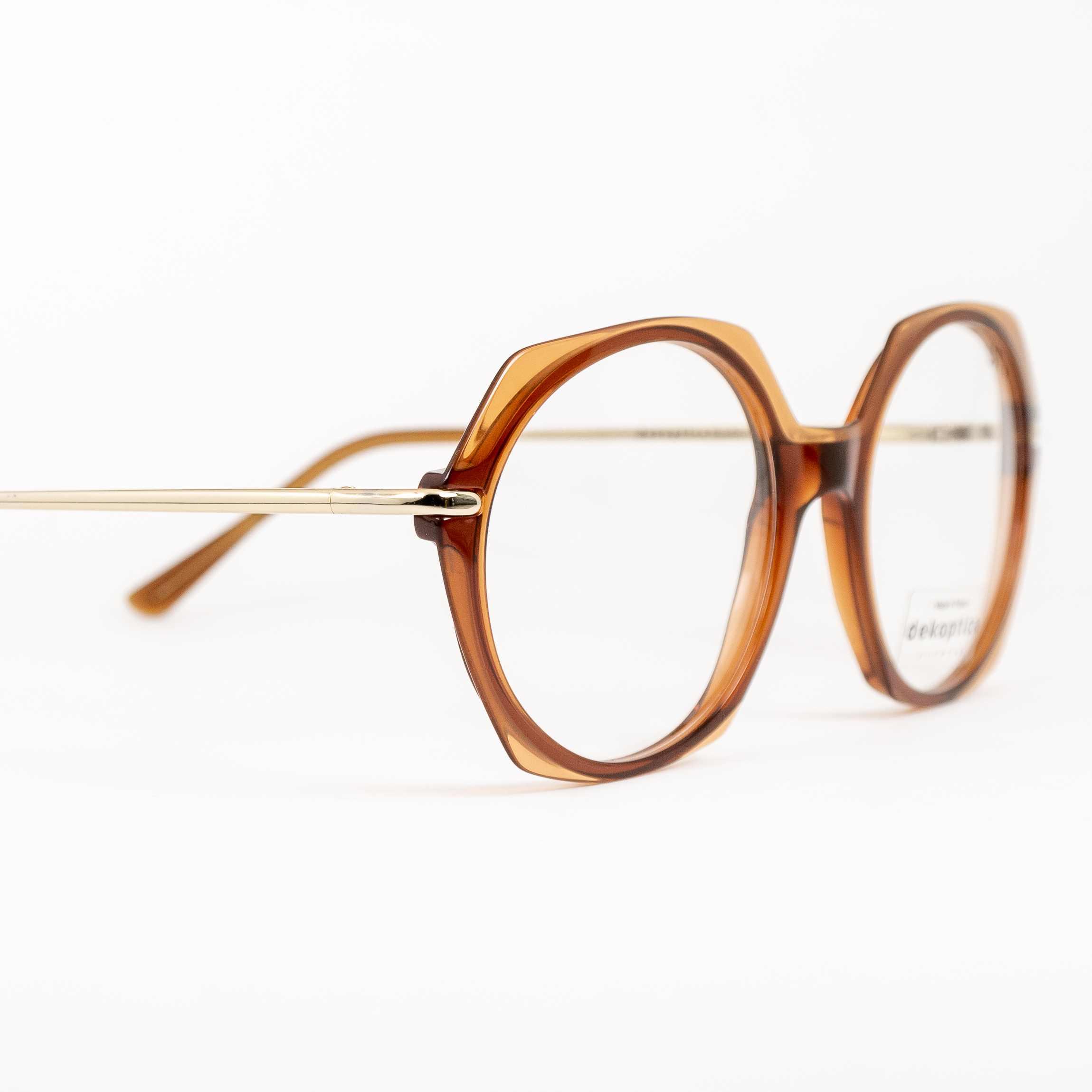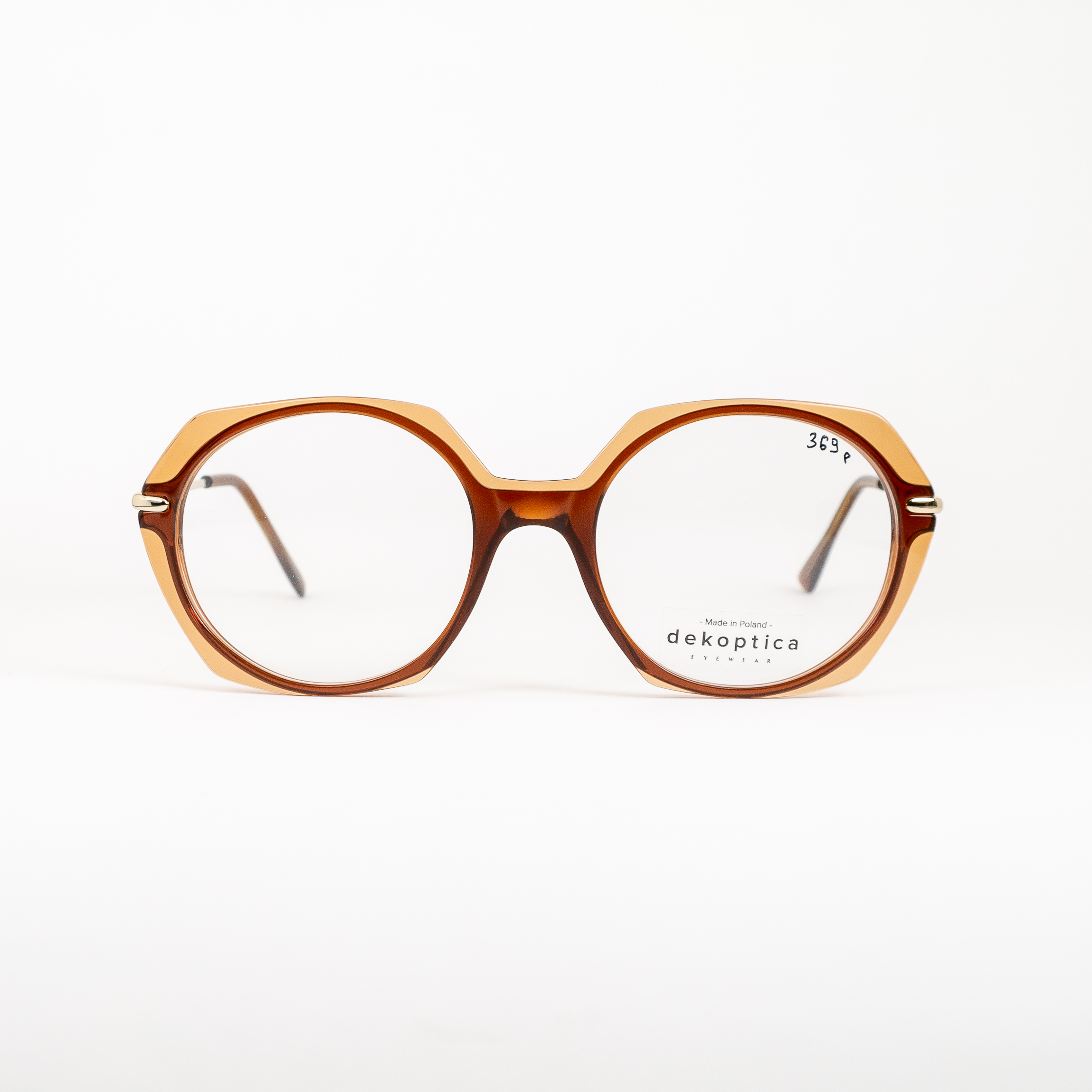 Oprawki damskie z najnowszej kolekcji polskiej marki Dekoptica. Plastikowy front wyfrezowany w dwóch płaszczyznach, co widać dzięki częściowej transparentności tworzywa. Okrągłe tarcze w kanciastym “obramowaniu”. Metalowe zauszniki w kolorze złotym, reszta w kolorze brązowym. Zawiasy typu flex sprzyjają komfortowi użytkowania i dłuższemu życiu okularów.