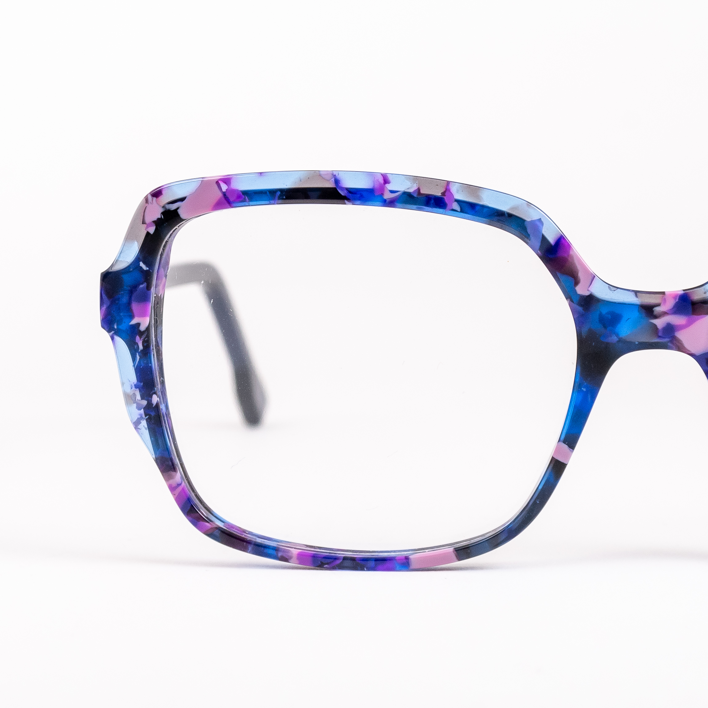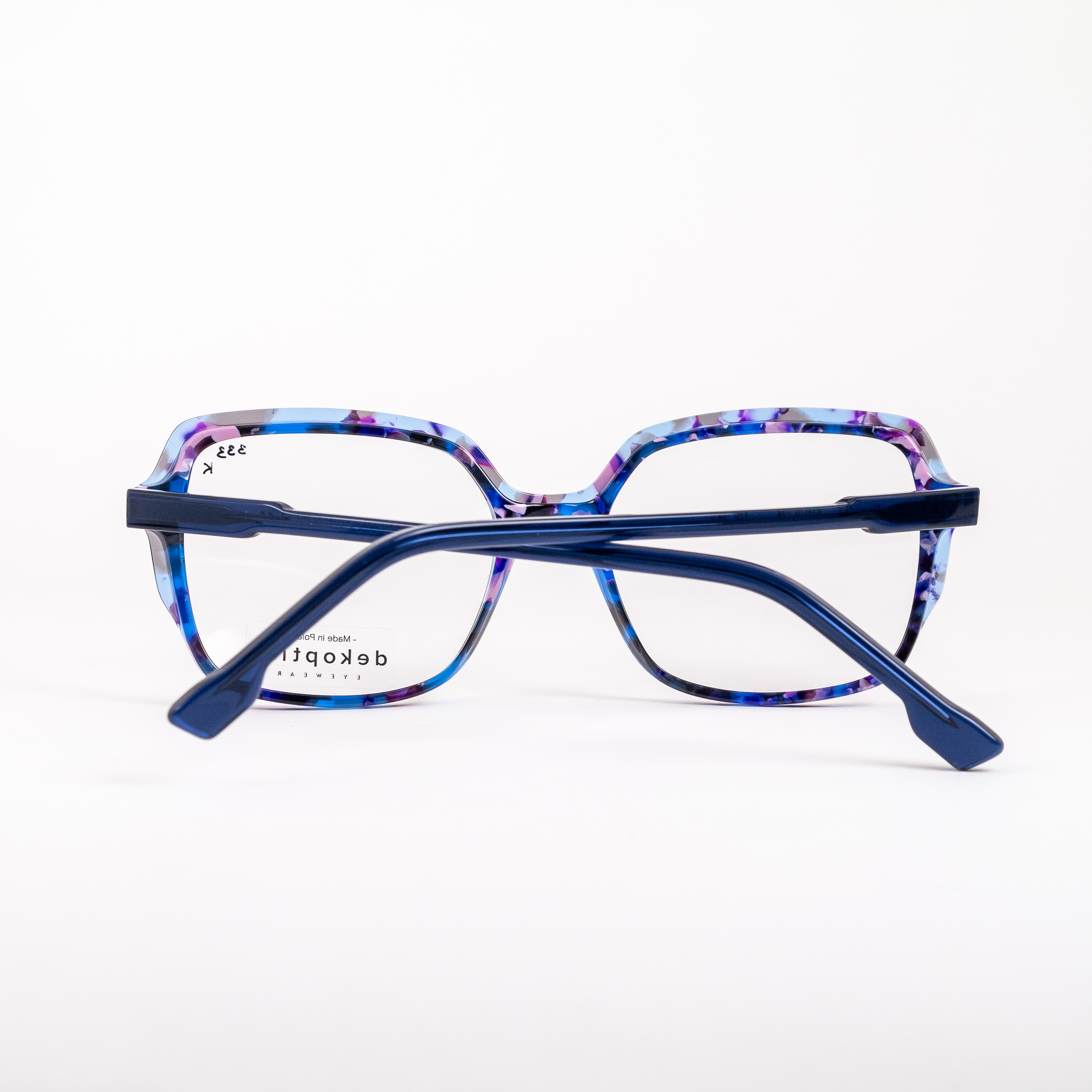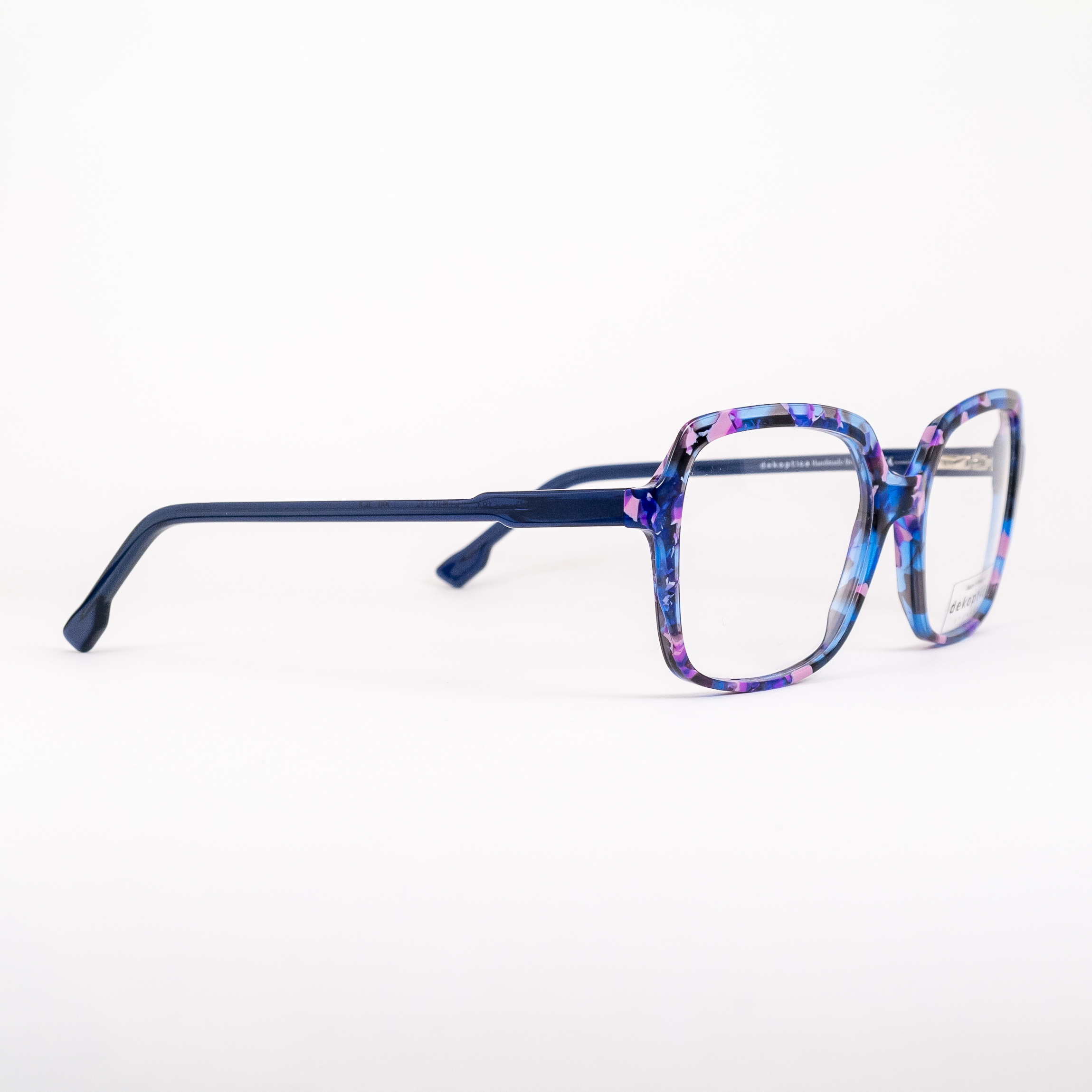 Oprawki damskie z najnowszej kolekcji polskiego producenta Dekoptica. Prostokątne tarcze, na twarzy będą wydawać się wysokie ze względu na obniżony mostek. Frezowane w dwóch płaszczyznach, zachwycą oko szczególnie przy bliższym poznaniu. Front w melanżu kolorów: granatowego (który dominuje), fioletowego i bladoróżowego. Zauszniki w jednolitym, lekko transparentnym granacie. Zawiasy typu flex sprzyjają komfortowi użytkowania.