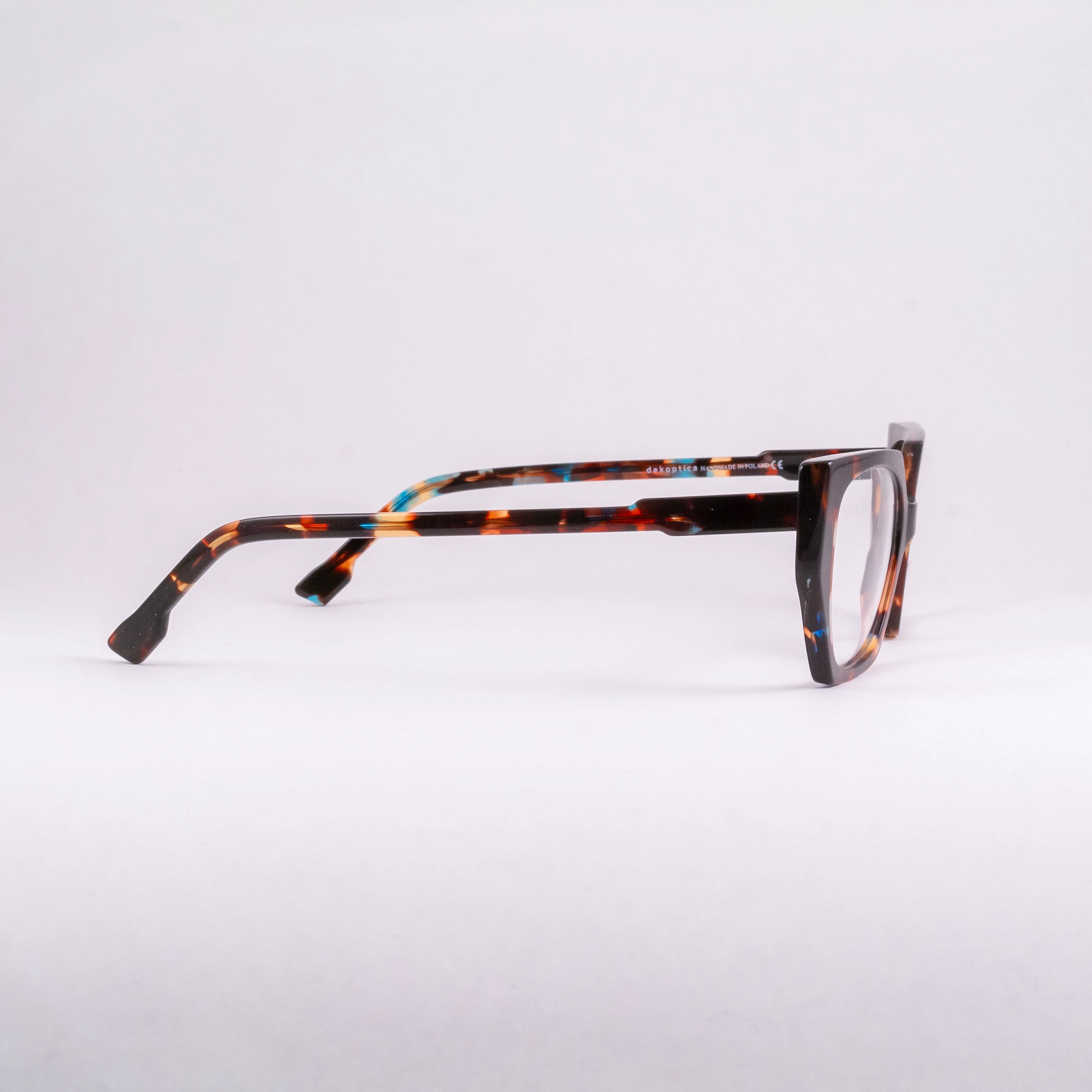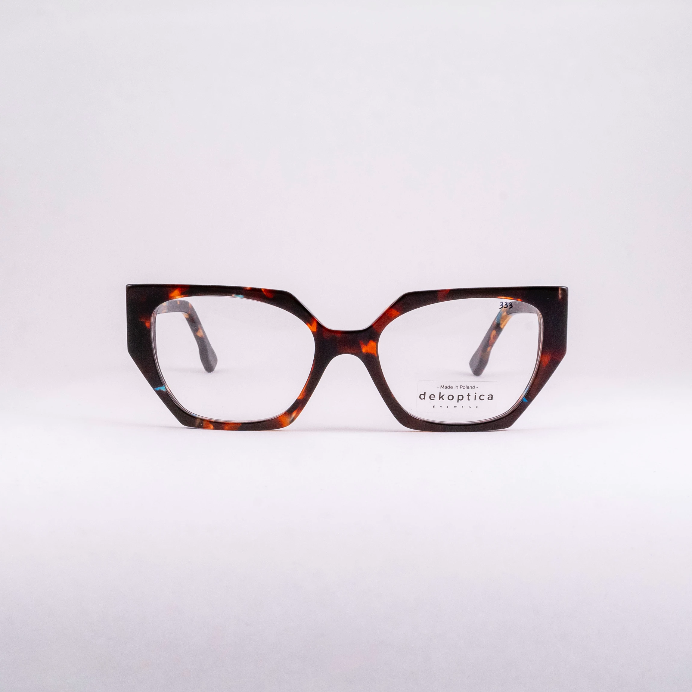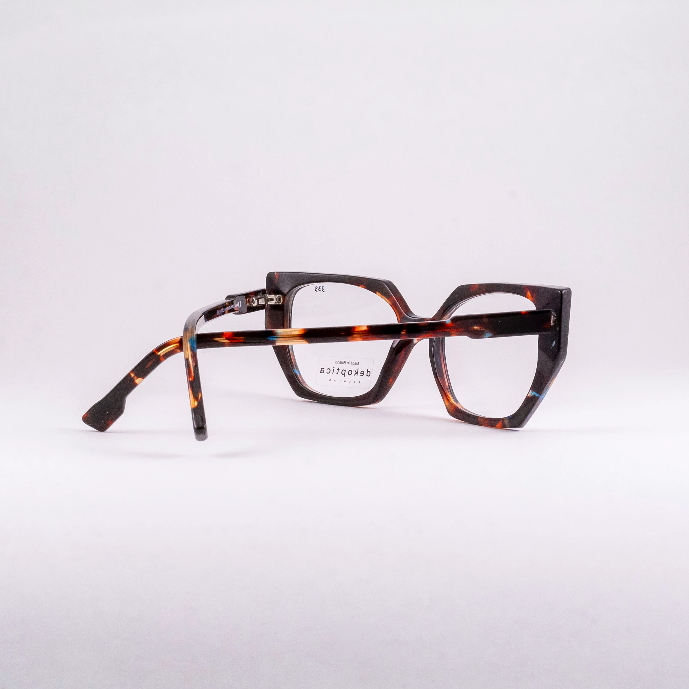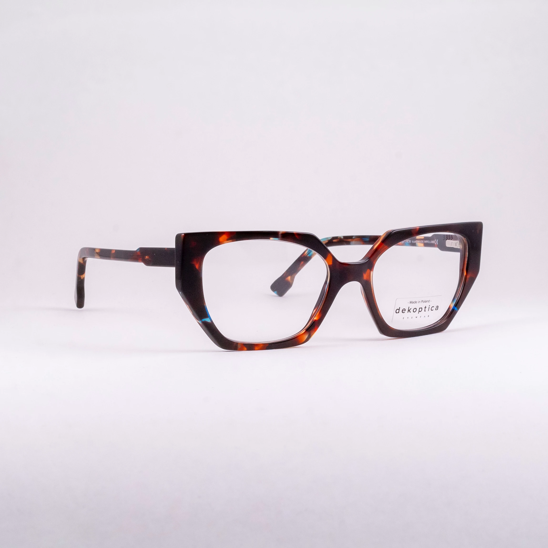 Oprawki damskie wykonane z tworzywa, od wrocławskiego producenta Dekoptica. Tarcze wyciągnięte na wzór kociego oka, oryginalnie “ścięte” w różnych płaszczyznach. Całość w brązowym szylkrecie z domieszką koloru błękitnego.