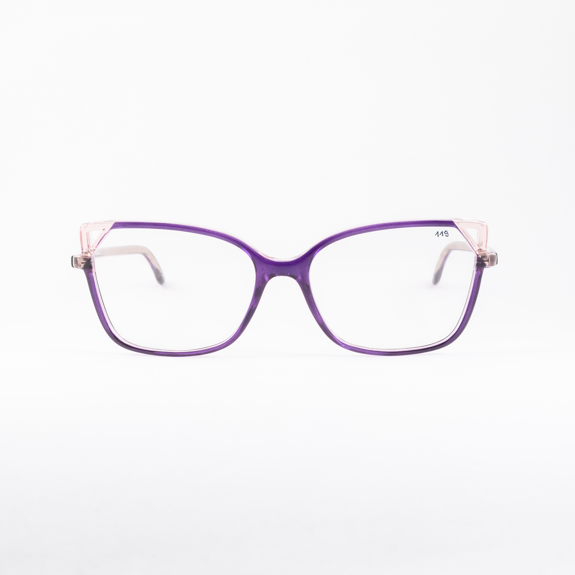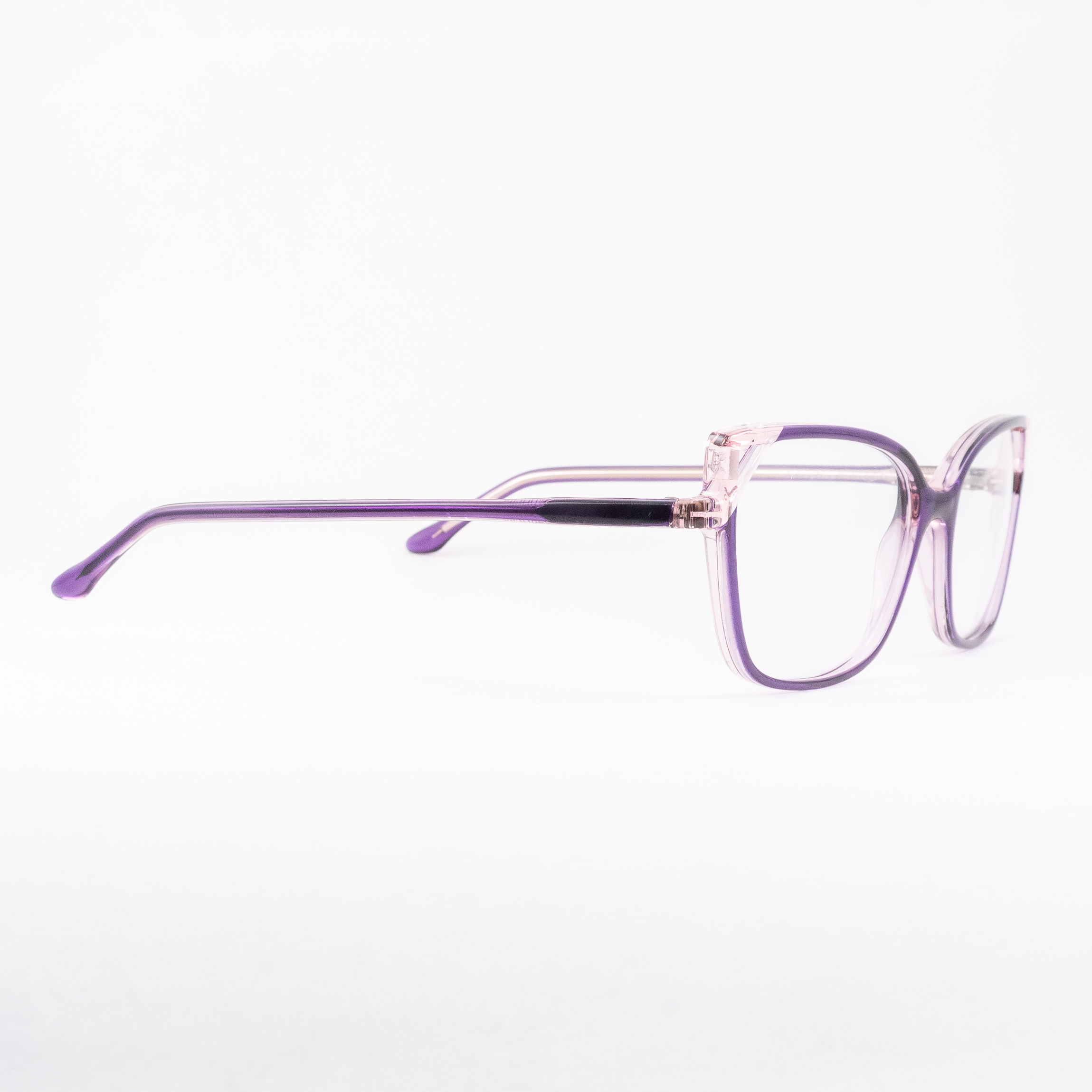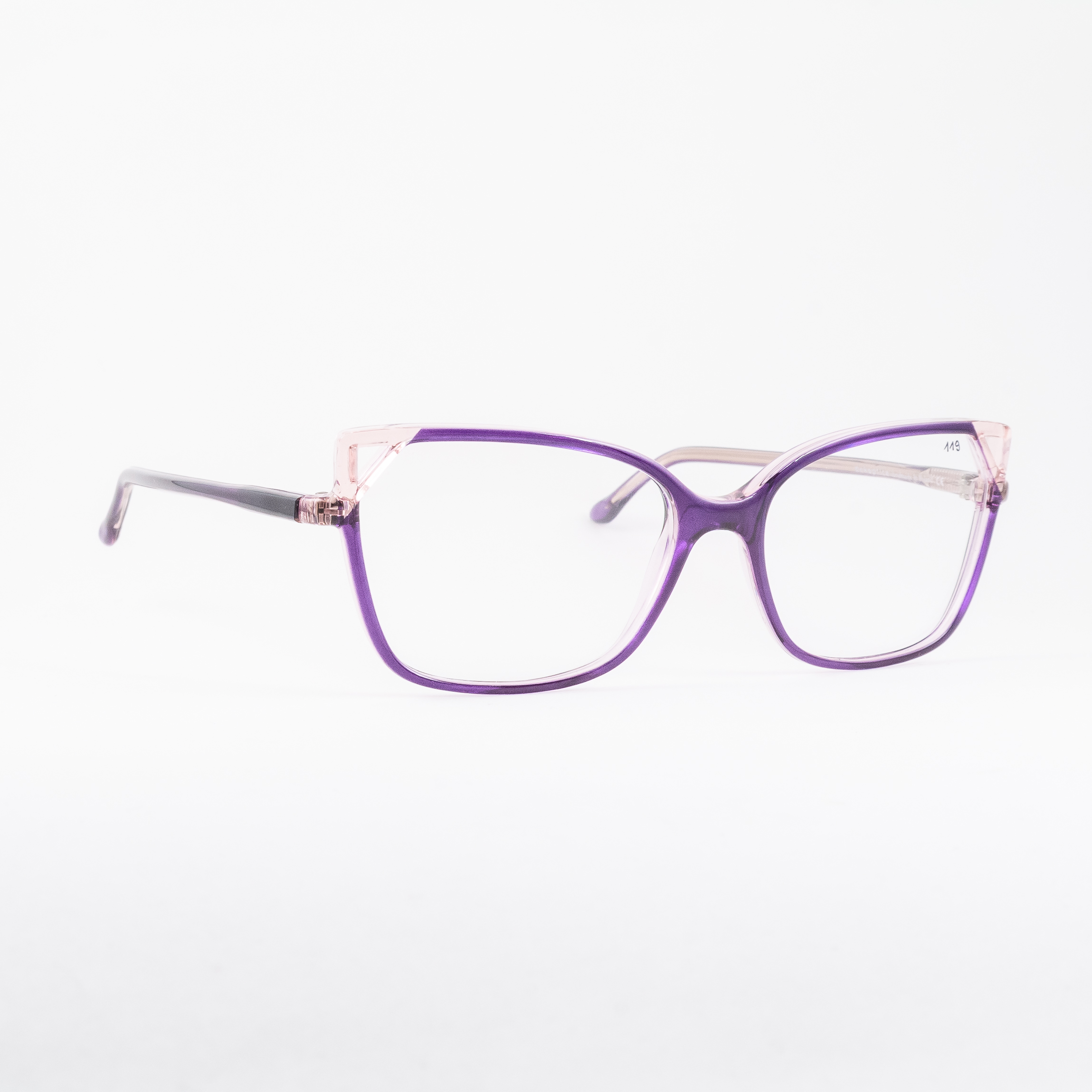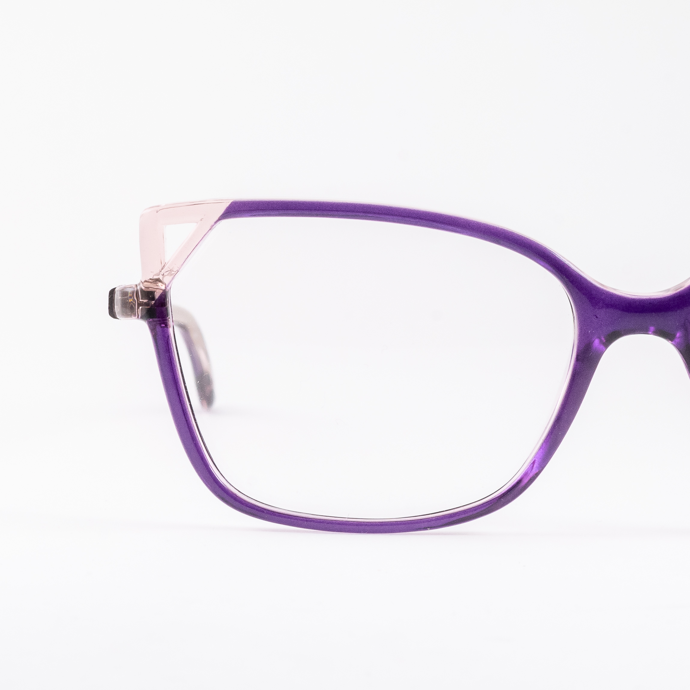 Plastikowe oprawki damskie od polskiego producenta Dekoptica. Duże tarcze, kształt kociego oka. Dominujący kolor fioletowy, końcówki wyciągniętych tarcz w jasnym kolorze różowym.