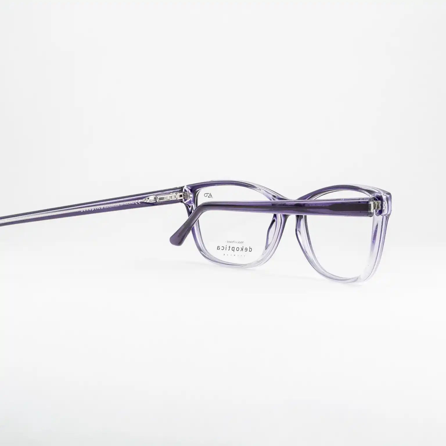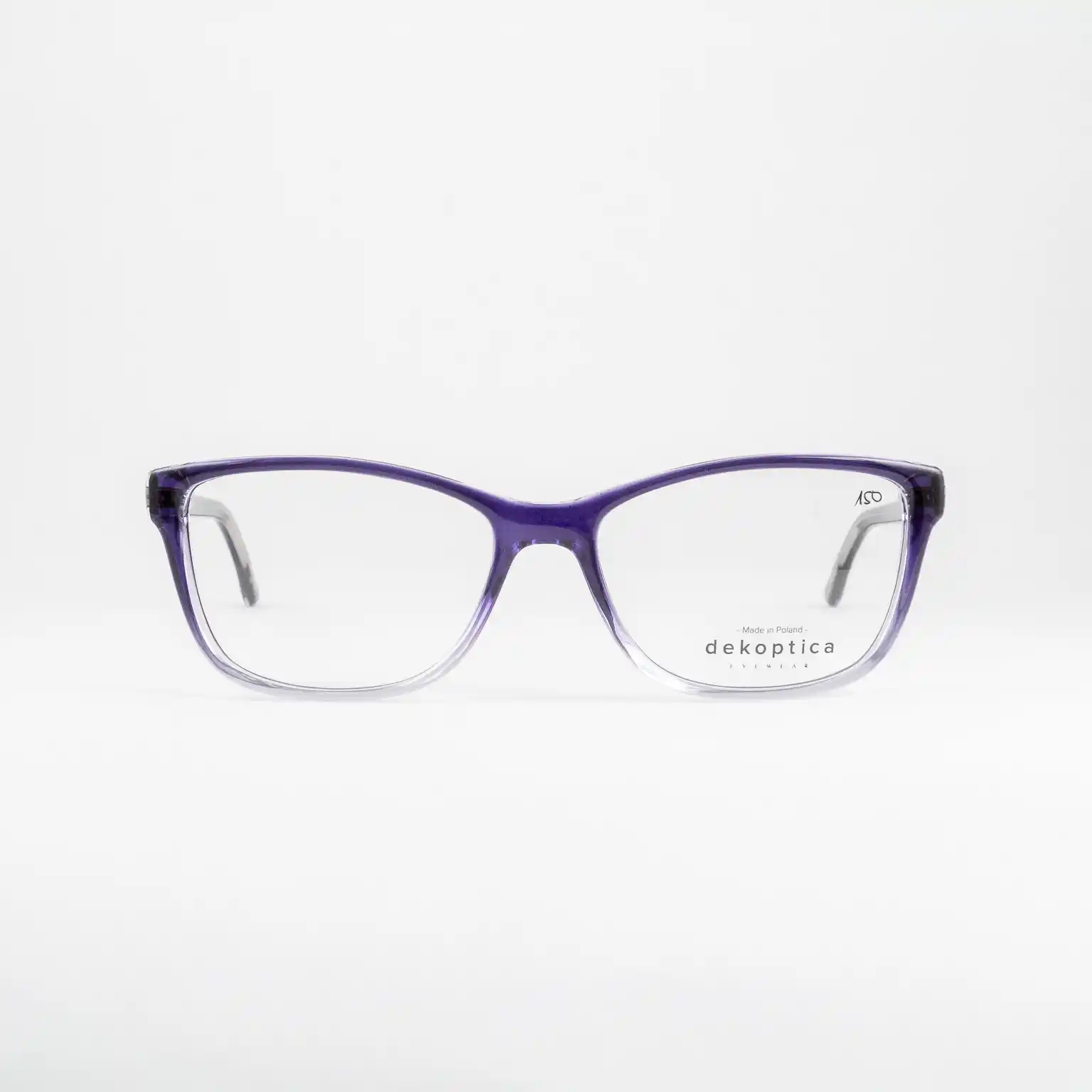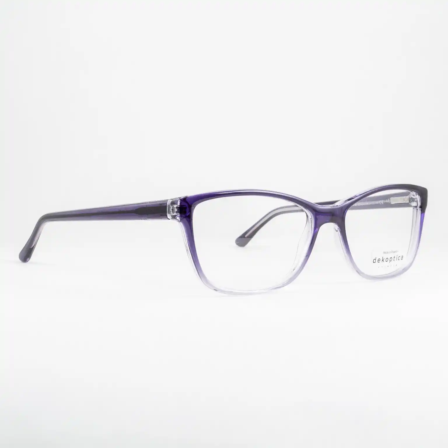 Plastikowe oprawki damskie od polskiego producenta Dekoptica. Tarcze delikatnie wyciągnięte w kocie oko. Dominuje kolor fioletowy, na froncie stopniowo rozjaśnia się ku dołowi, całość lekko transparentna. Zawiasy typu flex sprzyjają komfortowi użytkowania i dłuższemu życiu okularów.