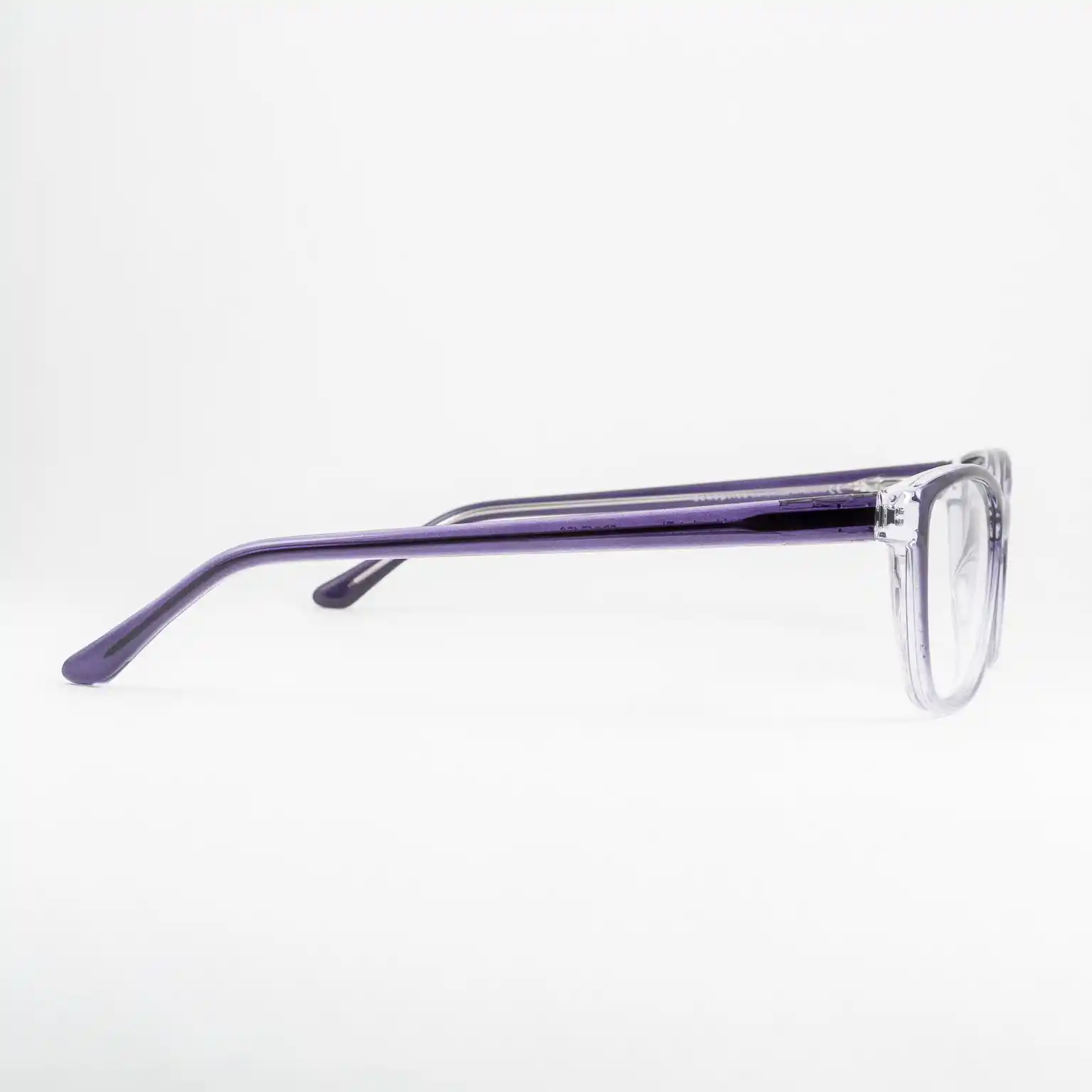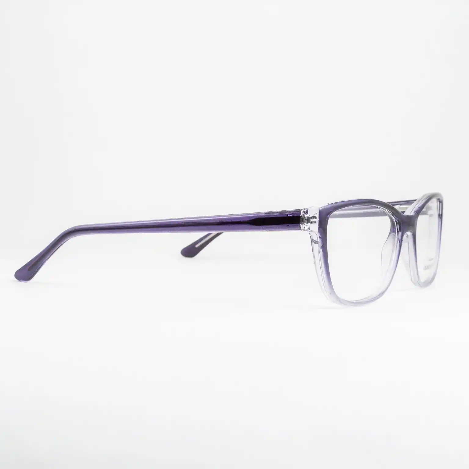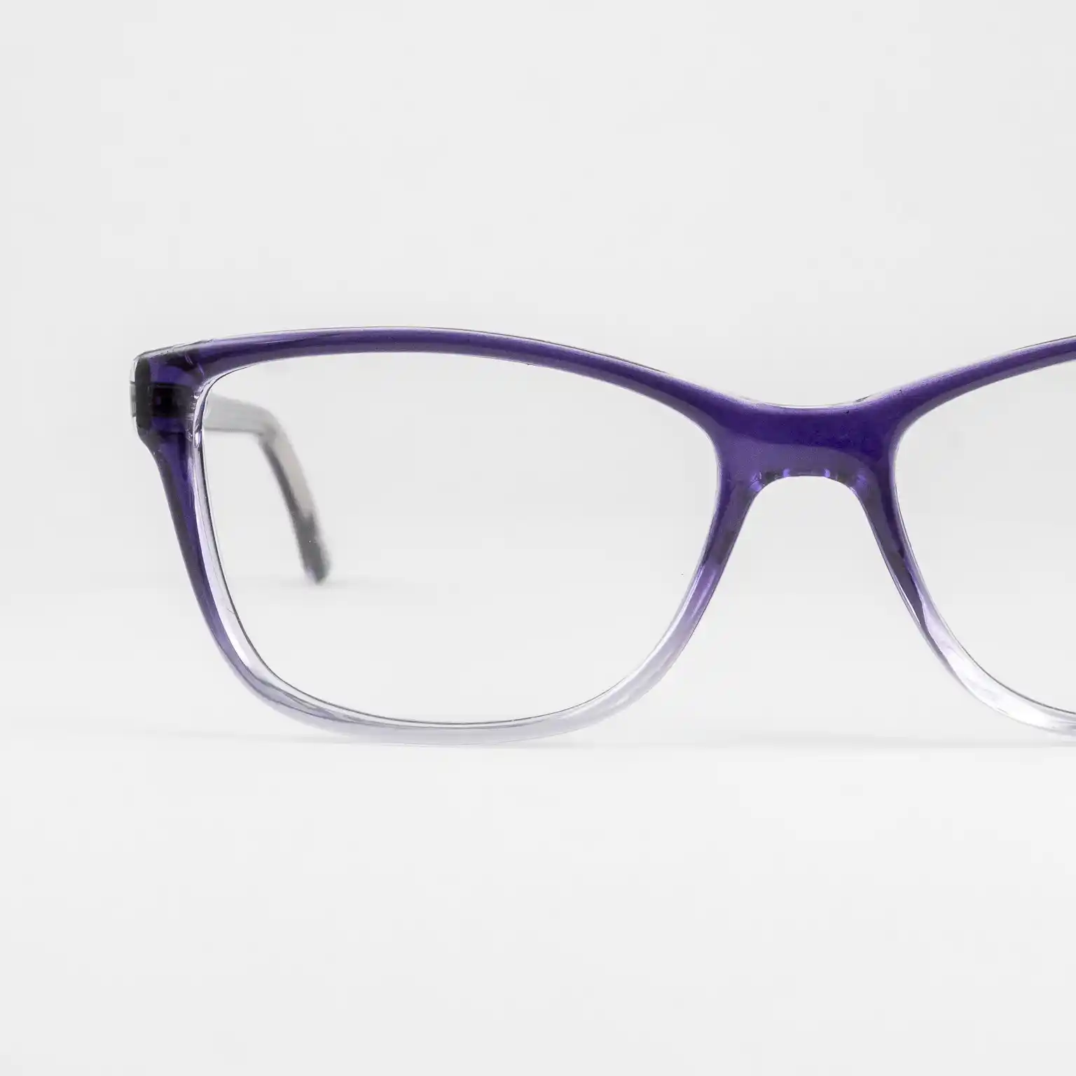 Plastikowe oprawki damskie od polskiego producenta Dekoptica. Tarcze delikatnie wyciągnięte w kocie oko. Dominuje kolor fioletowy, na froncie stopniowo rozjaśnia się ku dołowi, całość lekko transparentna. Zawiasy typu flex sprzyjają komfortowi użytkowania i dłuższemu życiu okularów.