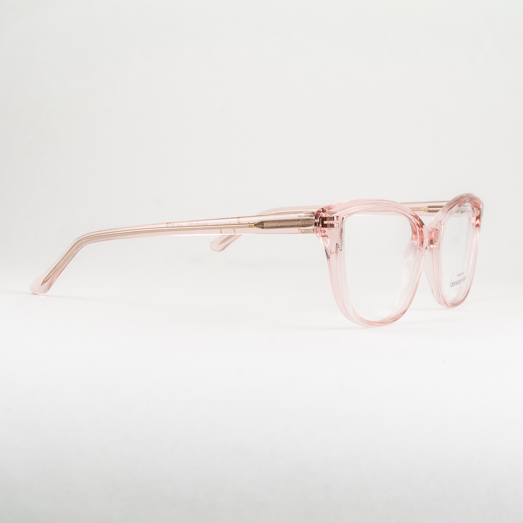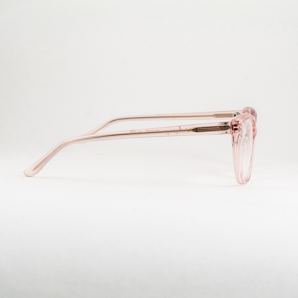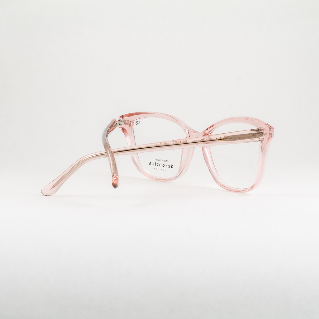 Plastikowe oprawki damskie od polskiego producenta – wrocławskiej marki Dekoptica. Kształt kociego oka, całość w semi-transparentnym, jasnym kolorze różowym (szampańskim).