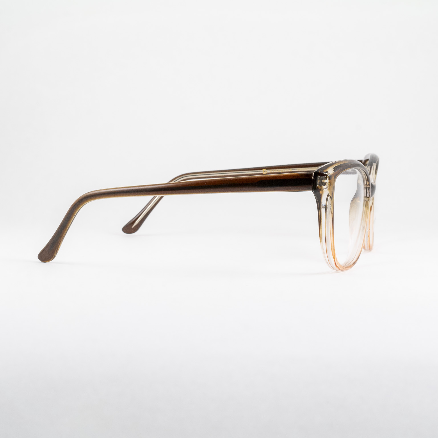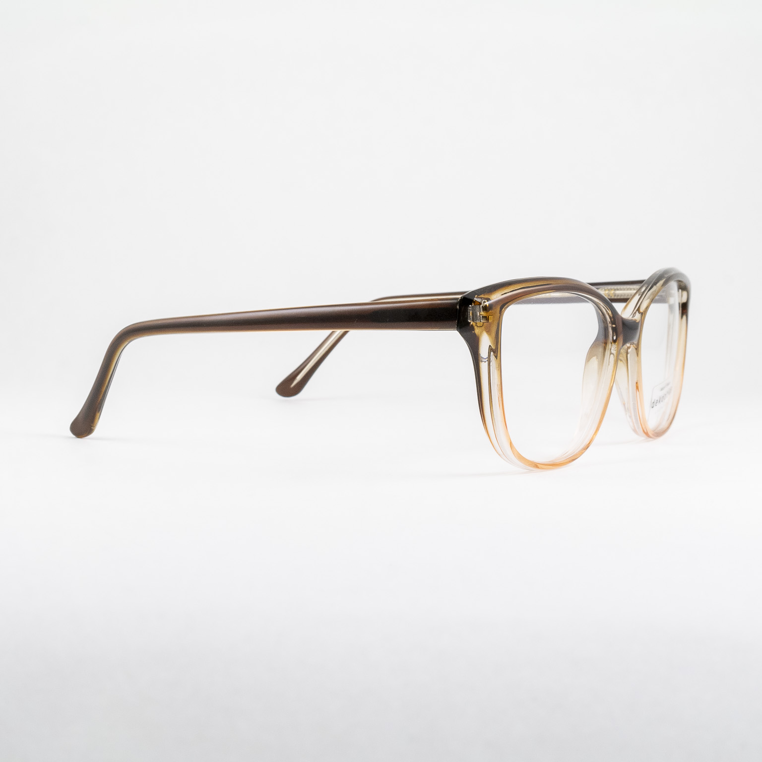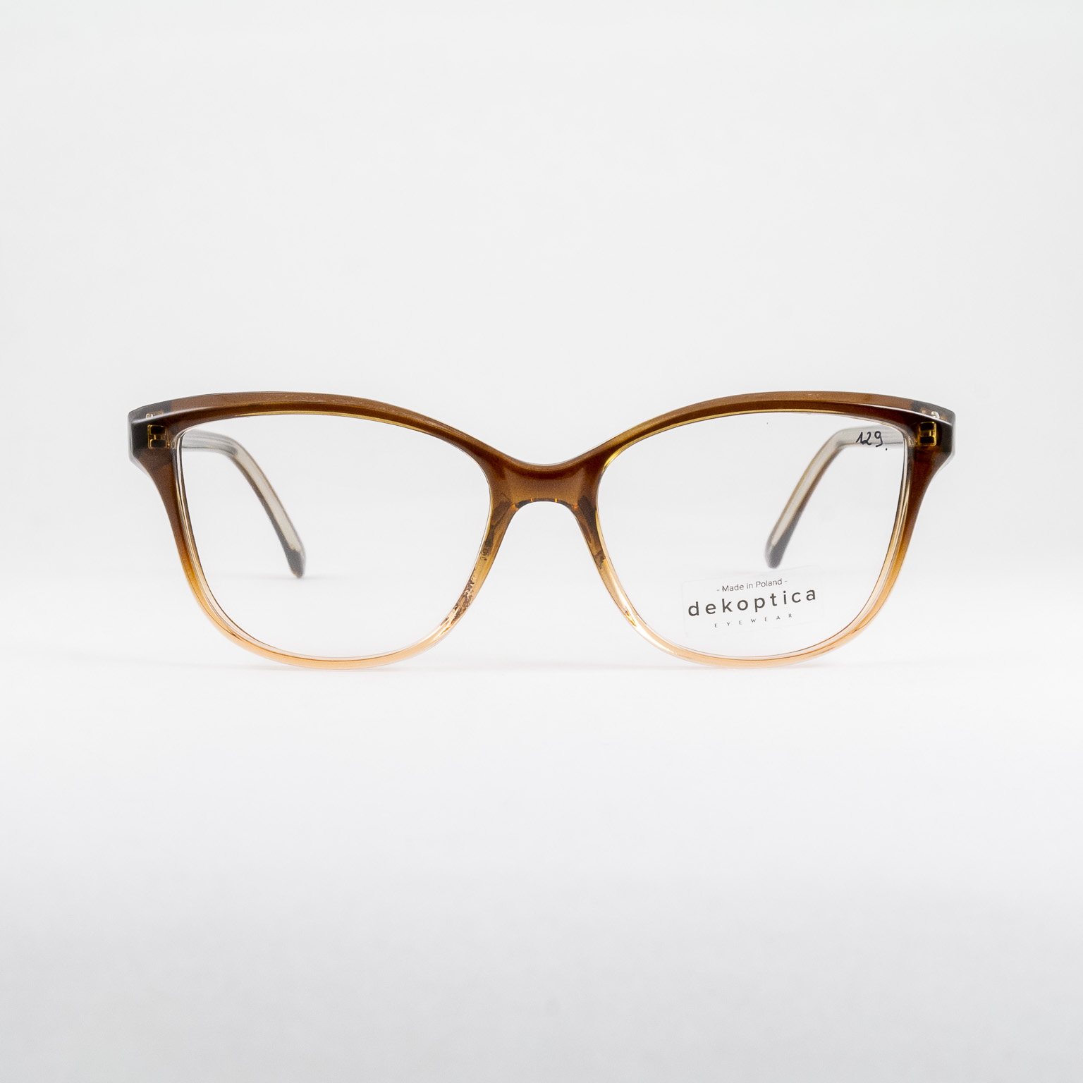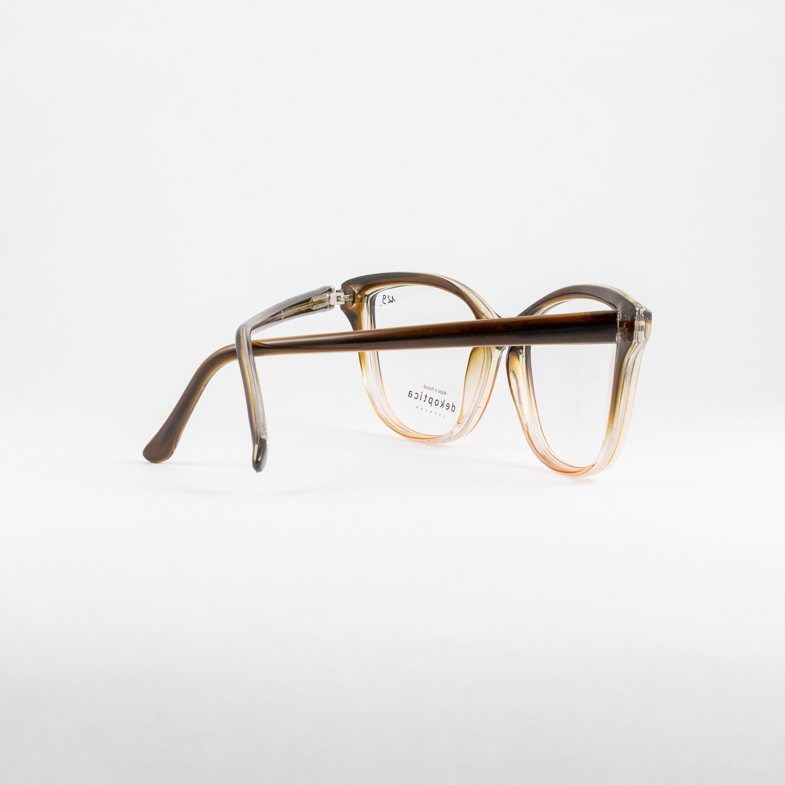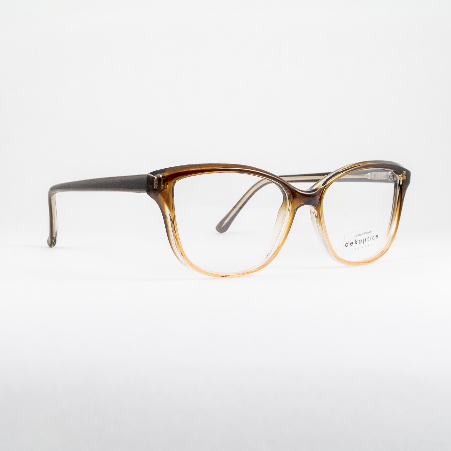 Oprawki damskie z tworzywa sztucznego od polskiej marki Dekoptica. Górna część frontu w ciemnym brązie, dolna część w beżu. Zauszniki w ciemnym brązie. Tarcze w kobiecym kształcie motyla.