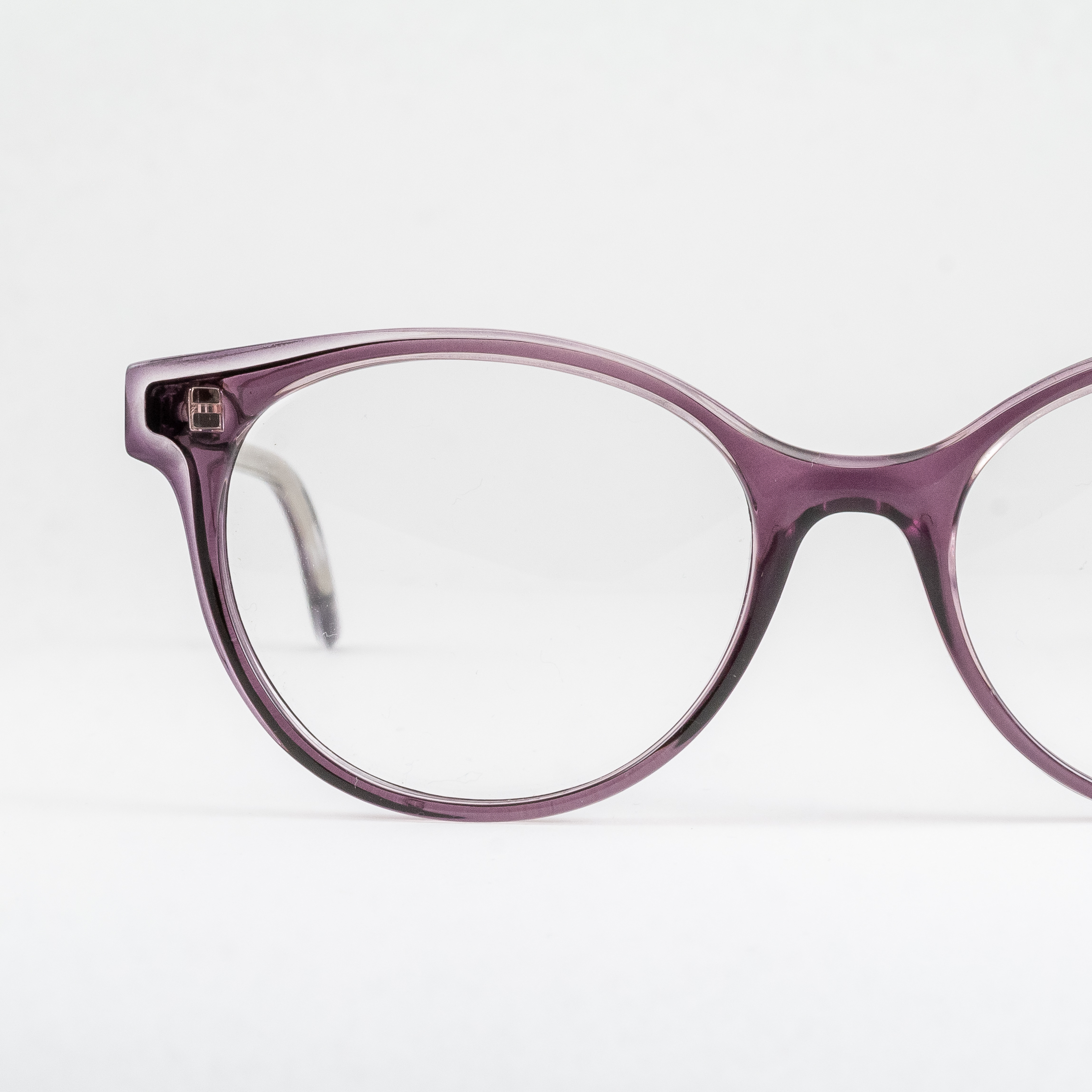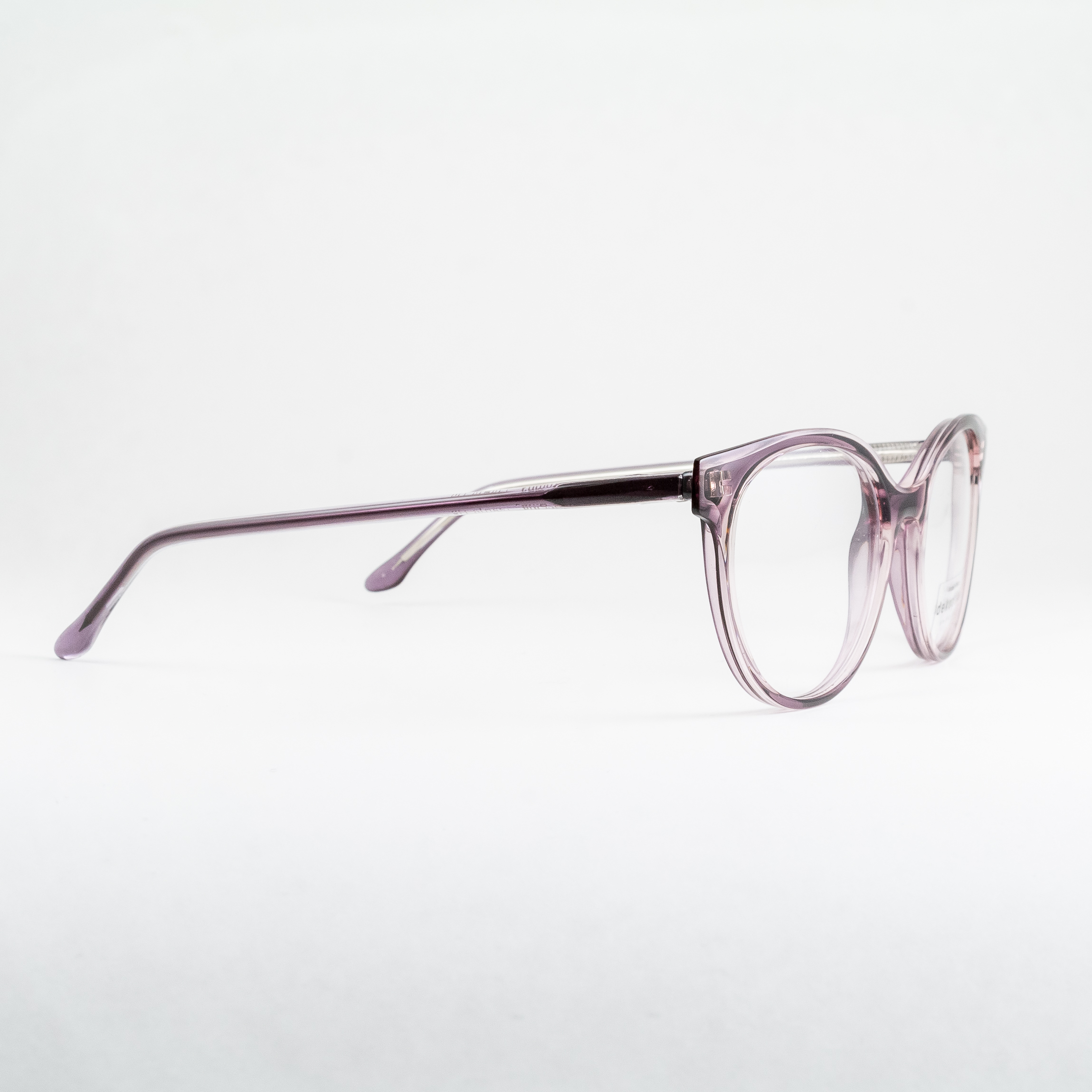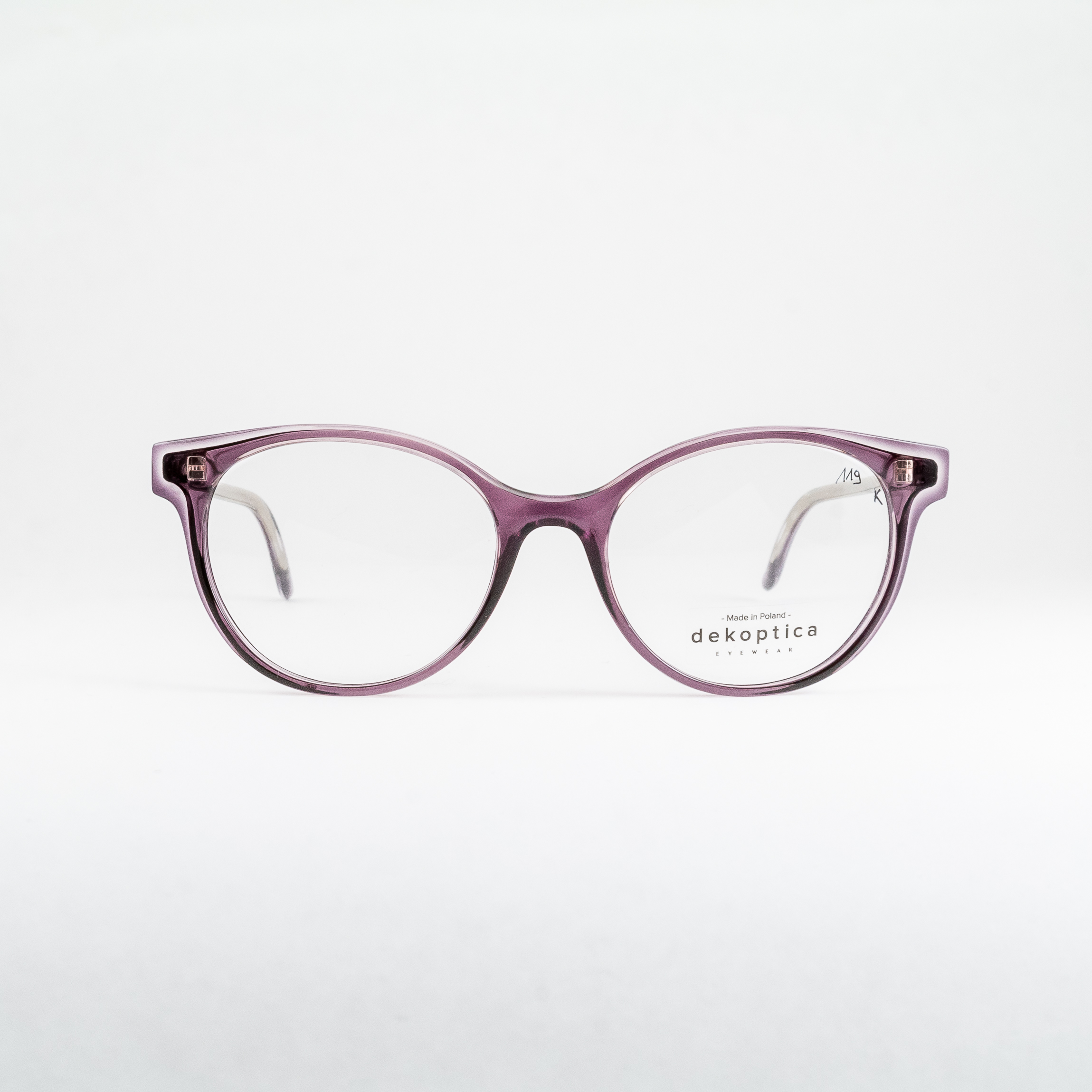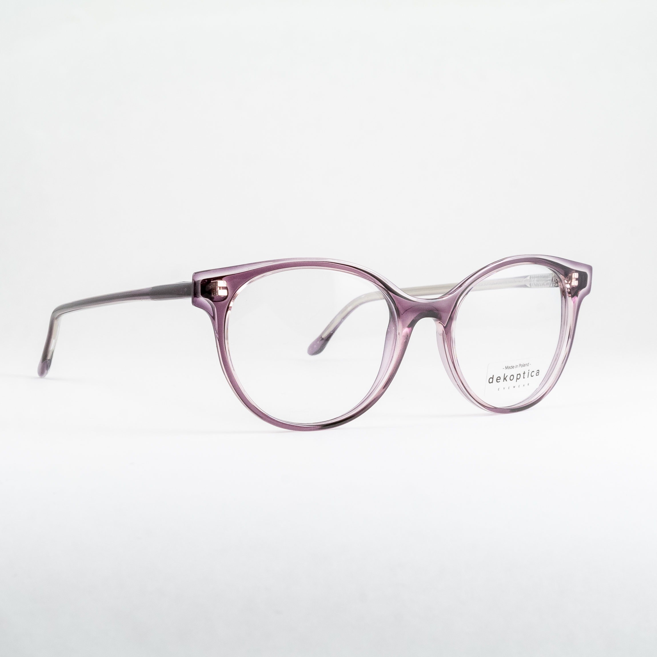 Plastikowe oprawki damskie od polskiego producenta Dekoptica. Owalne tarcze, lekko obniżony mostek skutkuje podniesioną linią brwi. Oprawa w niezwykłym, niejednoznacznym kolorze: producent opisuje go jako szary/nude, oooczy widzą tu jeszcze domieszkę fioletu. Semi-transparentna warstwa płyty na froncie daje ciekawy efekt – szczególnie względem widocznego, odmiennego kształtu ukrytego pod nią.