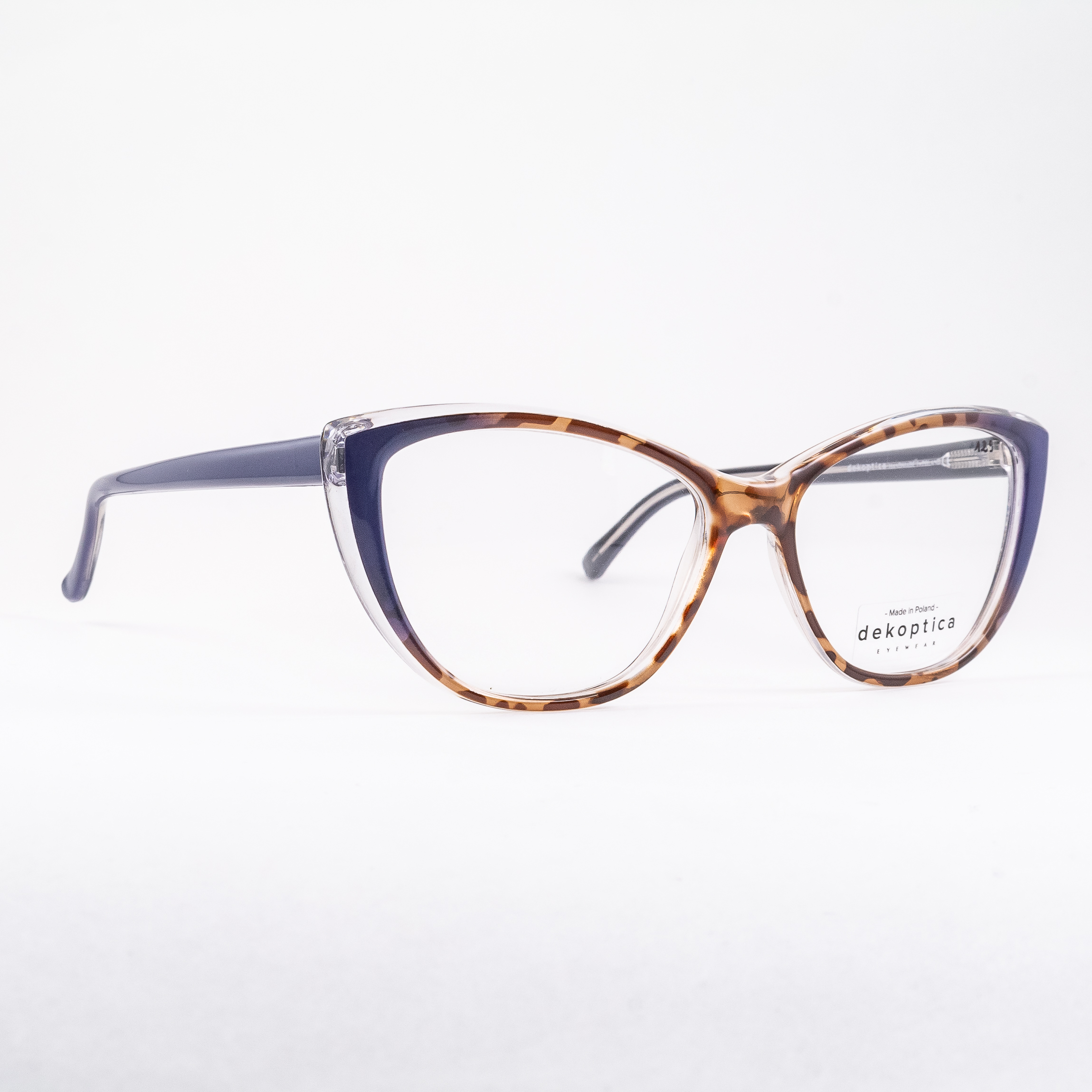 Plastikowe oprawki damskie od polskiego producenta Dekoptica. Tarcze wyciągnięte w kocie oczy. Na przodzie dominuje pół-przezroczysty szylkret. Brzegi tarcz i zauszniki w pastelowym kolorze ciemnoniebieskim. Cały front podbity transparentną warstwą płyty.