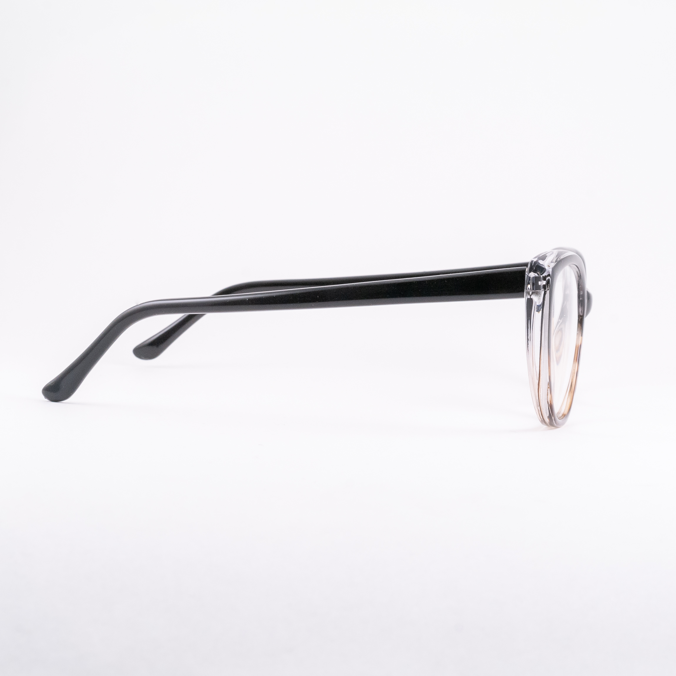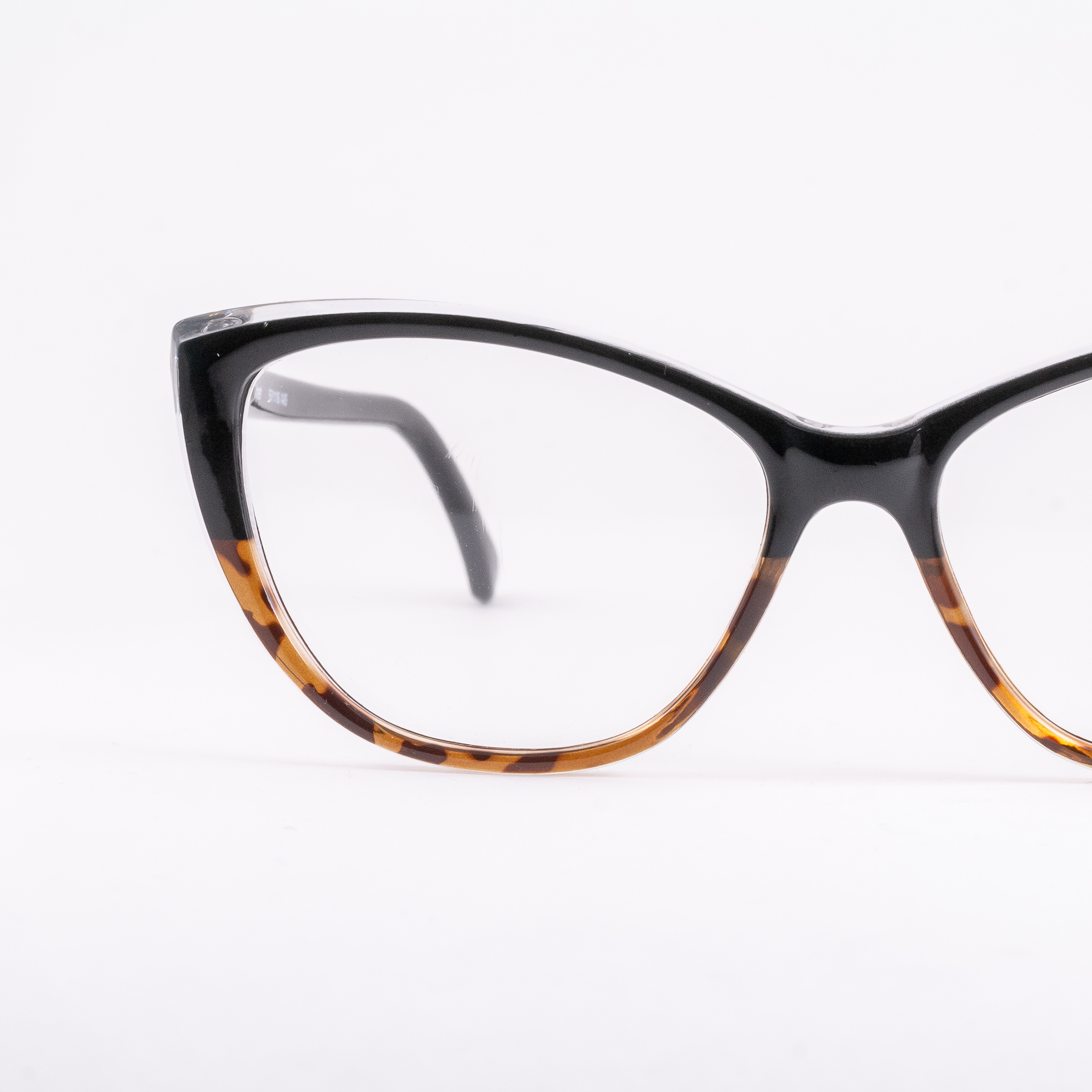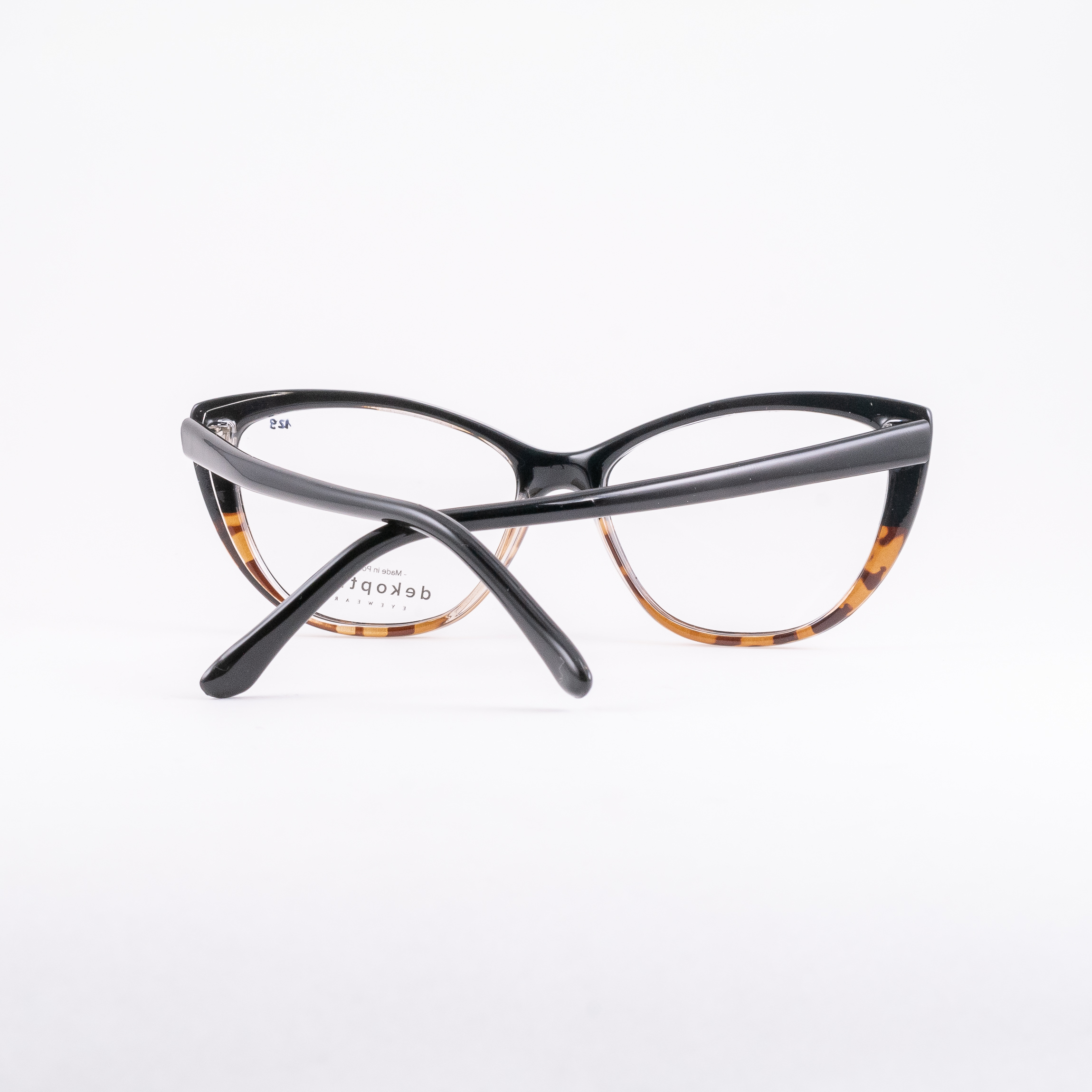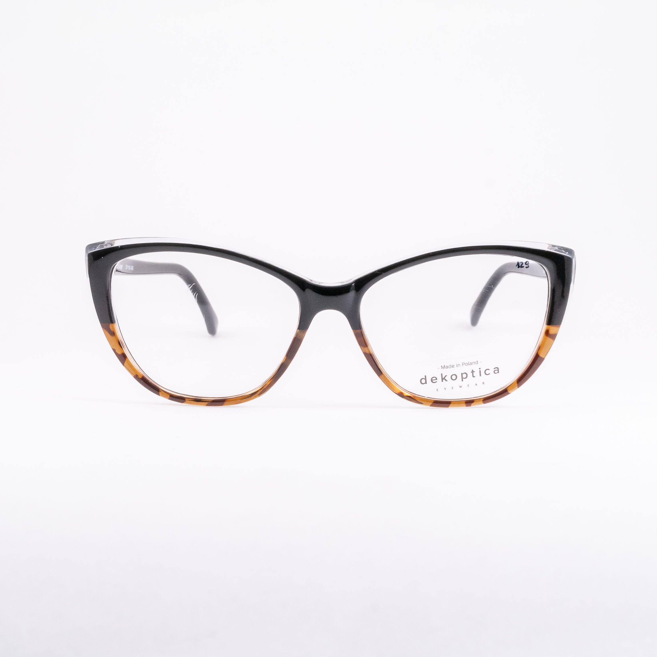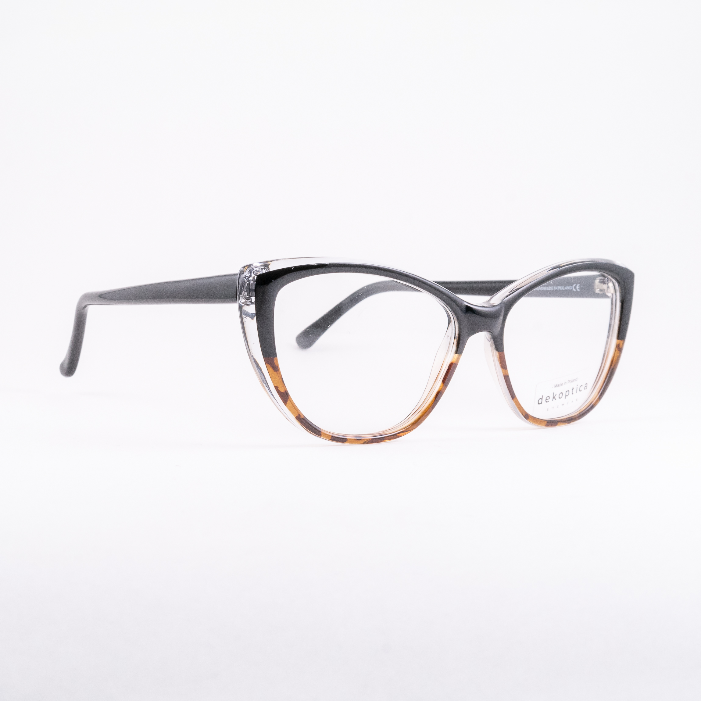 Plastikowe oprawki damskie od polskiego producenta Dekoptica. Tarcze wyciągnięte w kocie oczy. Dominuje kolor czarny, na froncie od dołu szylkret (kolor brązowy).