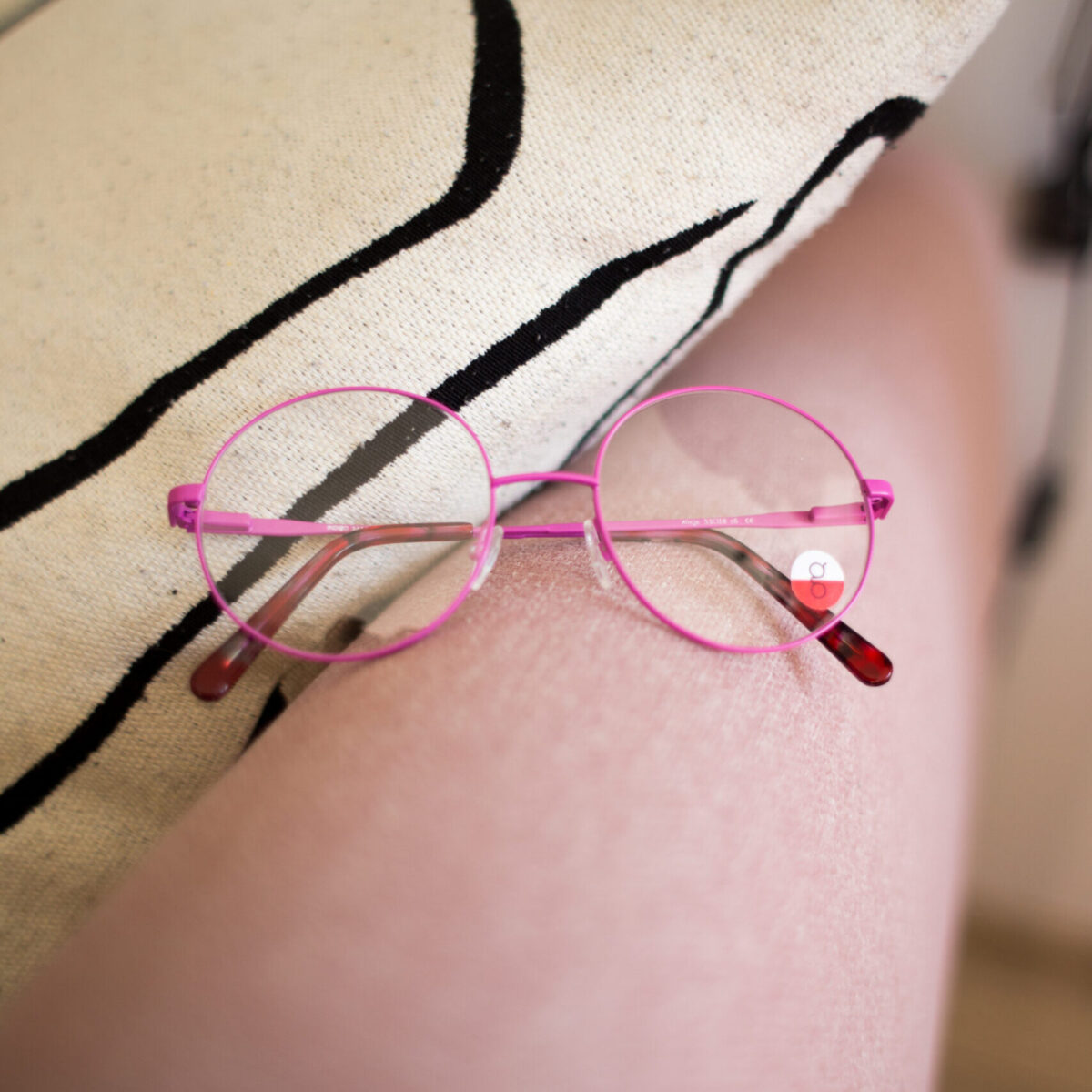 Metalowe oprawki damskie z polskiej manufaktury Indigo. Okrągłe tarcze, całość w kolorze różowym. Zawiasy typu flex sprzyjają komfortowi noszenia i dłuższemu życiu okularów.