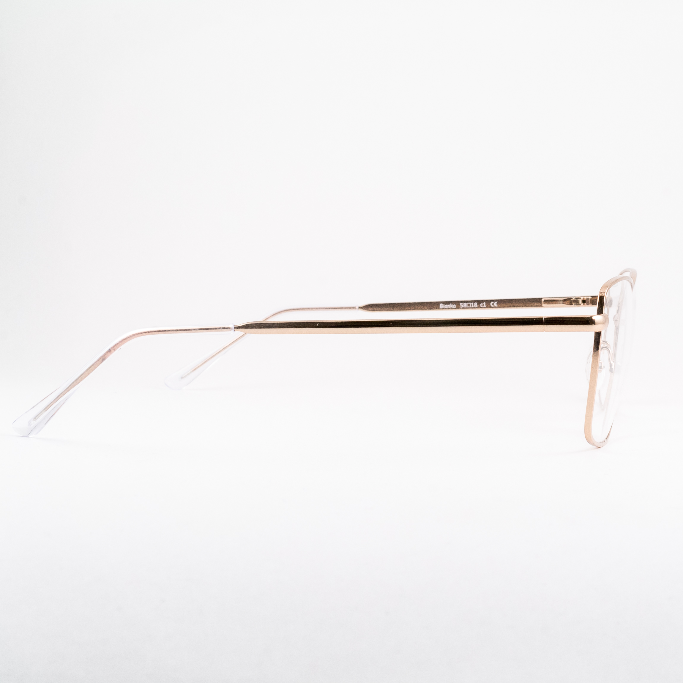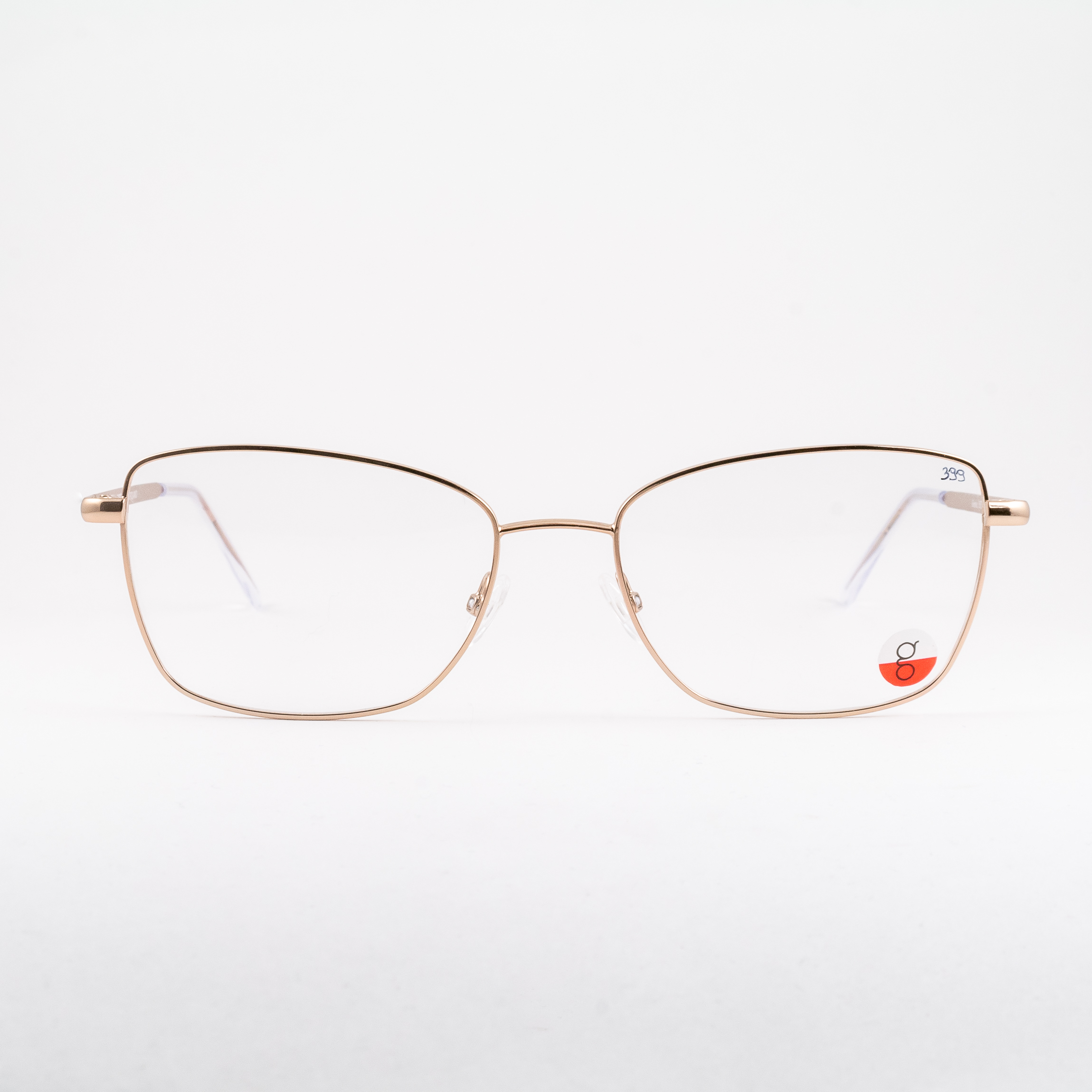 Metalowa oprawa damska od polskiej marki Indigo. Subtelne kocie oczy ze ściętym dołem tarcz. Całość w błyszczącym złocie. Transparentne tworzywo na zakończeniach zauszników i zawiasy typu flex sprzyjają komfortowi noszenia.