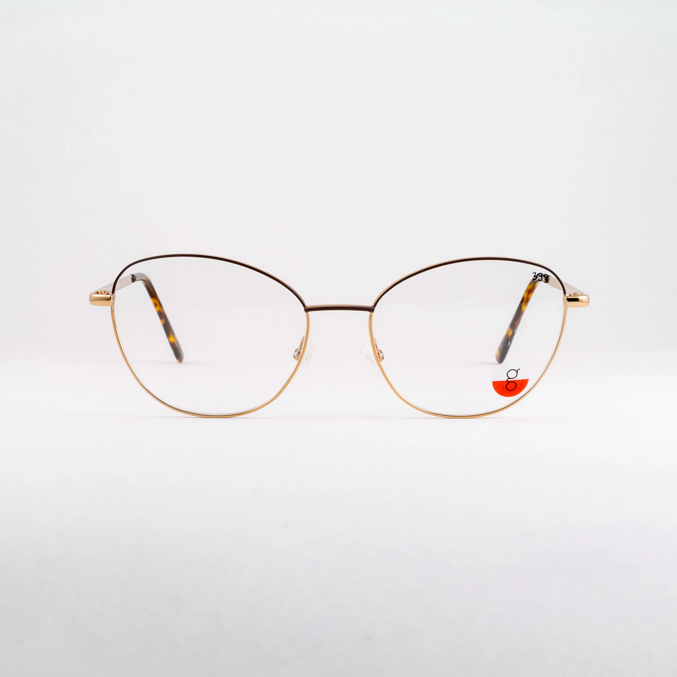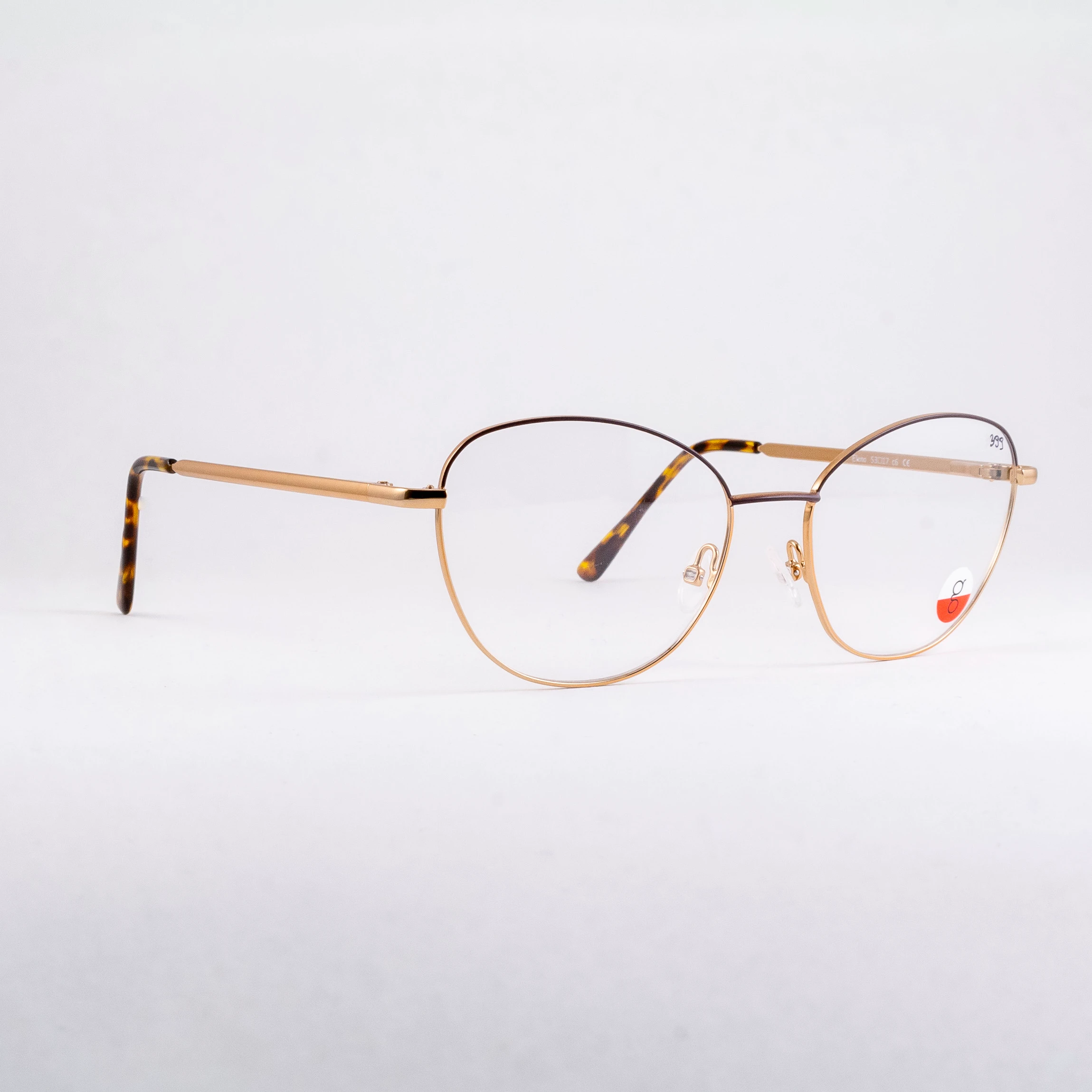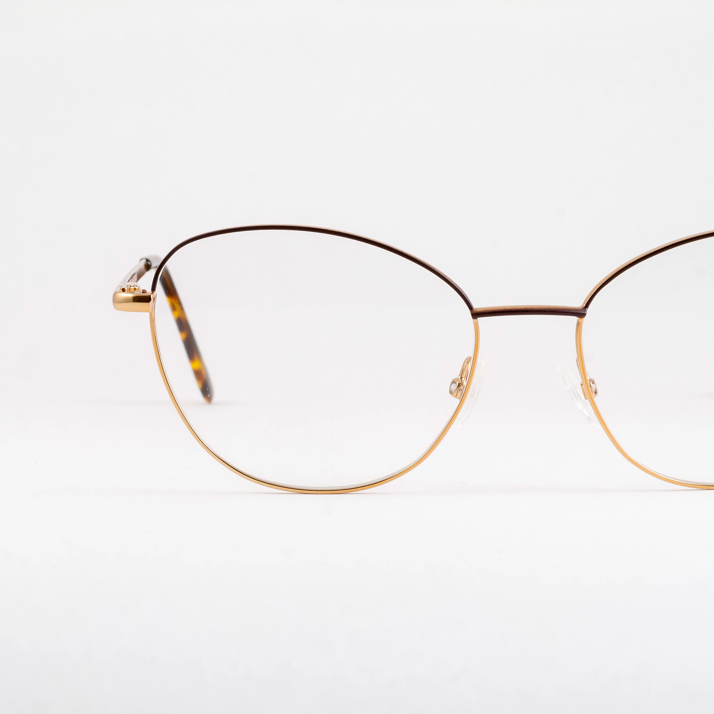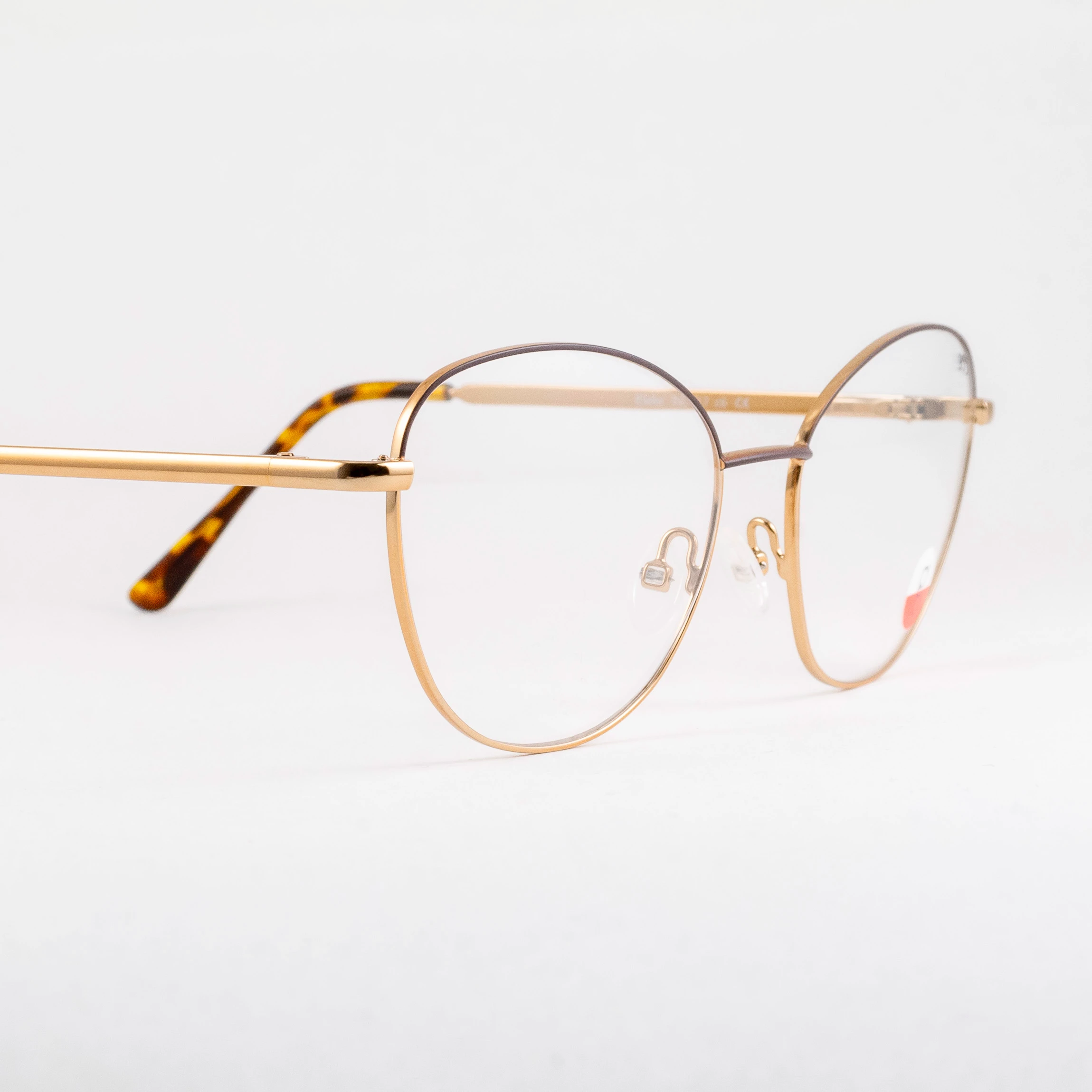 Metalowe oprawki damskie z polskiej manufaktury Indigo. Subtelne kocie oczy w uniwersalnych proporcjach. Górna część frontu wraz z mostkiem w kolorze brązowym. Reszta oprawy miedziana, połyskująca. Tworzywo na zakończeniach zauszników w chłodno-ciepłym szylkrecie. Zawiasy typu flex sprzyjają komfortowi noszenia.