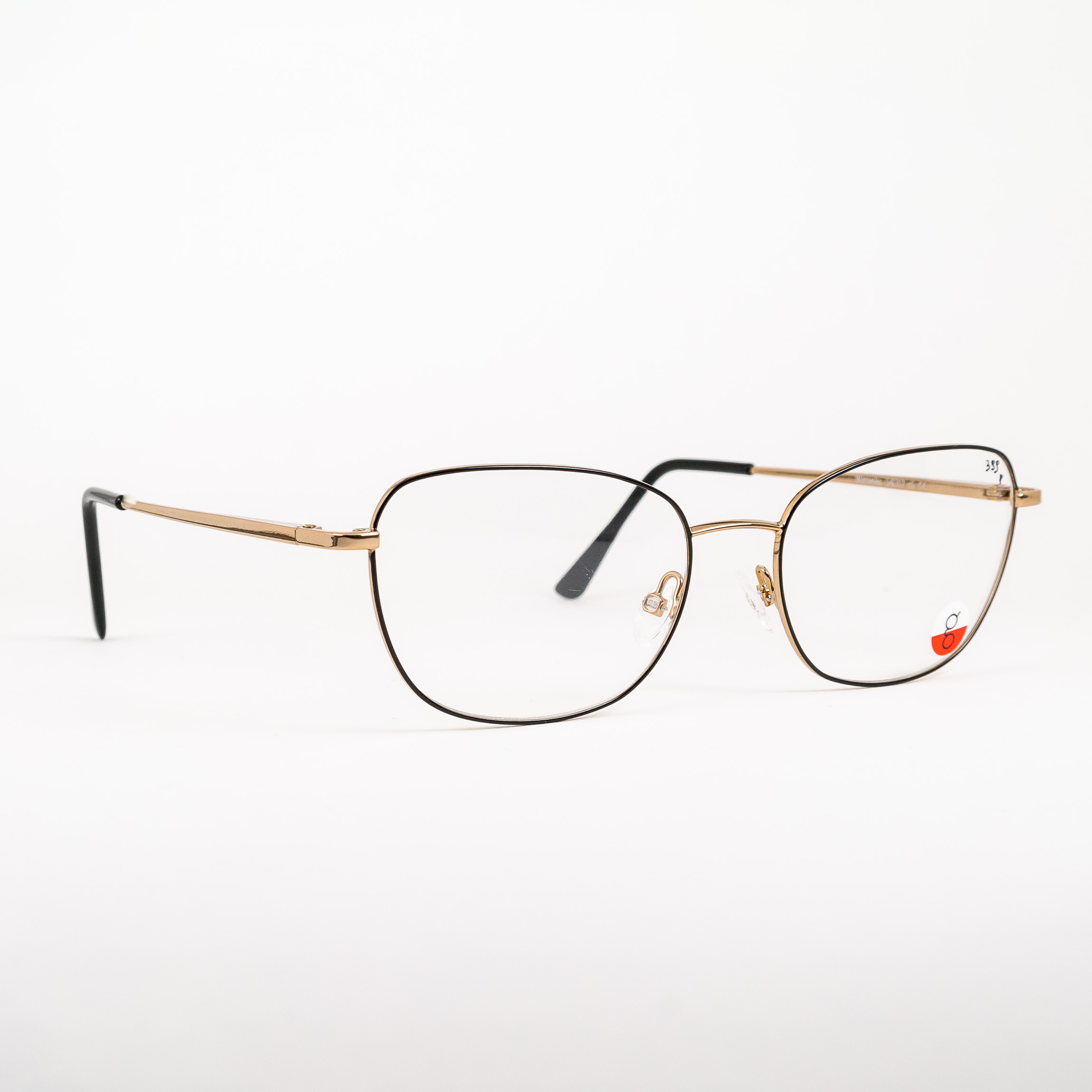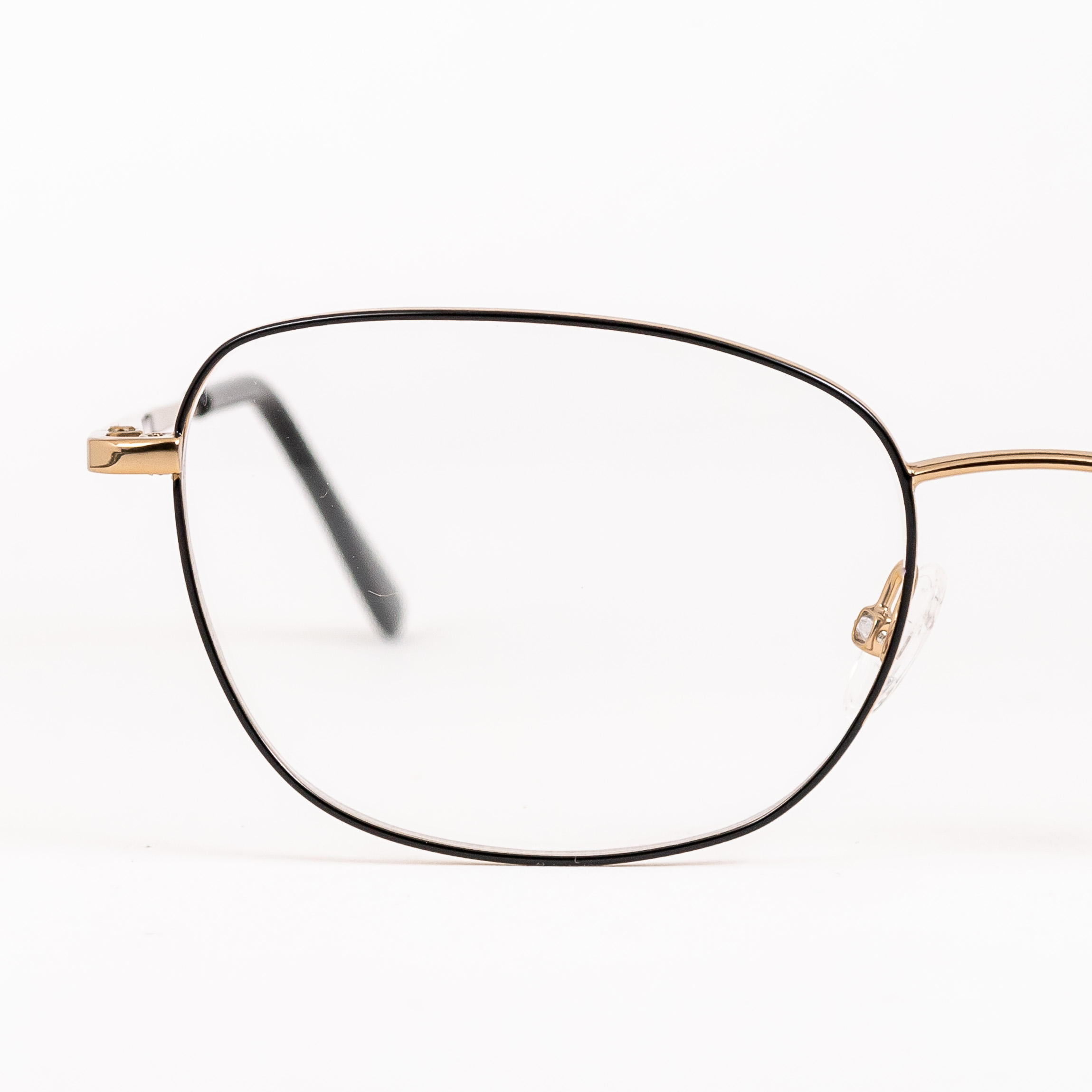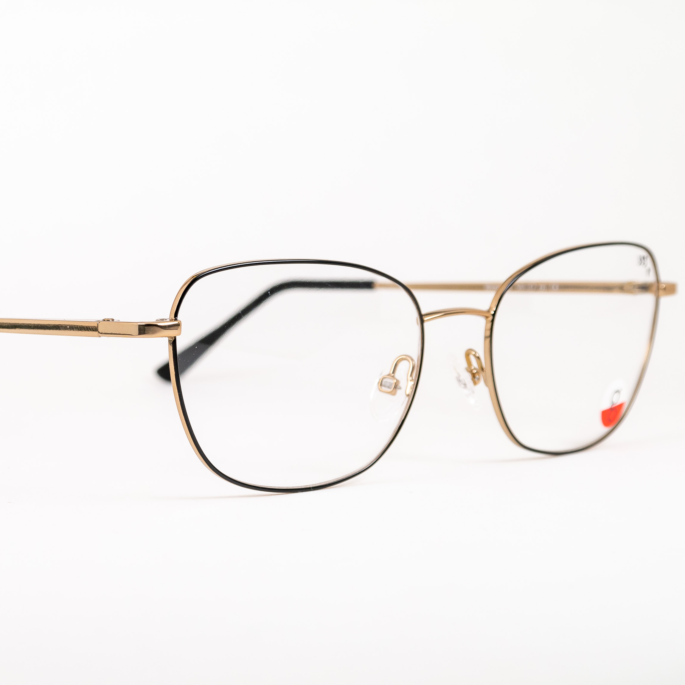 Metalowe oprawki damskie od polskiej manufaktury Indigo. Subtelne kocie oczy w uniwersalnych proporcjach. Tarcze od frontu w klasycznej czerni. Mostek, zauszniki i wnętrze oprawy w ciemnym złocie. Czarne tworzywo na zakończeniach zauszników i zawiasy typu flex sprzyjają komfortowi noszenia.