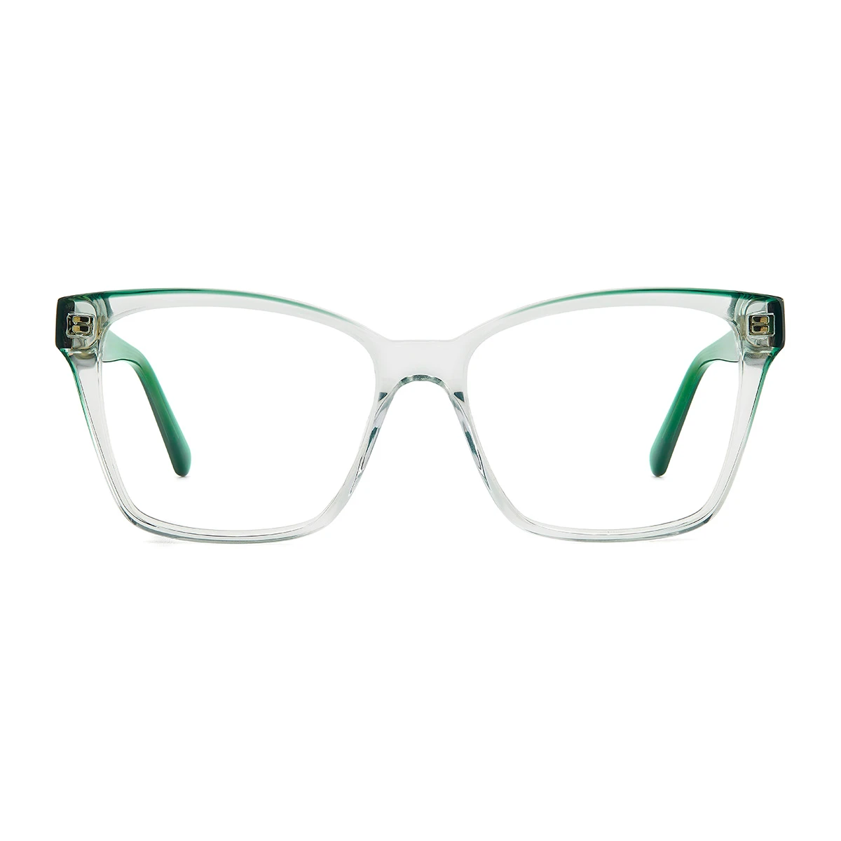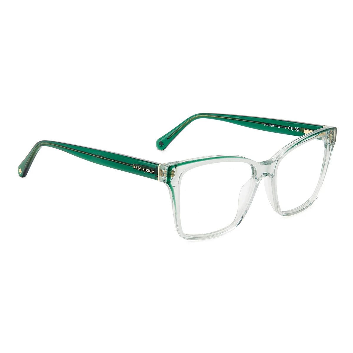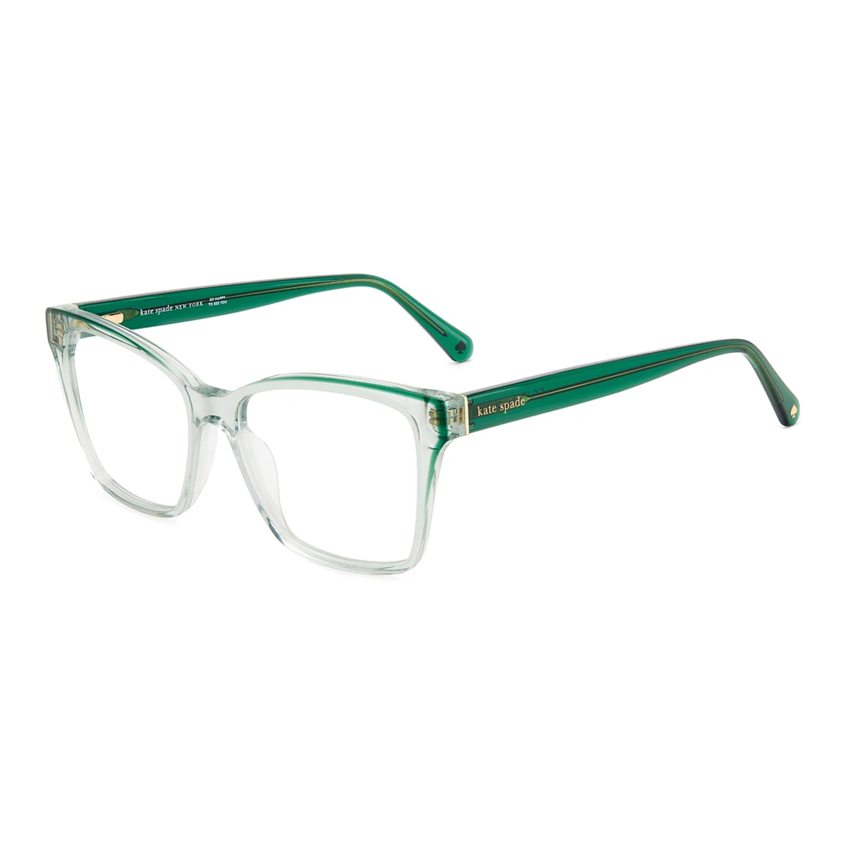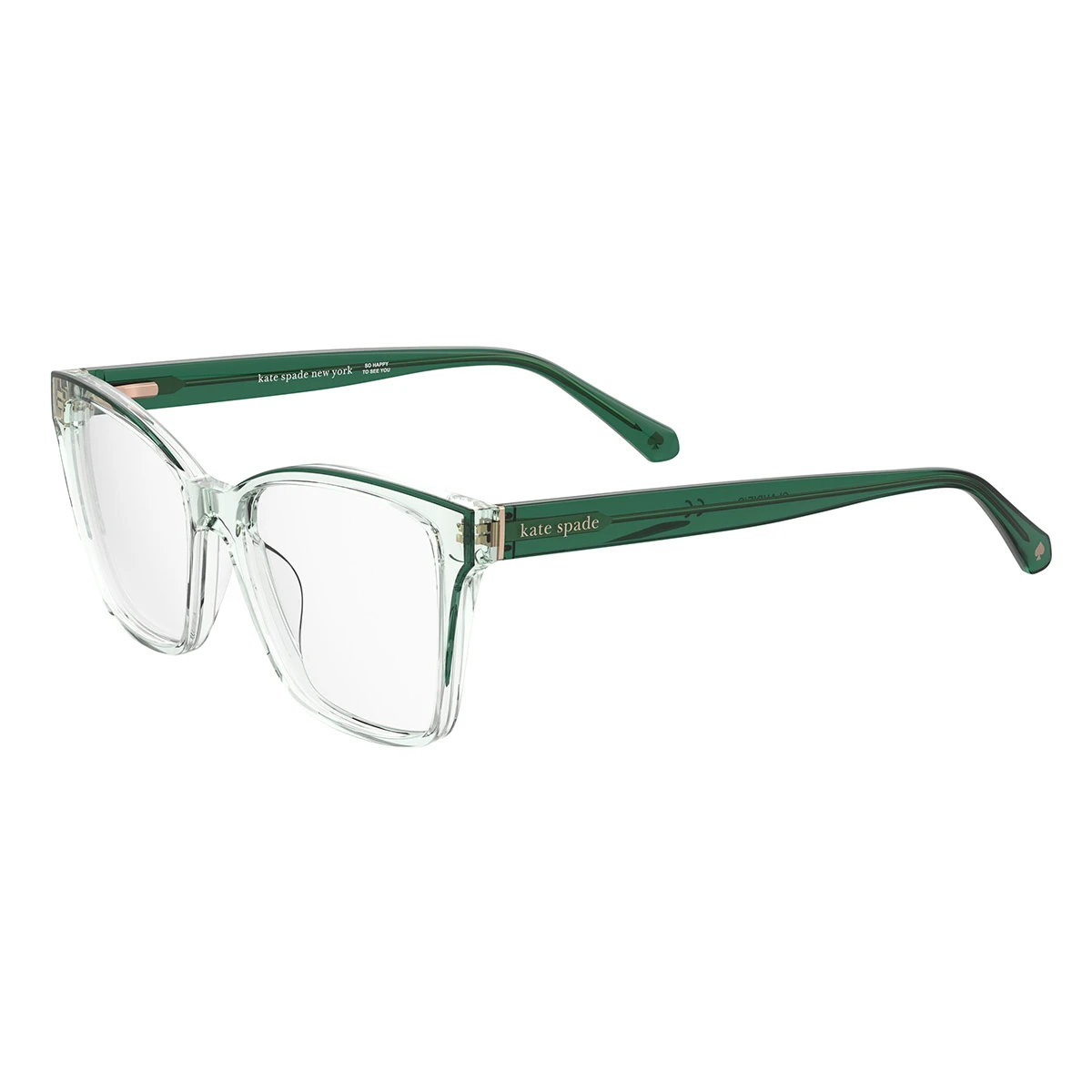 Damskie oprawki Kate Spade w kształcie kocich oczu. Wykonane z transparentnego acetatu – front w odcieniu jasnej, rozbielonej zieleni. Zauszniki w głębokim, butelkowym odcieniu zieleni, który wkrada się na krańce frontu. Delikatne złote logo Kate Spade przy zawiasach.