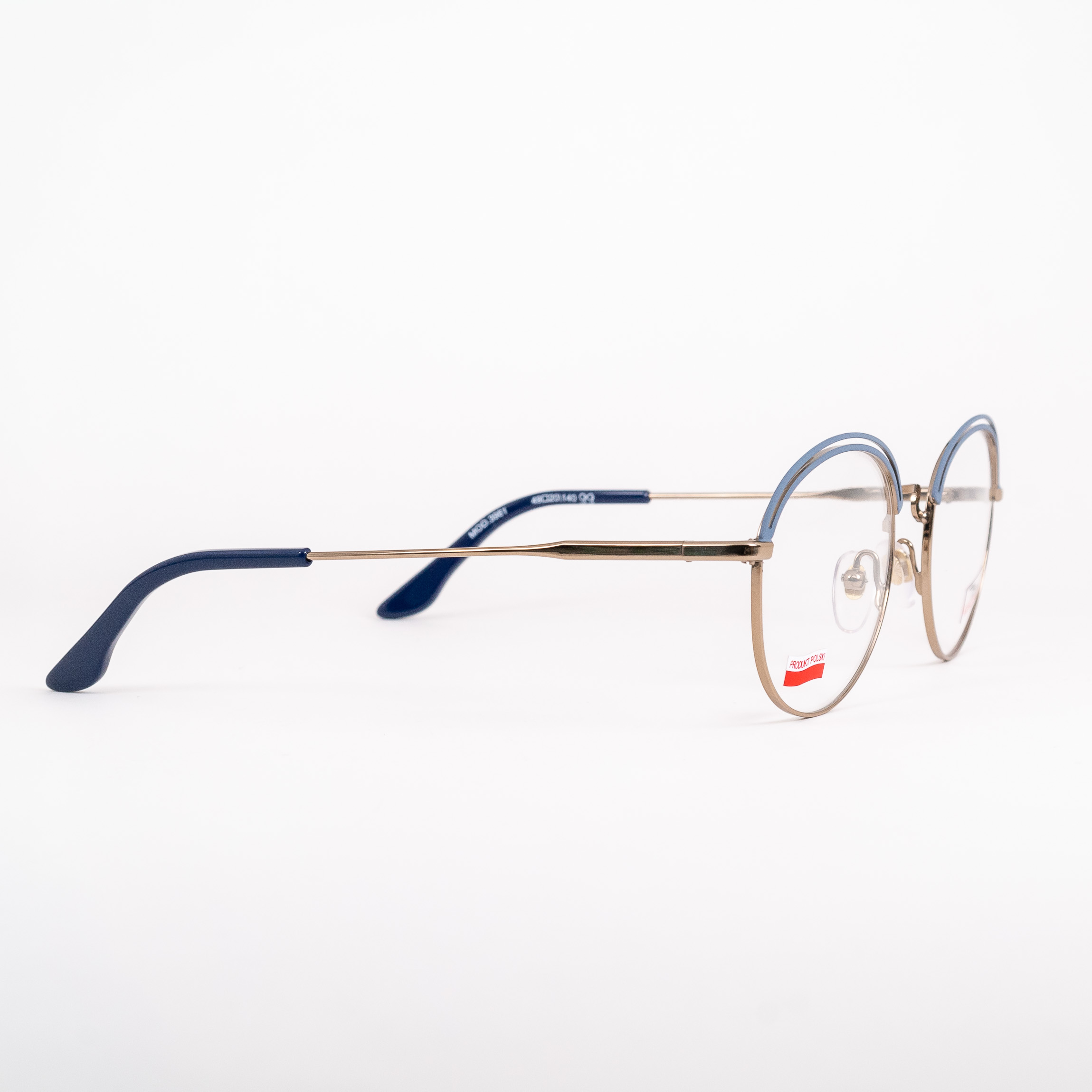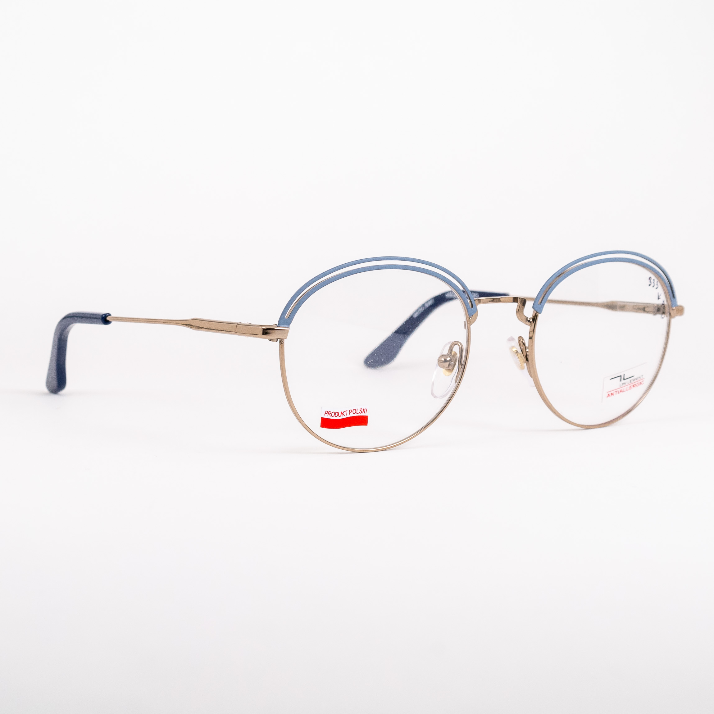 Ciekawe oprawki damskie o owalnych tarczach, od polskiej marki Liw Lewant. Dominujący metal w jasnej miedzi, plastikowe zakończenia zauszników w granacie. Nad tarczami intrygujące, szaro-błękitne elementy.