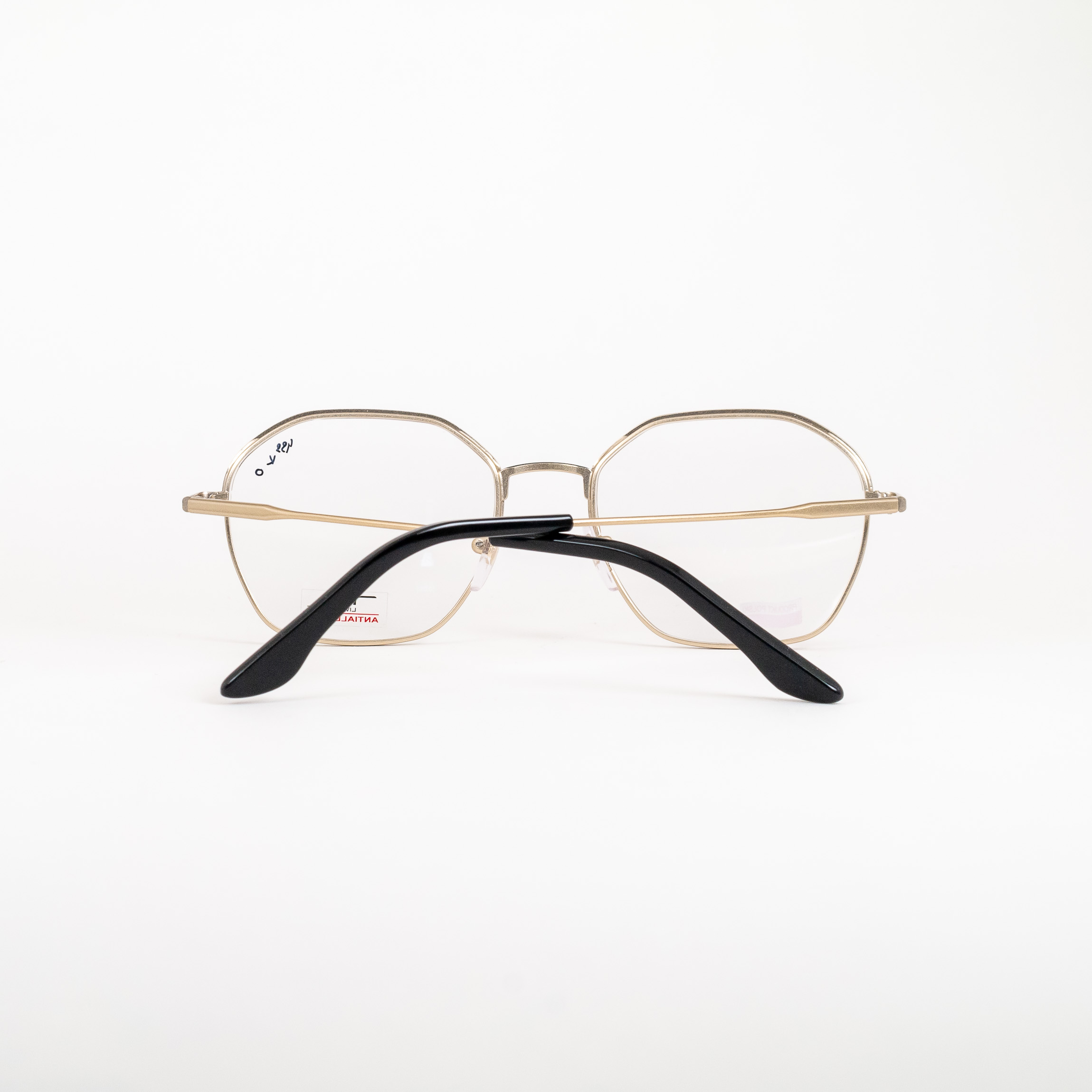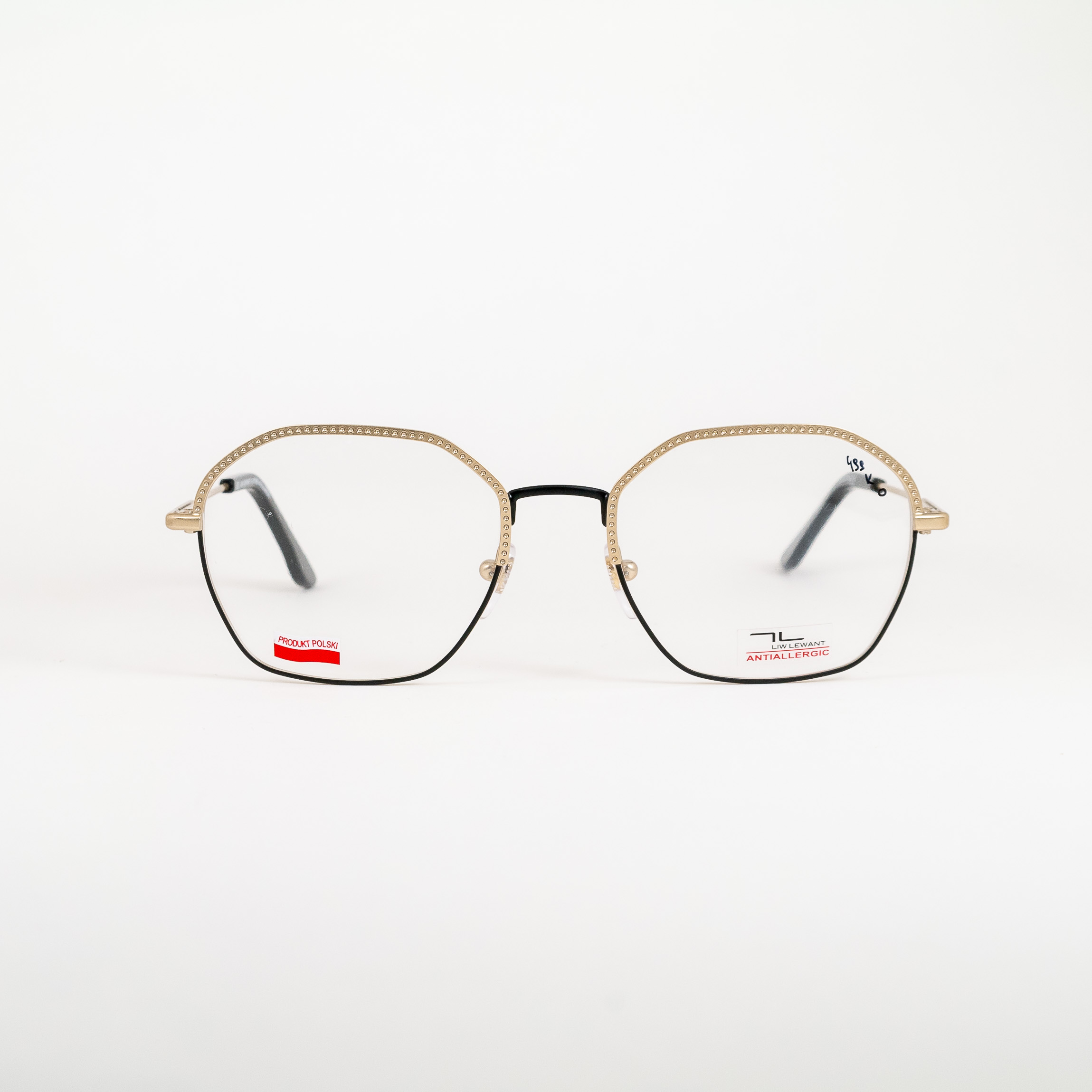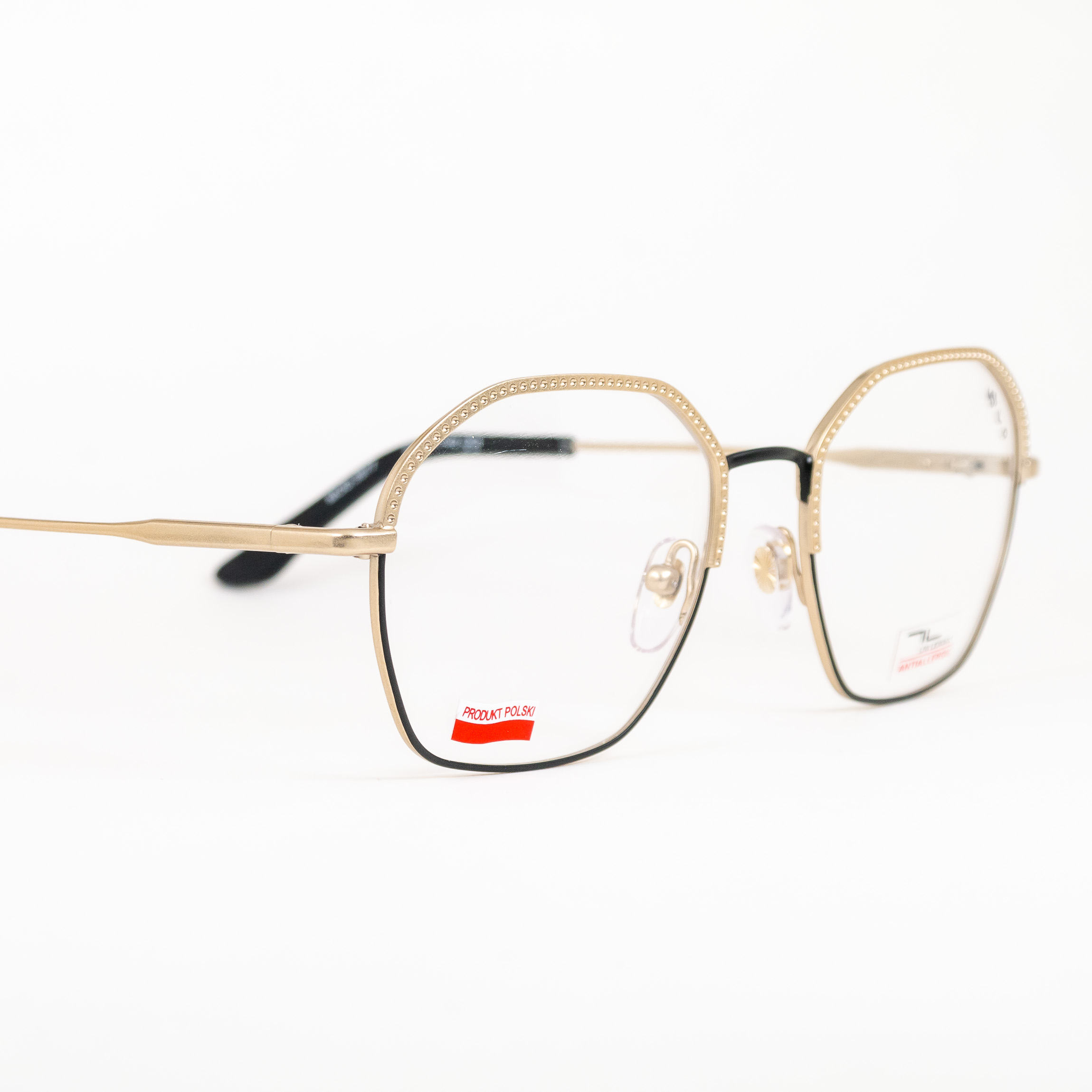 Metalowe oprawki damskie polskiej marki Liw Lewant. Tarcze w kształcie zaokrąglonego sześciokąta z ciekawym zdobieniem na ich górnej części. Na całej oprawie dominuje barwa białego złota. Dolna część tarcz, mostek i plastikowe zakończenia zauszników w czerni.