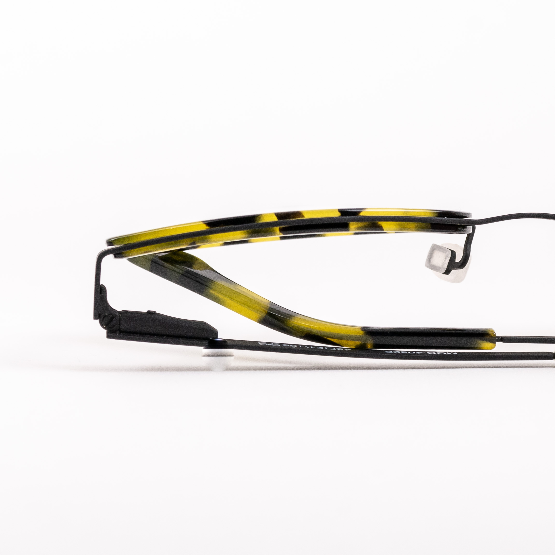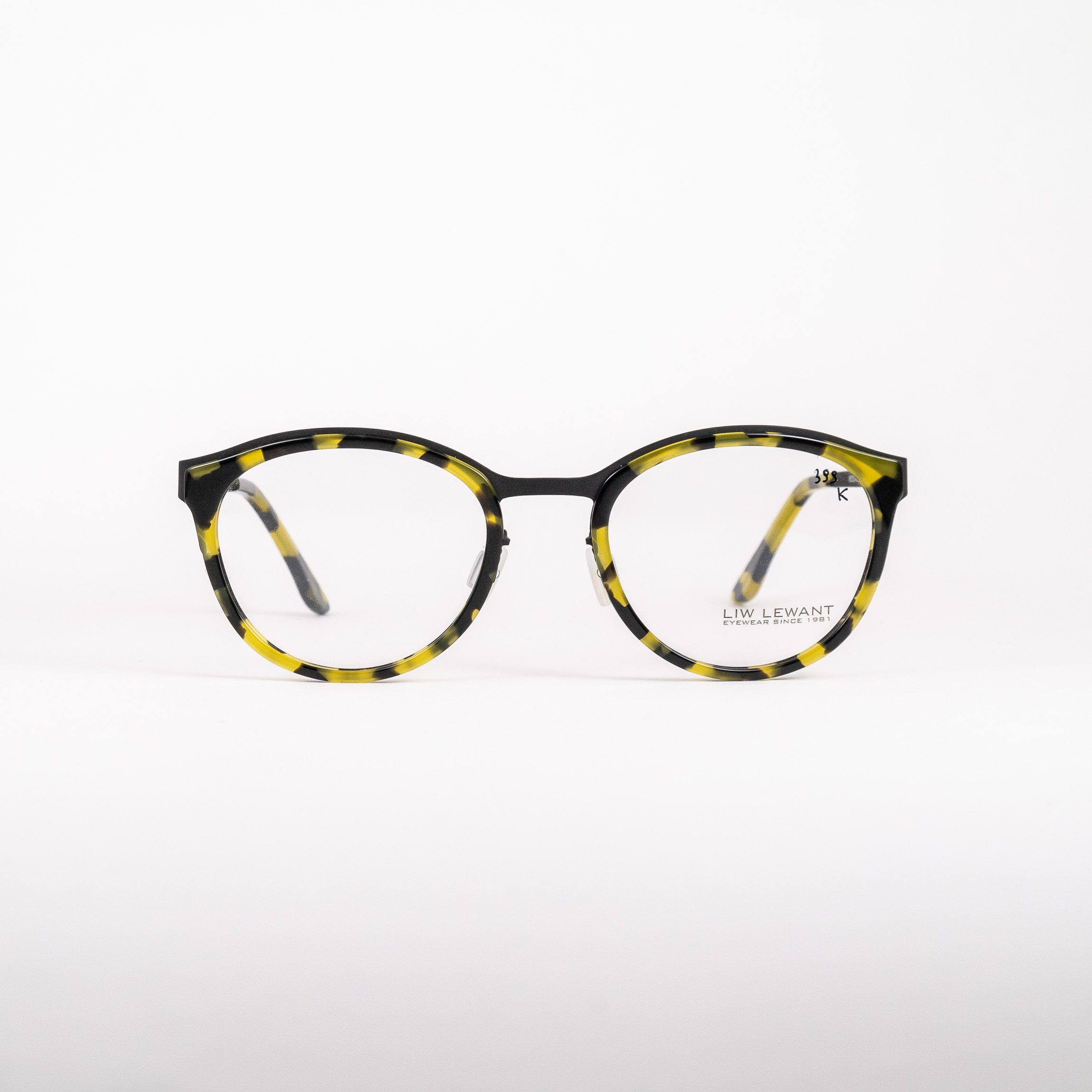 Oprawki z łączonych materiałów o owalnych tarczach, od największego polskiego producenta opraw okularowych – marki Liw Lewant. Metalowy mostek przechodzący nad tarczami w zauszniki w matowej czerni. Podwieszone tarcze z tworzywa i zakończenia zauszników w jasnym szylkrecie łączącym czerń i lekko transparentny, jasny miód.