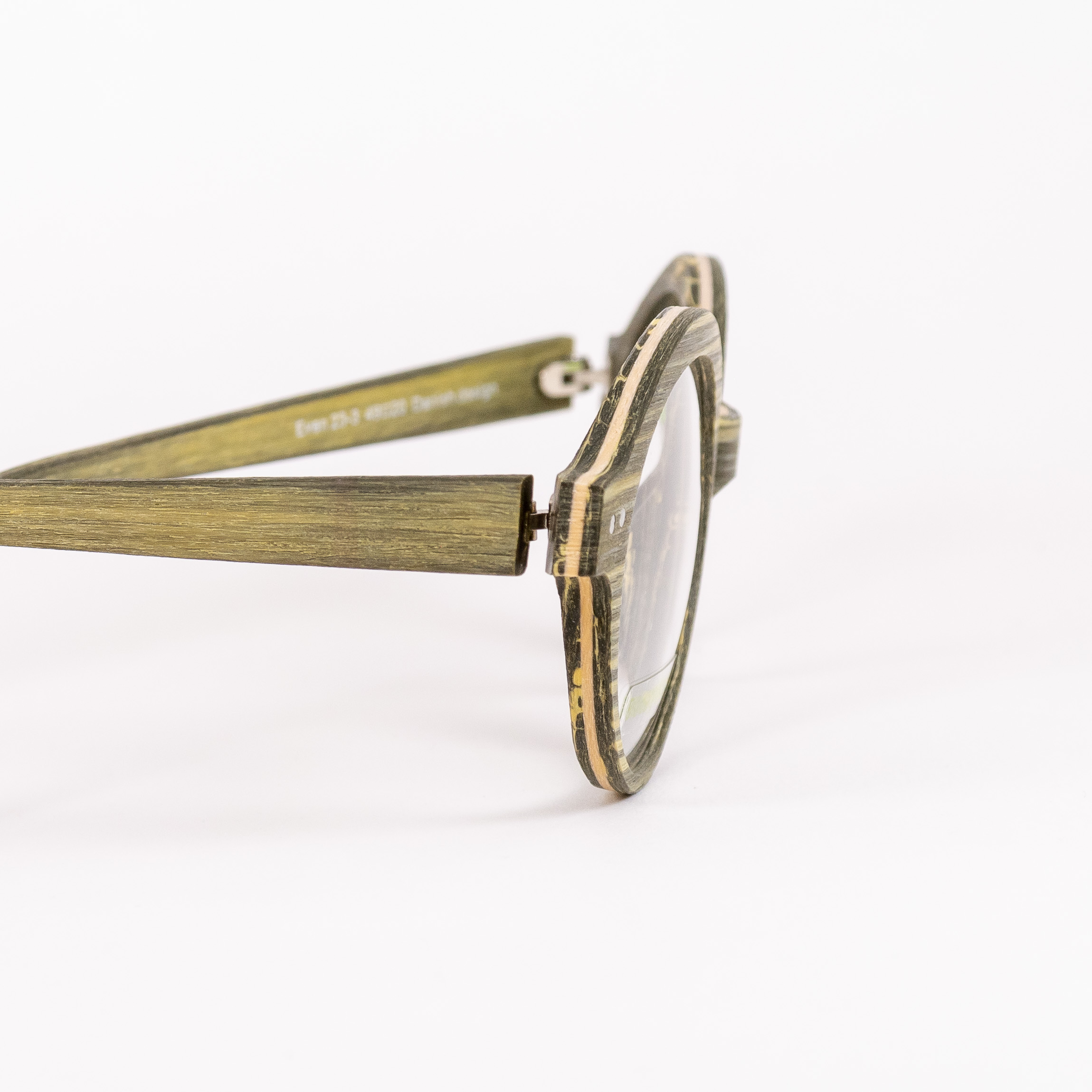 Całość w melanżu naturalnych barw – oliwkowy, beż, szarość. Owalne tarcze, jasne obramowanie frontu, matowa faktura. Po bokach tarcz subtelne, srebrne wstawki, na lewym zauszniku logo marki, oryginalne zakończenia zauszników z dziurką.