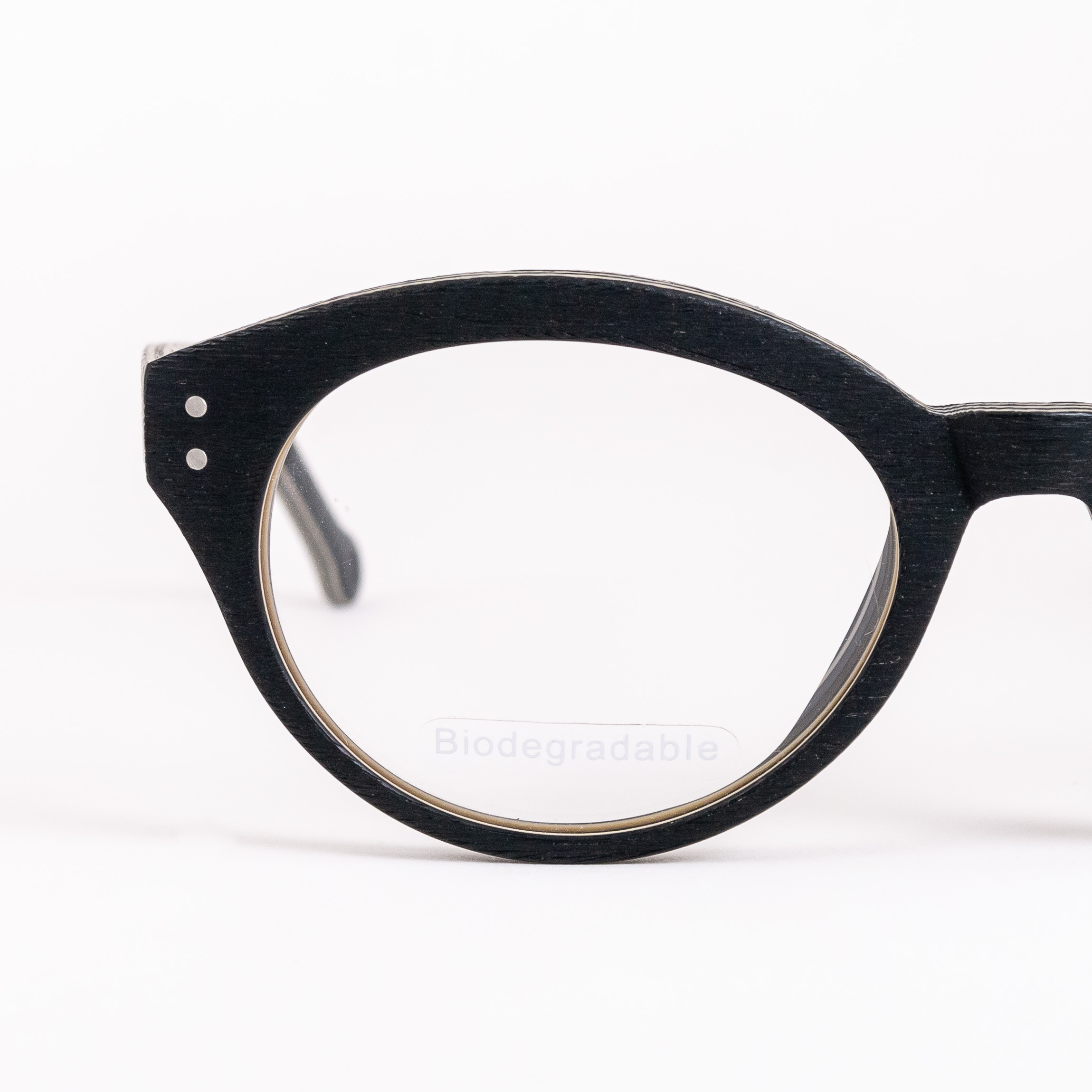 Owalne tarcze z wyciągniętą linią brwi. Zewnętrzna powierzchnia w matowej czerni imitująca w dotyku drewno. Jasne obramowanie, logo marki na lewym zauszniku, oryginalne zakończenia zauszników z dziurką.