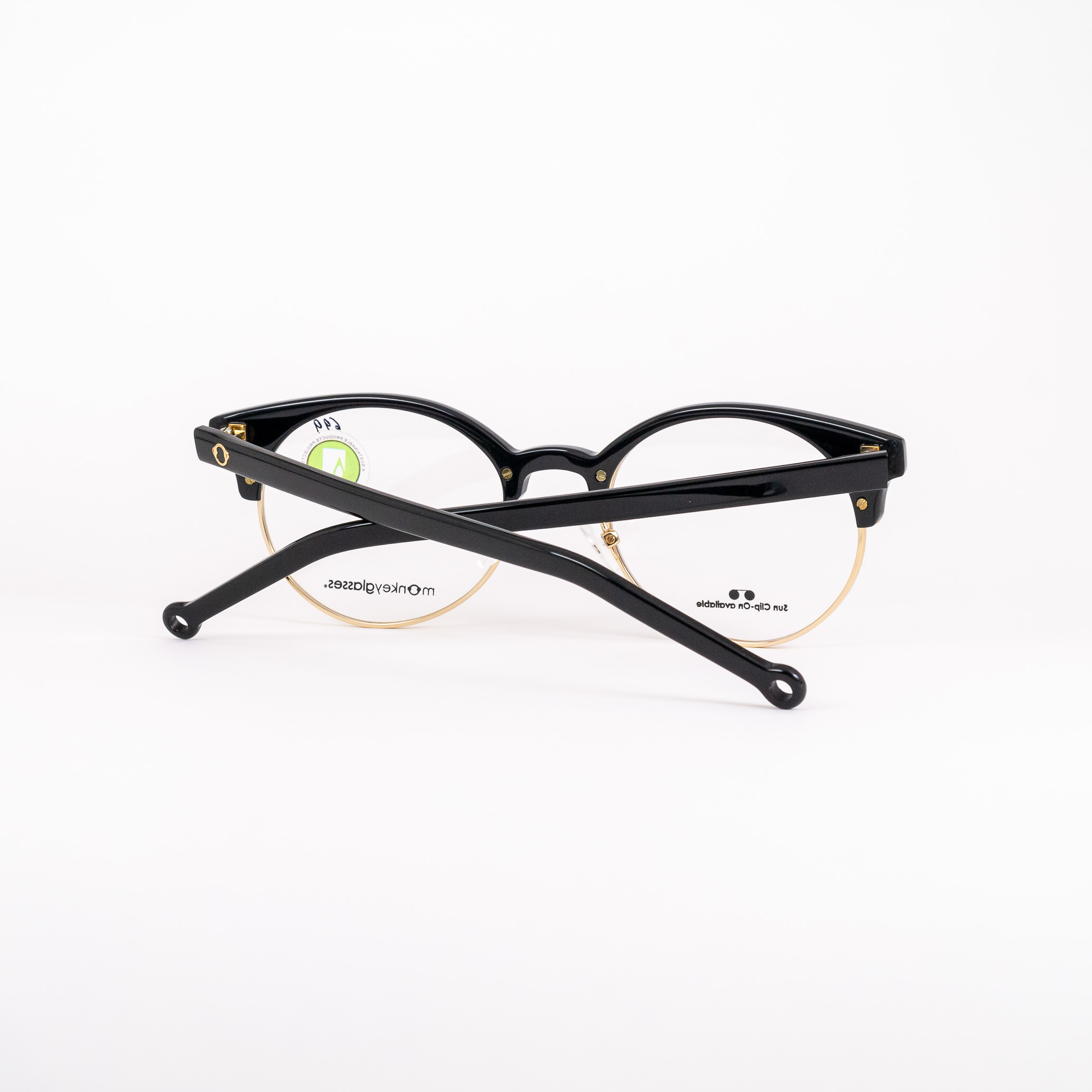 Górna część frontu i zauszniki w czarnym plastiku, na dole tarcz złoty metal. Subtelne, złote elementy po bokach na froncie, nanośniki, oryginalne zakończenia zauszników z dziurką.