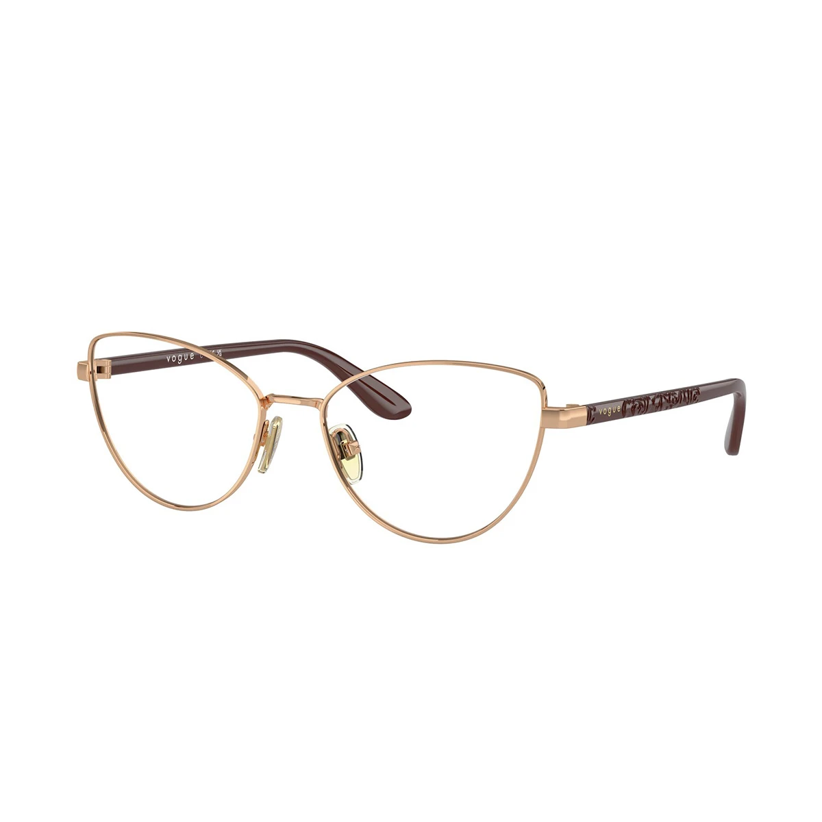 Oprawki damskie marki Vogue. Metalowy front w ciepłym kolorze złotym. Tarcze w kształcie kociego oka. Zauszniki wykonane z tworzywa w kolorze czekoladowym – z subtelnymi zdobieniami i logo Vogue przy zawiasach. Silikonowe nanośniki zapewniają komfortowe dopasowanie.
