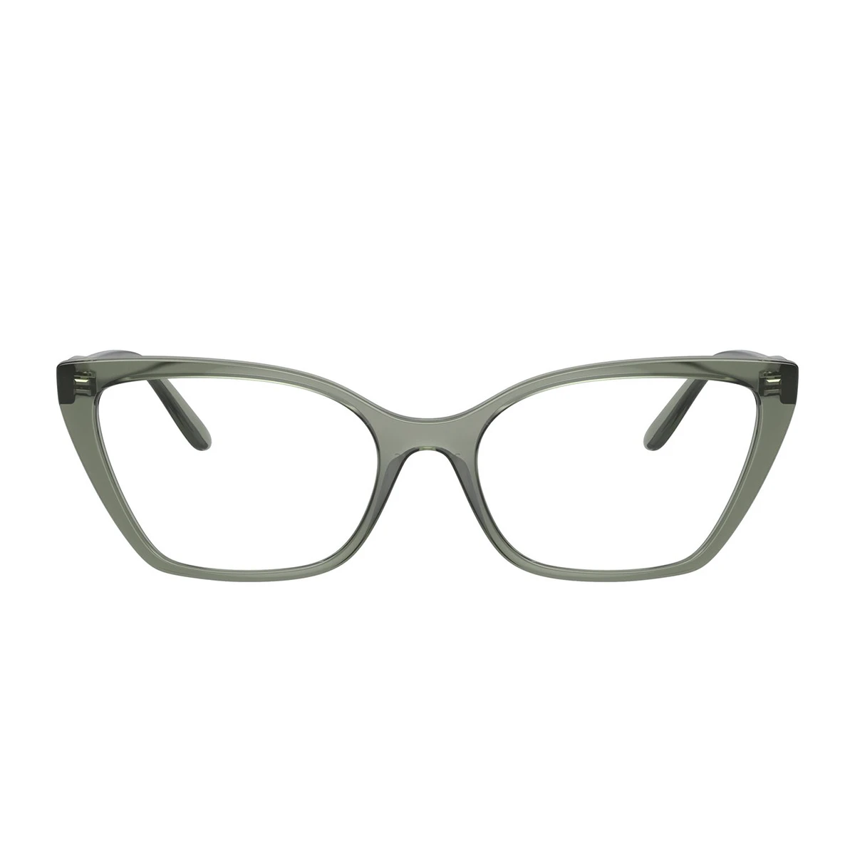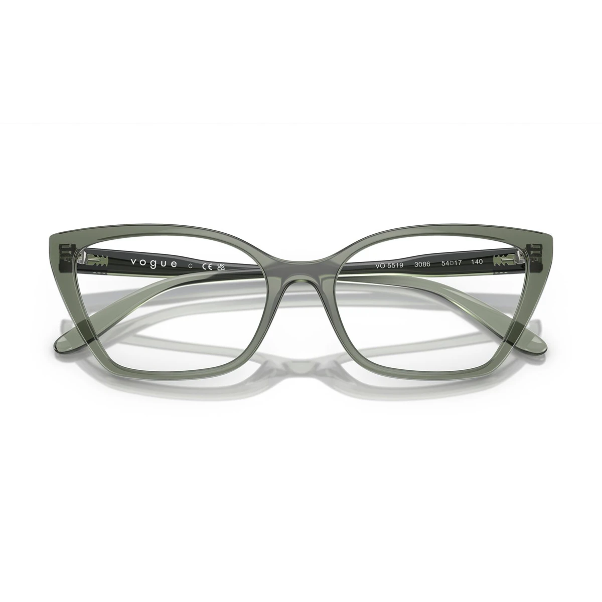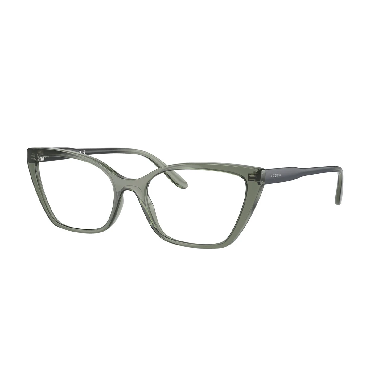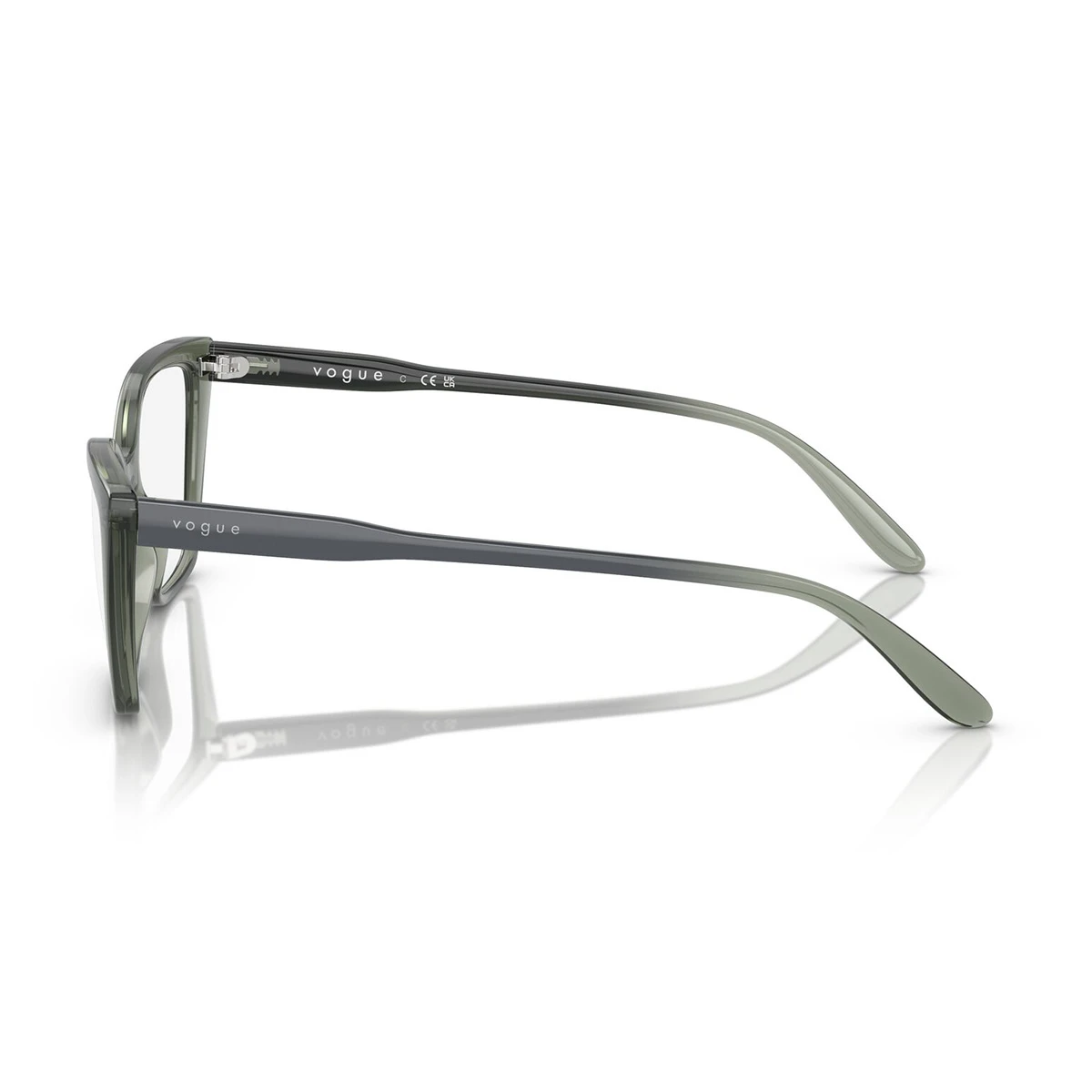 Oprawki damskie marki Vogue. Tarcze wyciągnięte w kocie oko, ścięte od dołu. Front w semi-transparentnym kolorze szaro-zielonym. Zauszniki szare, przechodzą w kolor frontu na końcówkach. Na zausznikach przy zawiasach subtelne logo Vogue.