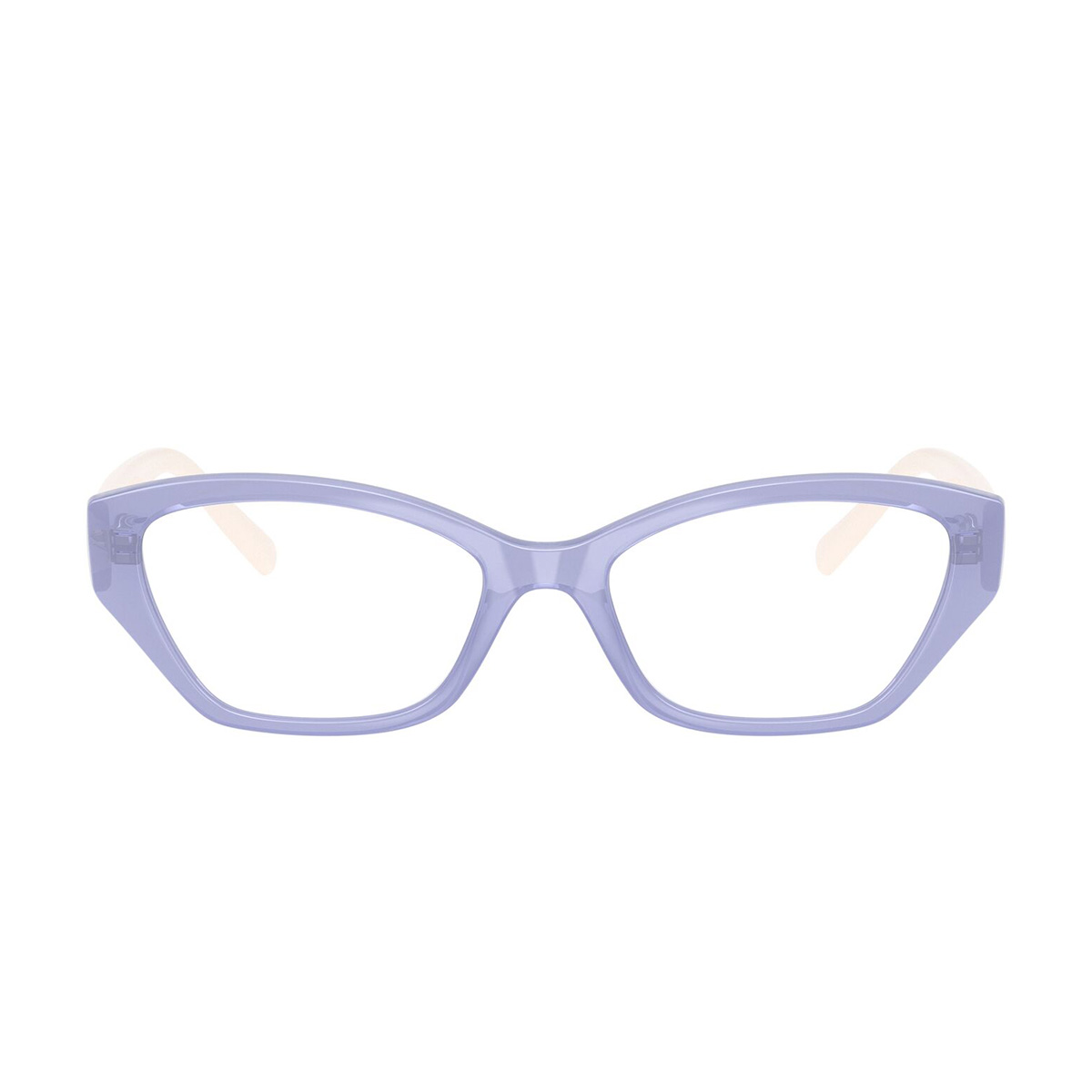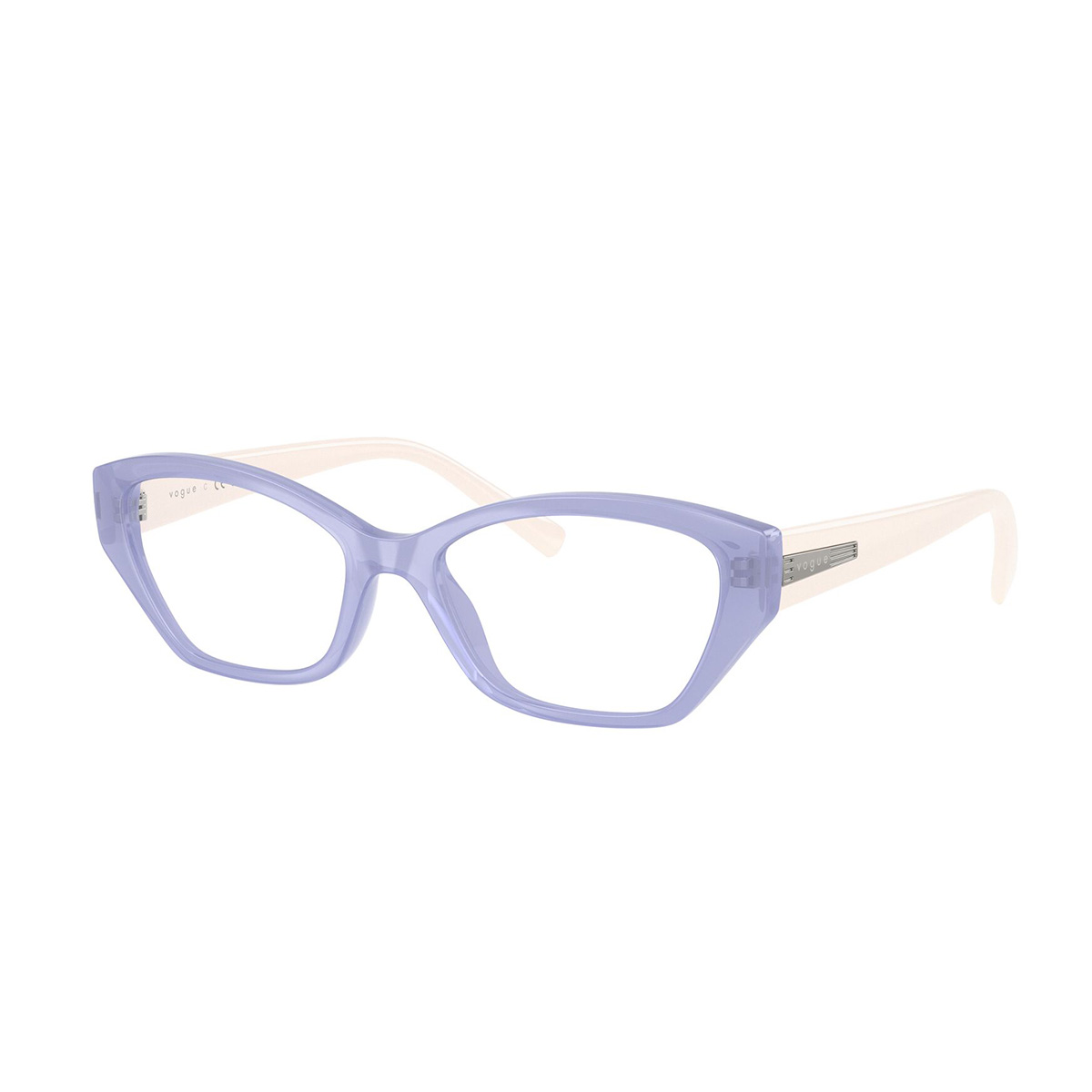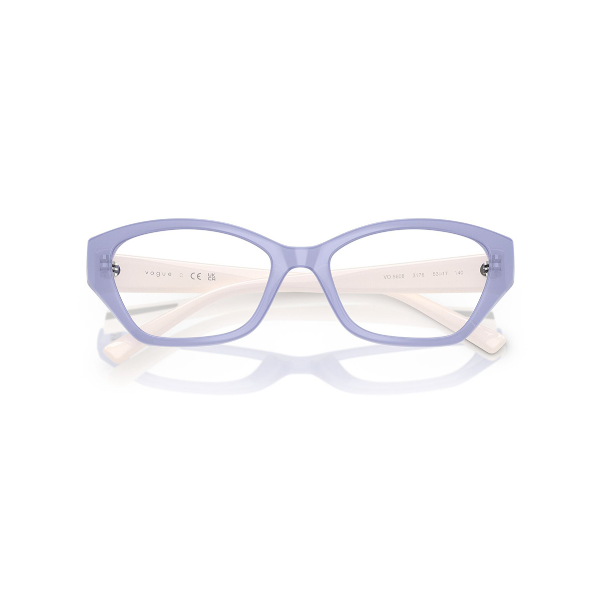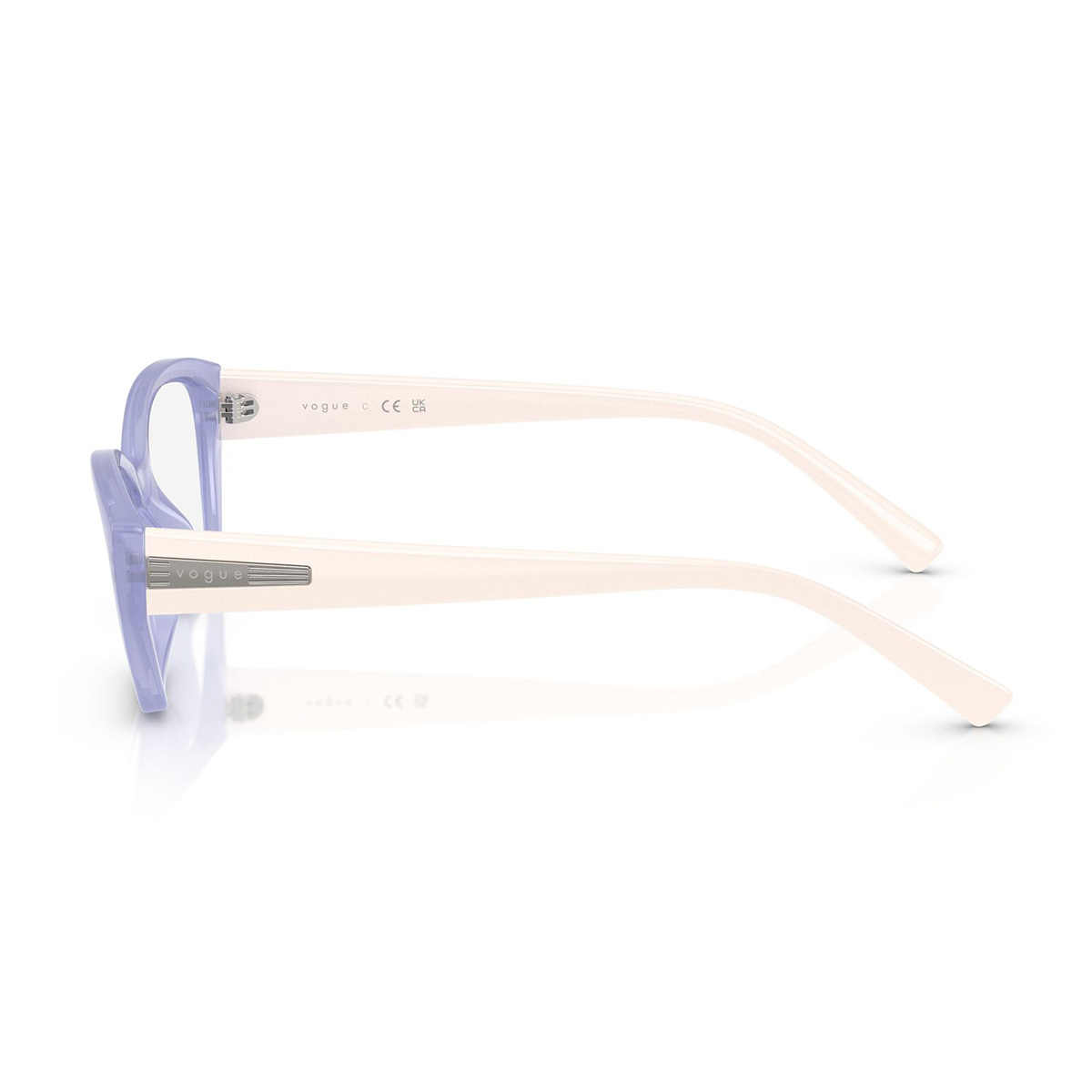 Oprawki damskie marki Vogue. Tarcze wyciągnięte w kocie oko, ścięte od dołu (niskie tarcze), niewielki rozmiar. Front w semi-transparentnym kolorze liliowym. Zauszniki w kolorze białym. Logo Vogue na zausznikach przy zawiasach, na srebrnym elemencie.