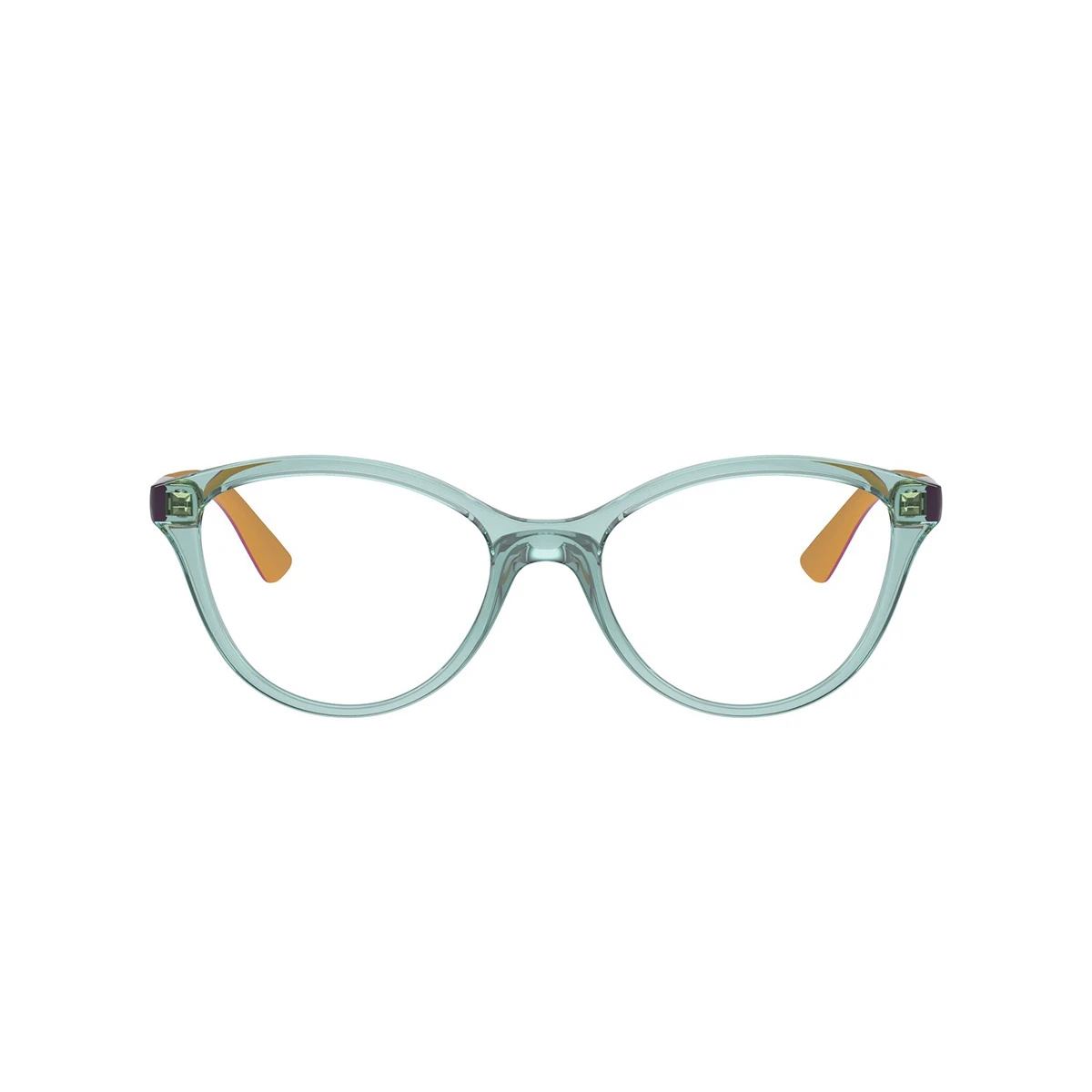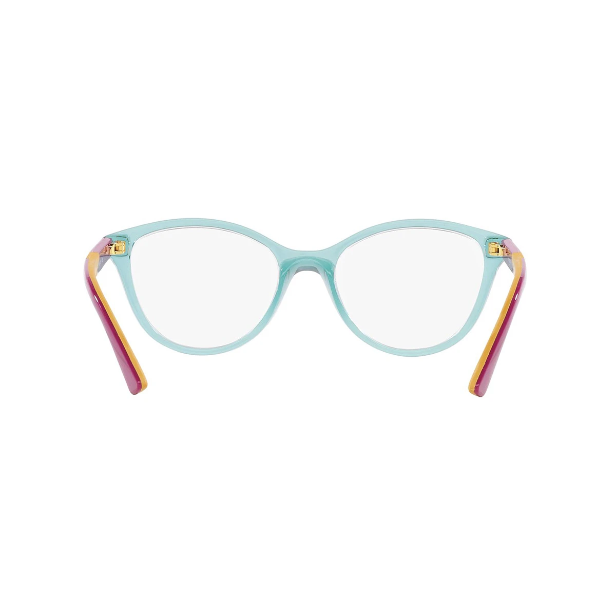 Oprawka Vogue dedykowana dla młodych użytkowniczek. Front w semi-transparentnym kolorze zielonym (na granicy z kolorem turkusowym). Owalne tarcze zbliżone kształtem do motyla. Zauszniki w kolorze malinowym z pomarańczowym akcentem. Obniżony mostek wspomaga prawidłową centrację oka – u dzieci niekiedy szczególnie wymagającą, przez drobne nasady nosa. Subtelne logo Vogue na zausznikach.