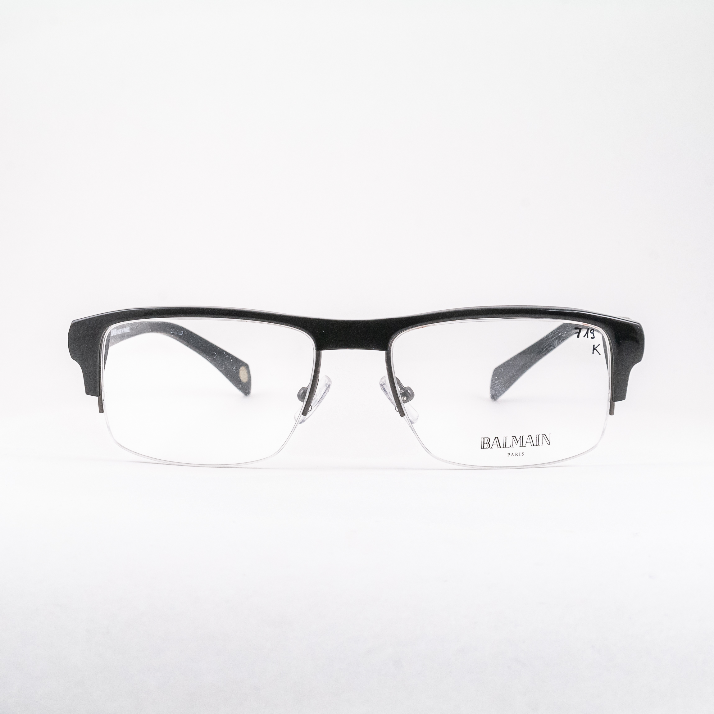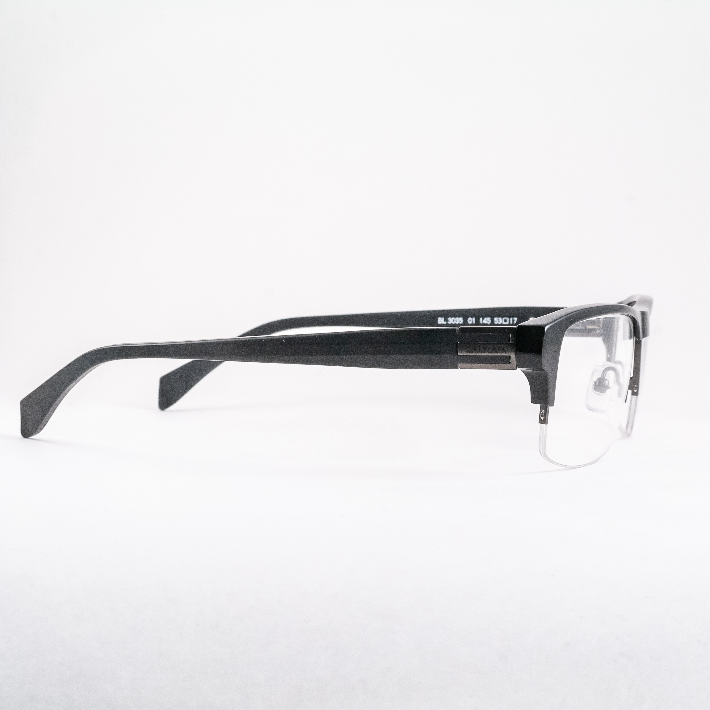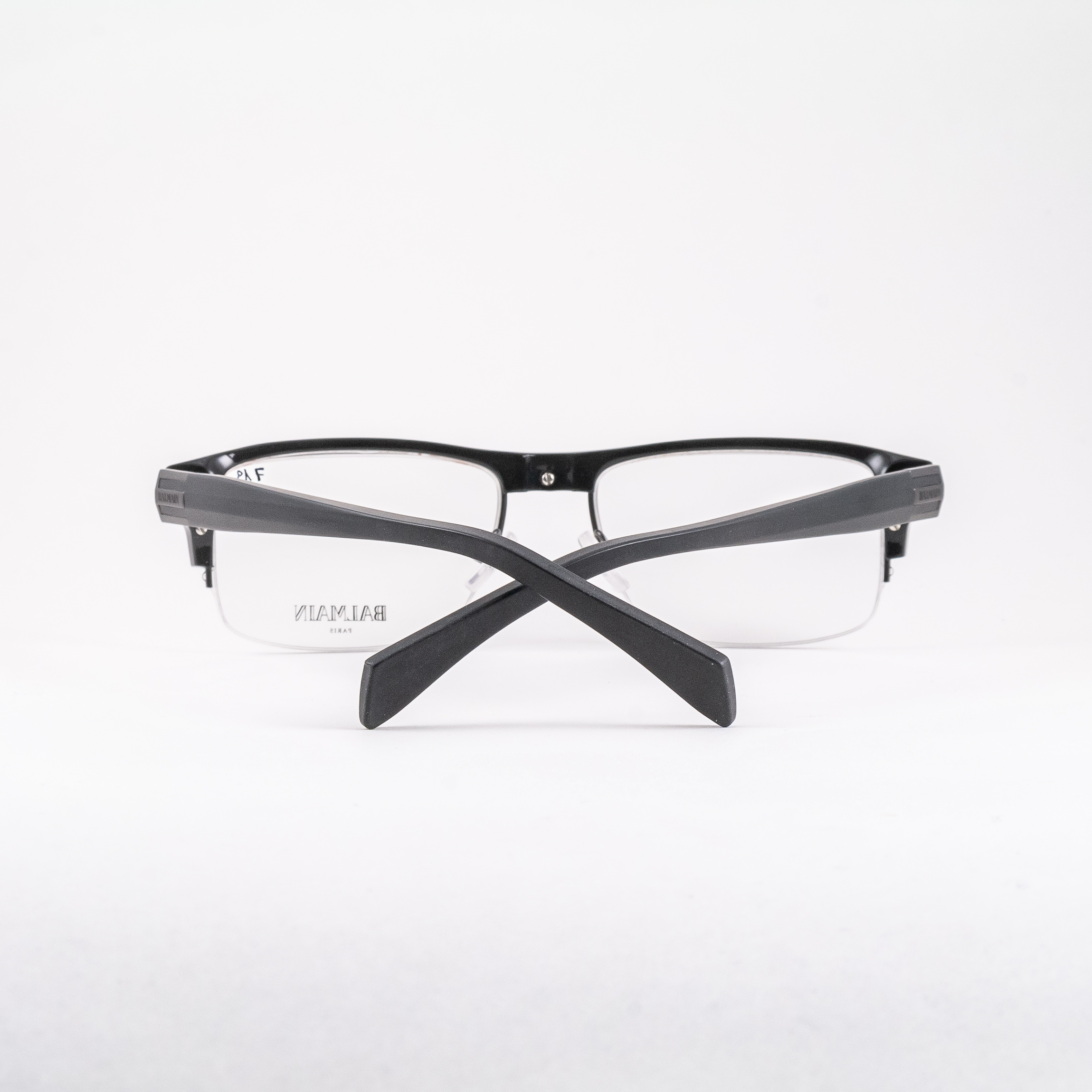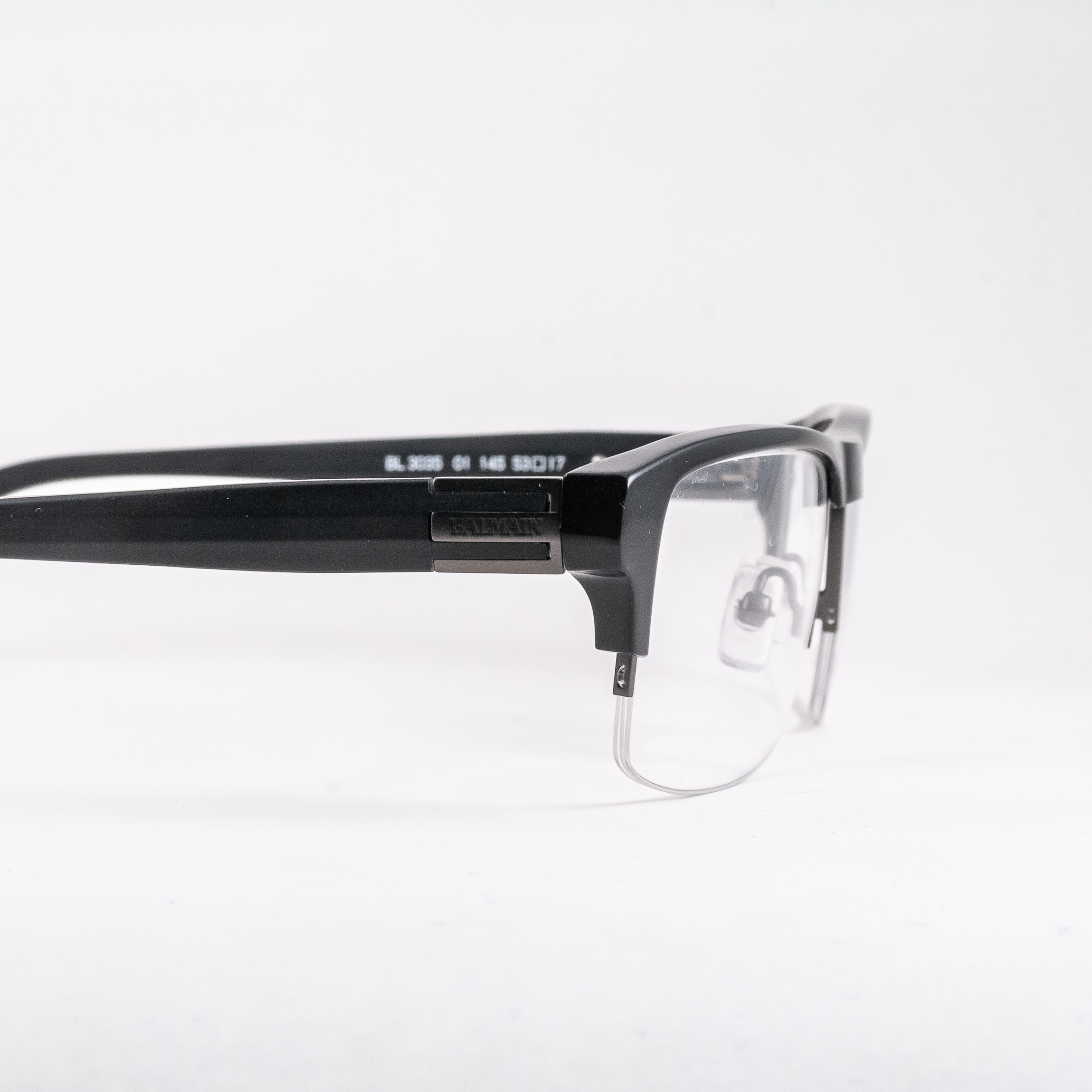 Oprawki męskie francuskiej marki Balmain. Wysokiej jakości tworzywo, montaż na żyłkę. Tarcze zbliżone kształtem do prostokąta, mocno zaznaczona linia brwi ścięta na prosto. Front w połyskującym kolorze czarnym, zauszniki w matowym kolorze grafitowym, logo marki przy zawiasach.