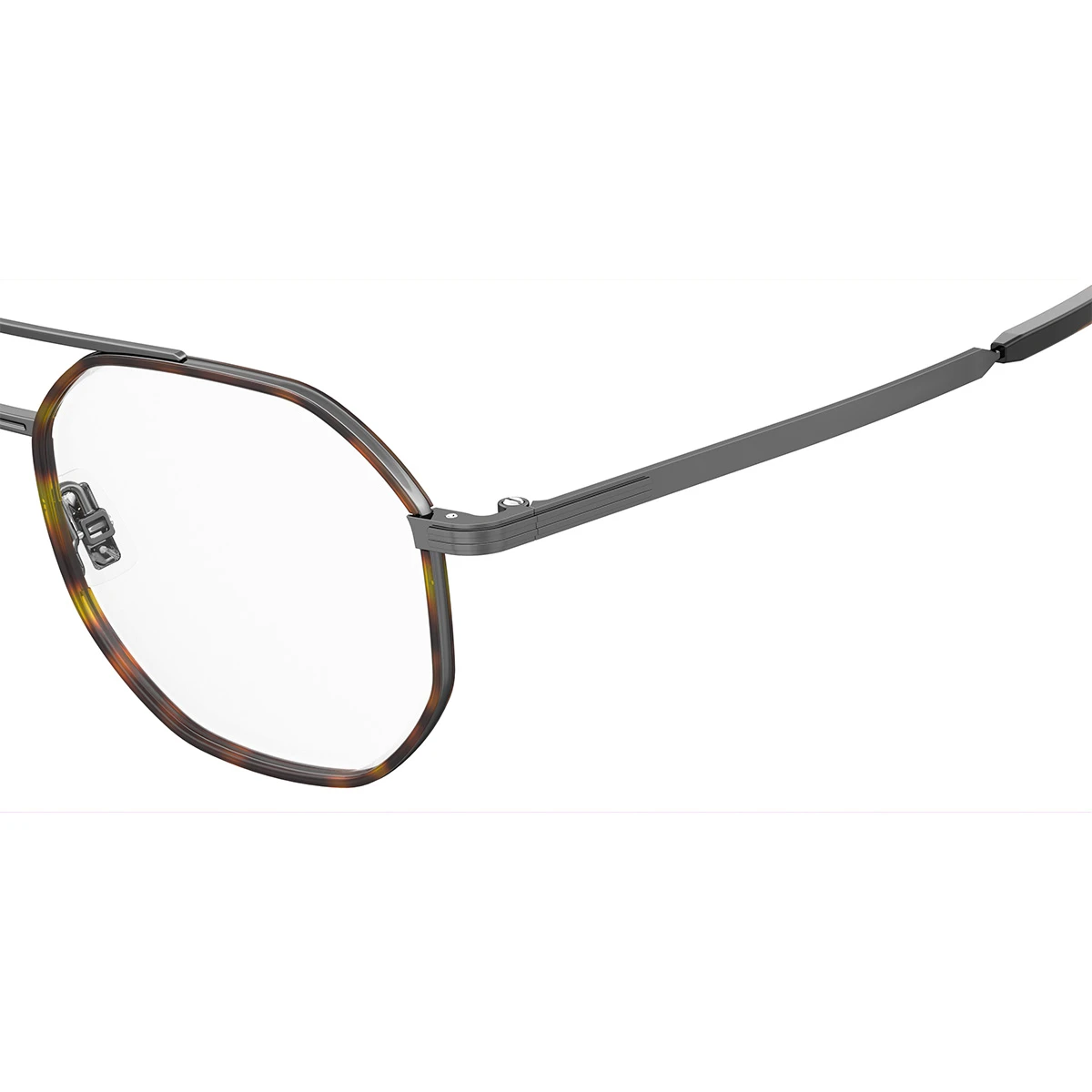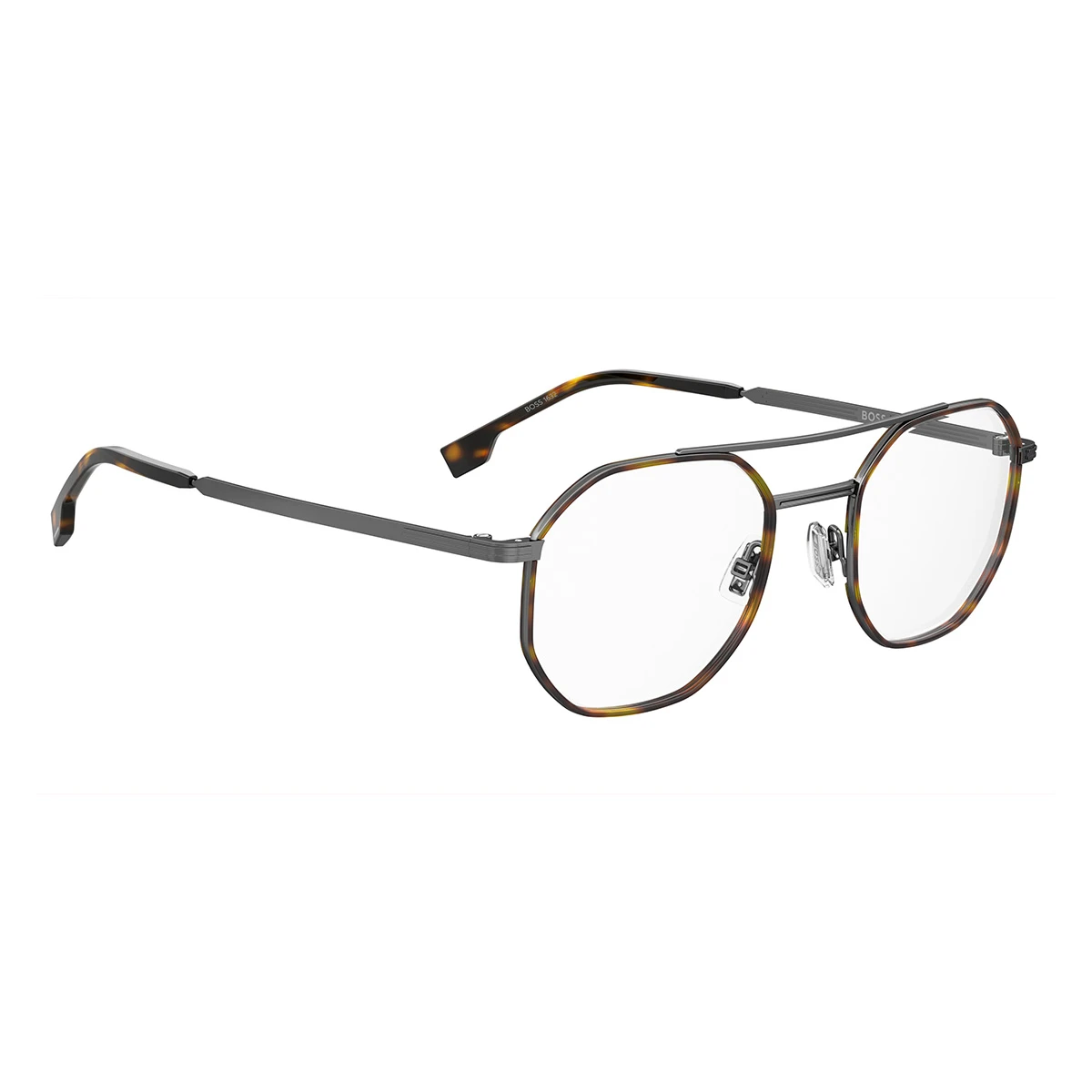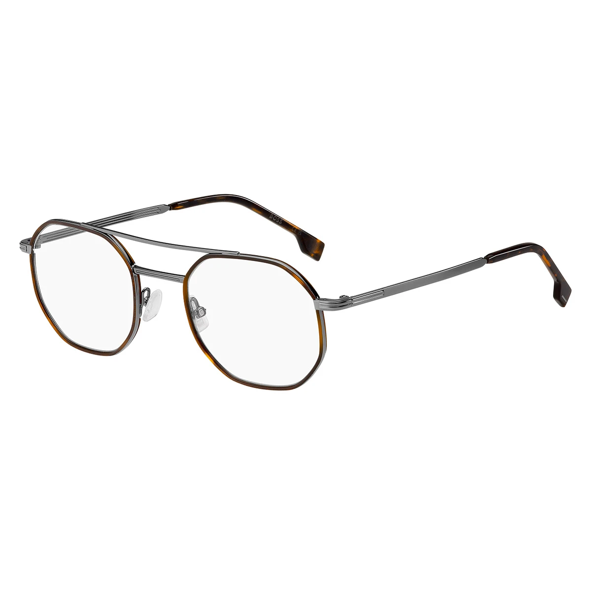 Nowoczesne męskie oprawki Boss o geometrycznej formie. Wykonane z lekkiego metalu w matowym, grafitowym wykończeniu. Na tarczach cienkie tworzywo w kolorze ciemnej havany – ciepły, brązowo melanż dodaje głębi i charakteru. Model wyposażony w podwójny mostek (dodatkową poprzeczkę na linii brwi). Zauszniki metalowe, z końcówkami z acetatu w dopasowanej kolorystyce. Oprawki mają regulowane noski z silikonu, co pozwala na idealne dopasowanie do różnych kształtów nosa.