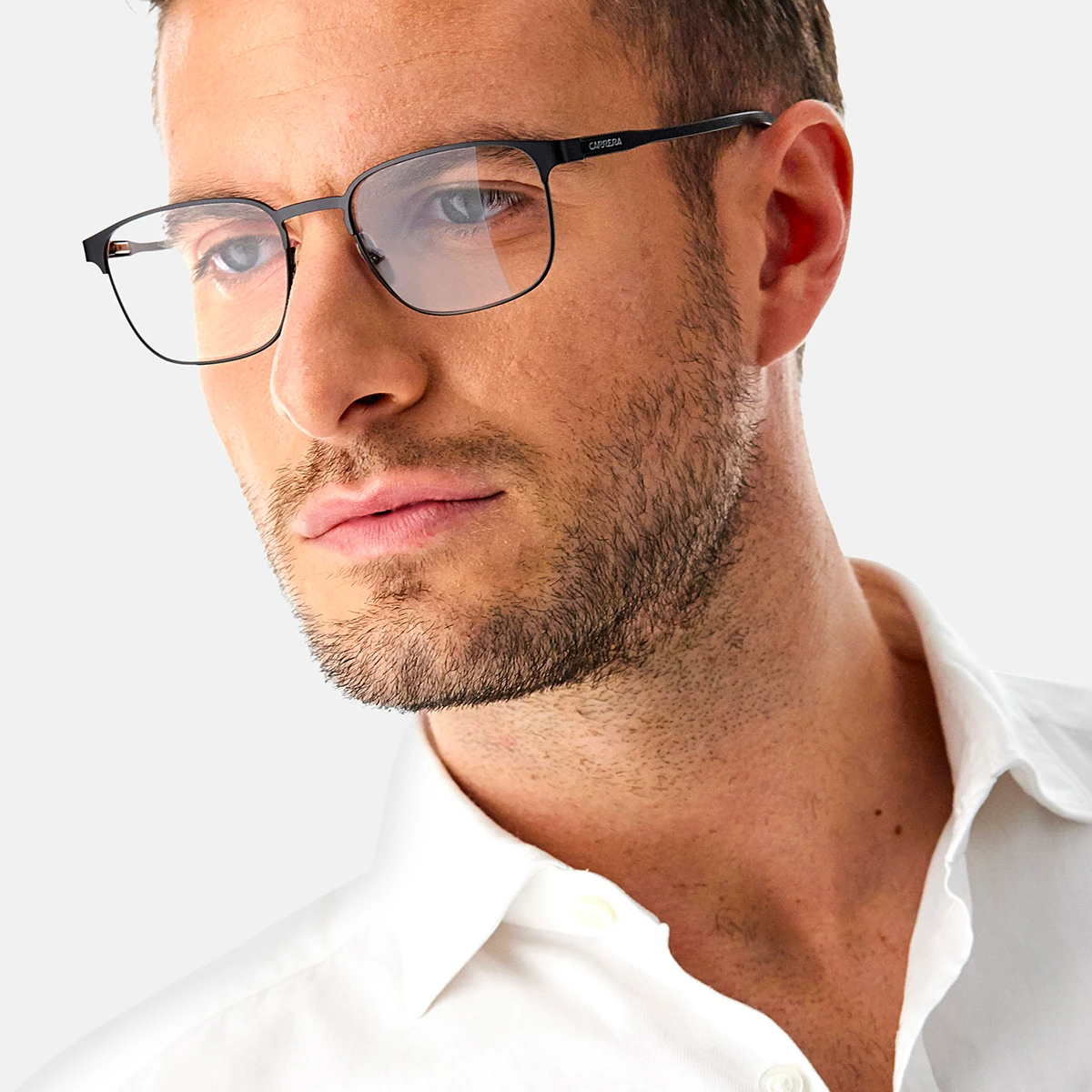 Prostokątne oprawki wykonane z czarnego metalu. Front smukły, o wyrazistej, ale stonowanej linii. Górna krawędź wyraźnie zarysowana, dolna łagodniej zaokrąglona. Mostek wąski, zintegrowany z konstrukcją. Regulowane silikonowe nanośniki. Zauszniki z tworzywa o delikatnej fakturzere. Logo Carrera subtelnie zaznaczone na zausznikach przy zawiasach.