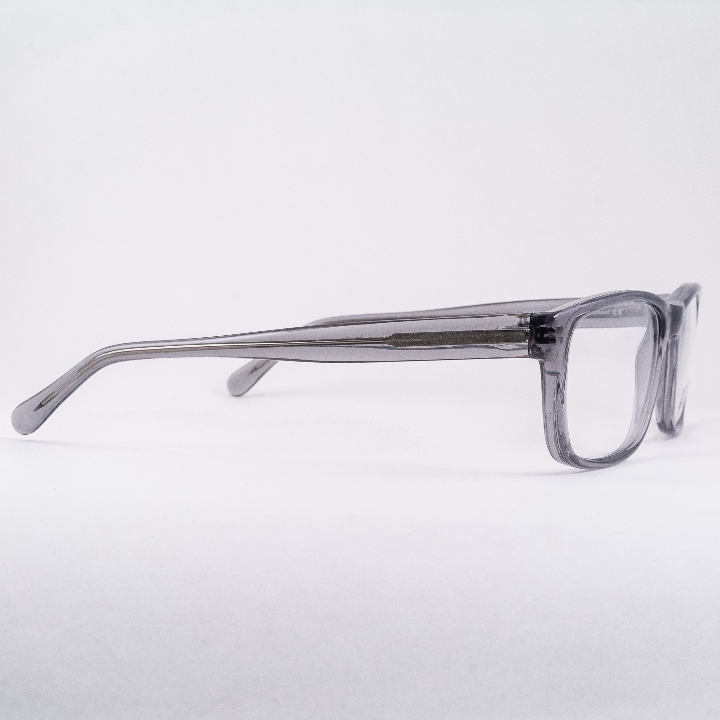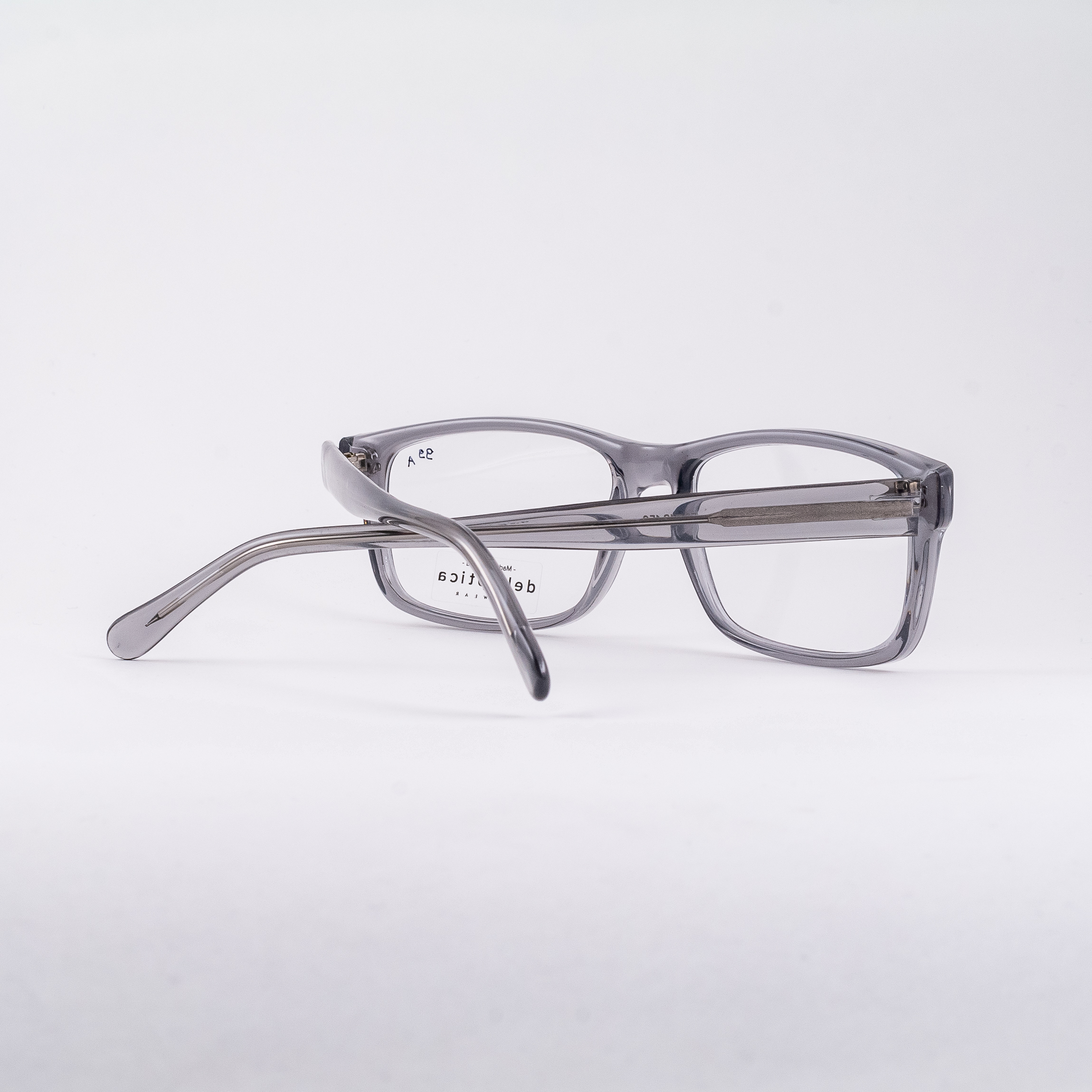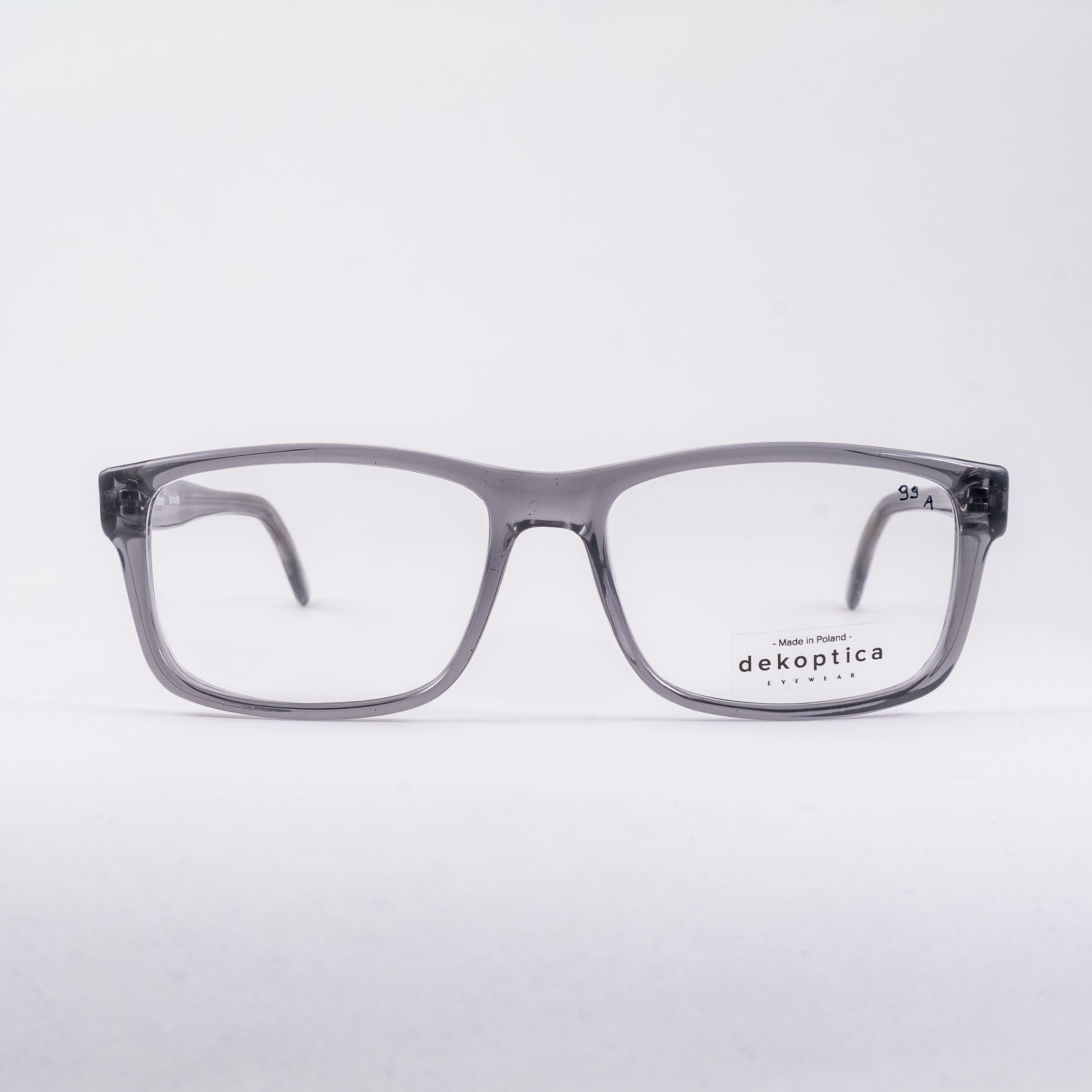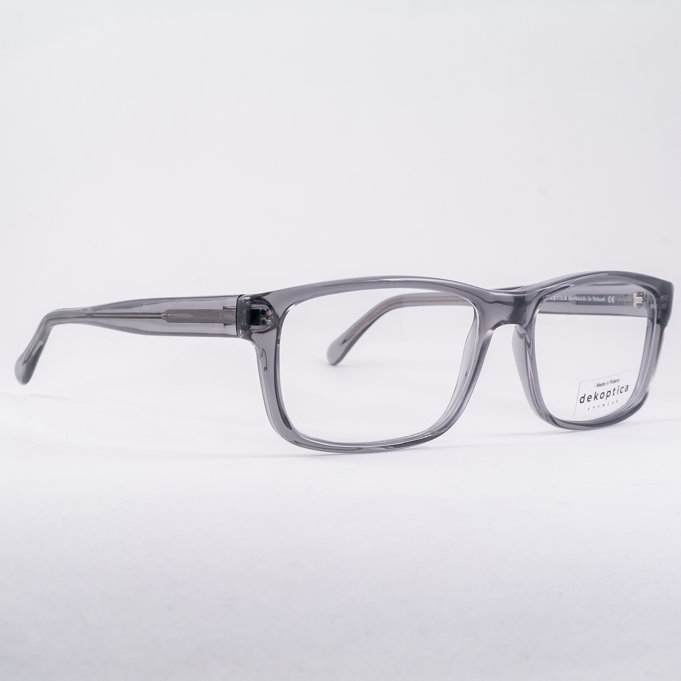 Plastikowe oprawki męskie o prostokątnych tarczach od polskiej marki Dekoptica. Całość w częściowo przezroczystym kolorze szarym.