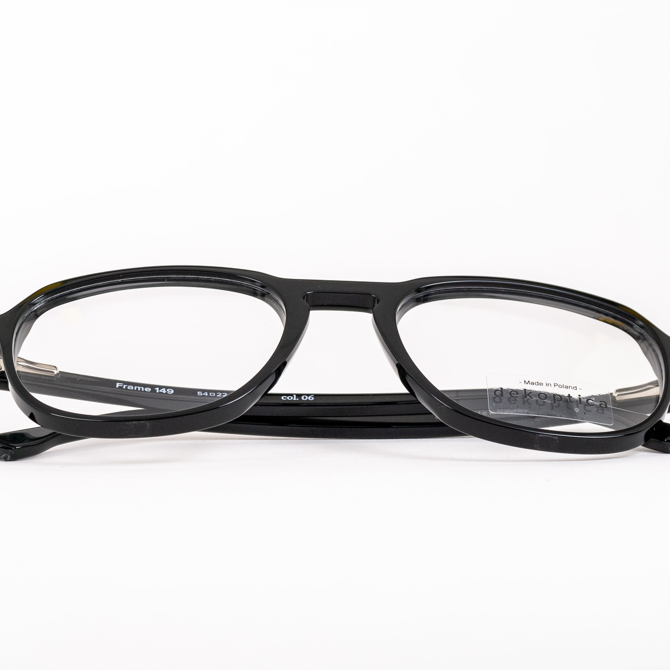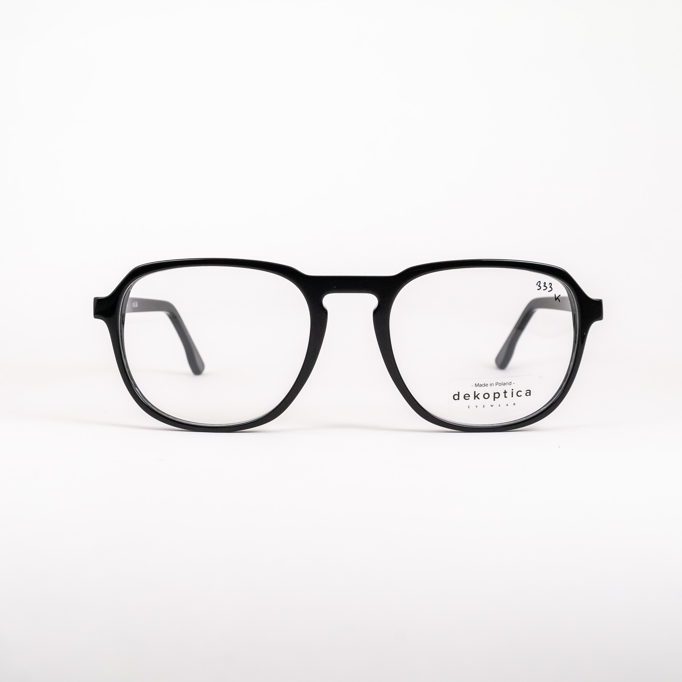 Oprawki męskie z tworzywa od polskiego producenta – wrocławskiej marki Dekoptica. Duże tarcze o niejednoznacznym kształcie połączone wysokim mostkiem – poprzeczką na linii brwi. Przemyślany projekt, bo wspaniale układają się na twarzy. Całość w klasycznej czerni, komfortowe zawiasy typu flex.