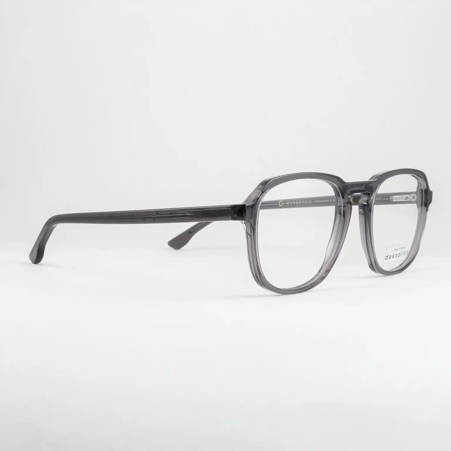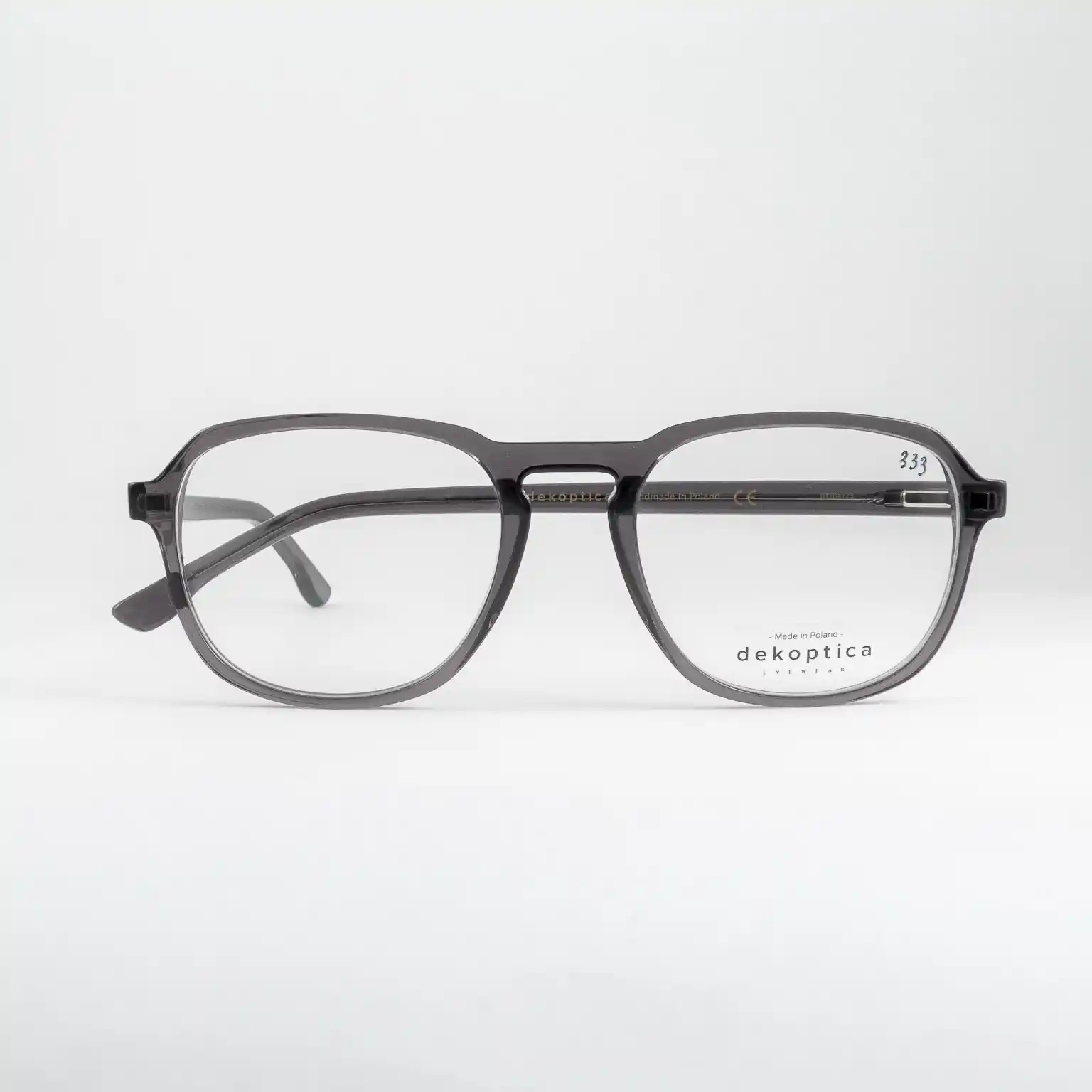 Oprawki męskie wykonane z tworzywa od polskiego producenta – wrocławskiej marki Dekoptica. Duże tarcze o niejednoznacznym kształcie połączone wysokim mostkiem – poprzeczką na linii brwi. Przemyślany projekt, bo wspaniale układają się na twarzy. Całość w lekko przejrzystym kolorze szarym. Komfortowe zawiasy typu flex.