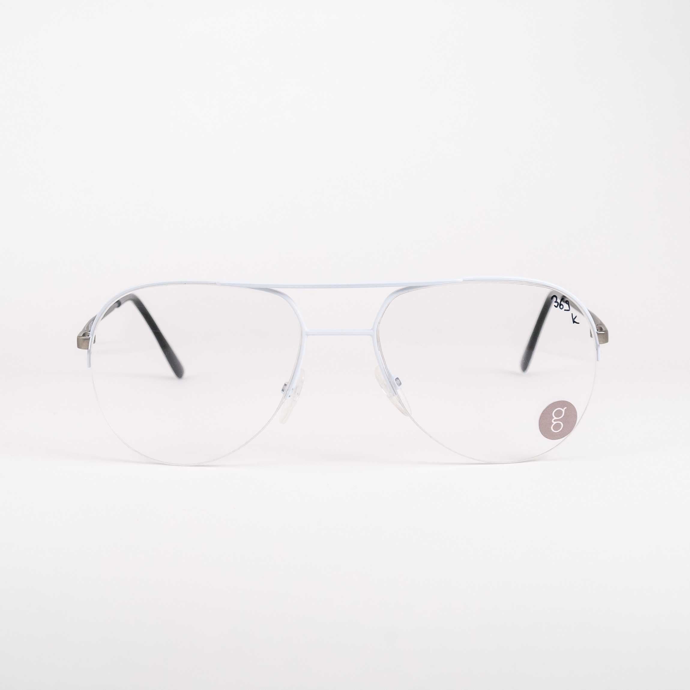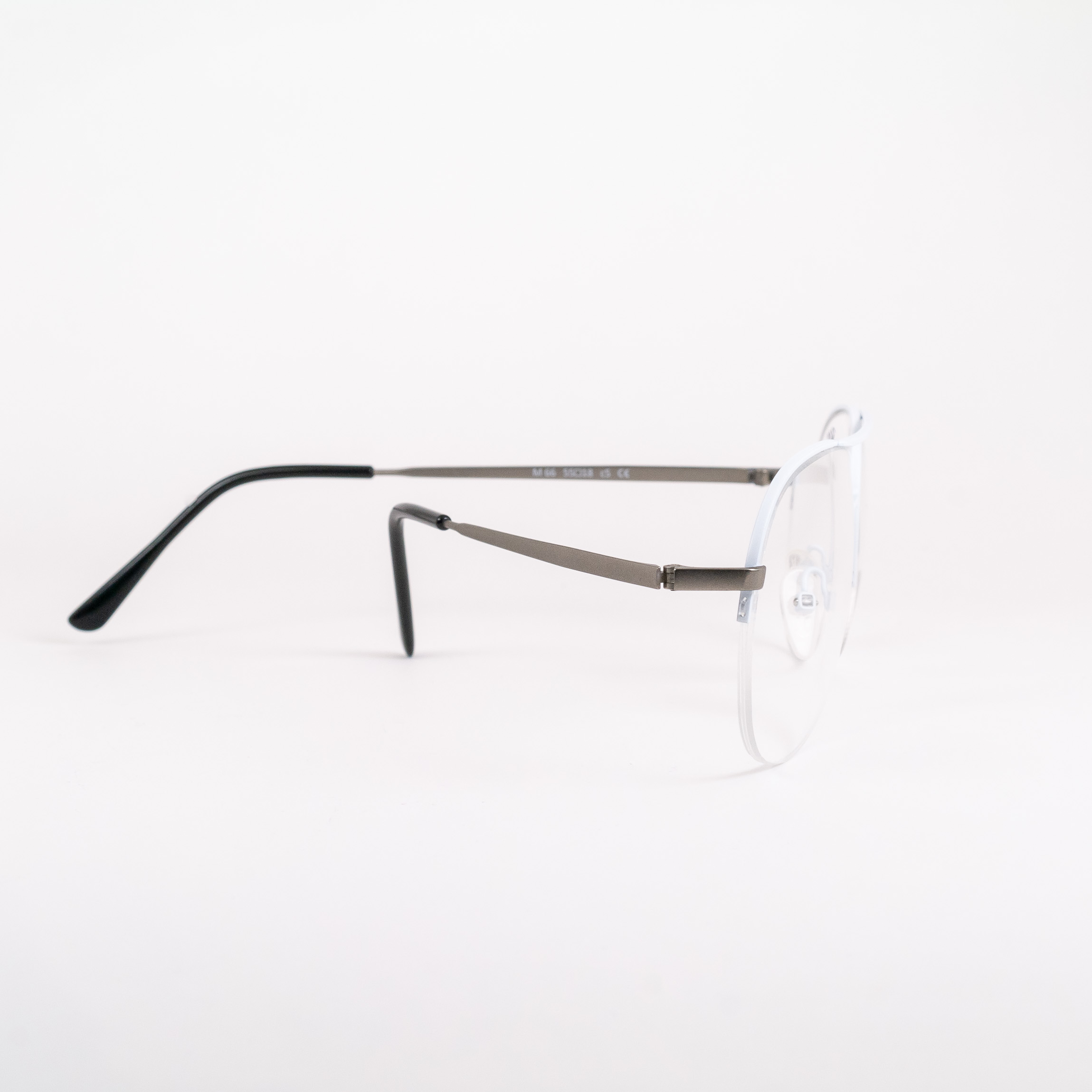 Metalowe oprawki okularowe od polskiej firmy Indigo. Montaż na żyłce, podwójna poprzeczka. Śnieżnobiały front i grafitowe zauszniki – wszystko w matowym wydaniu. Plastikowe zakończenia zauszników w czerni.