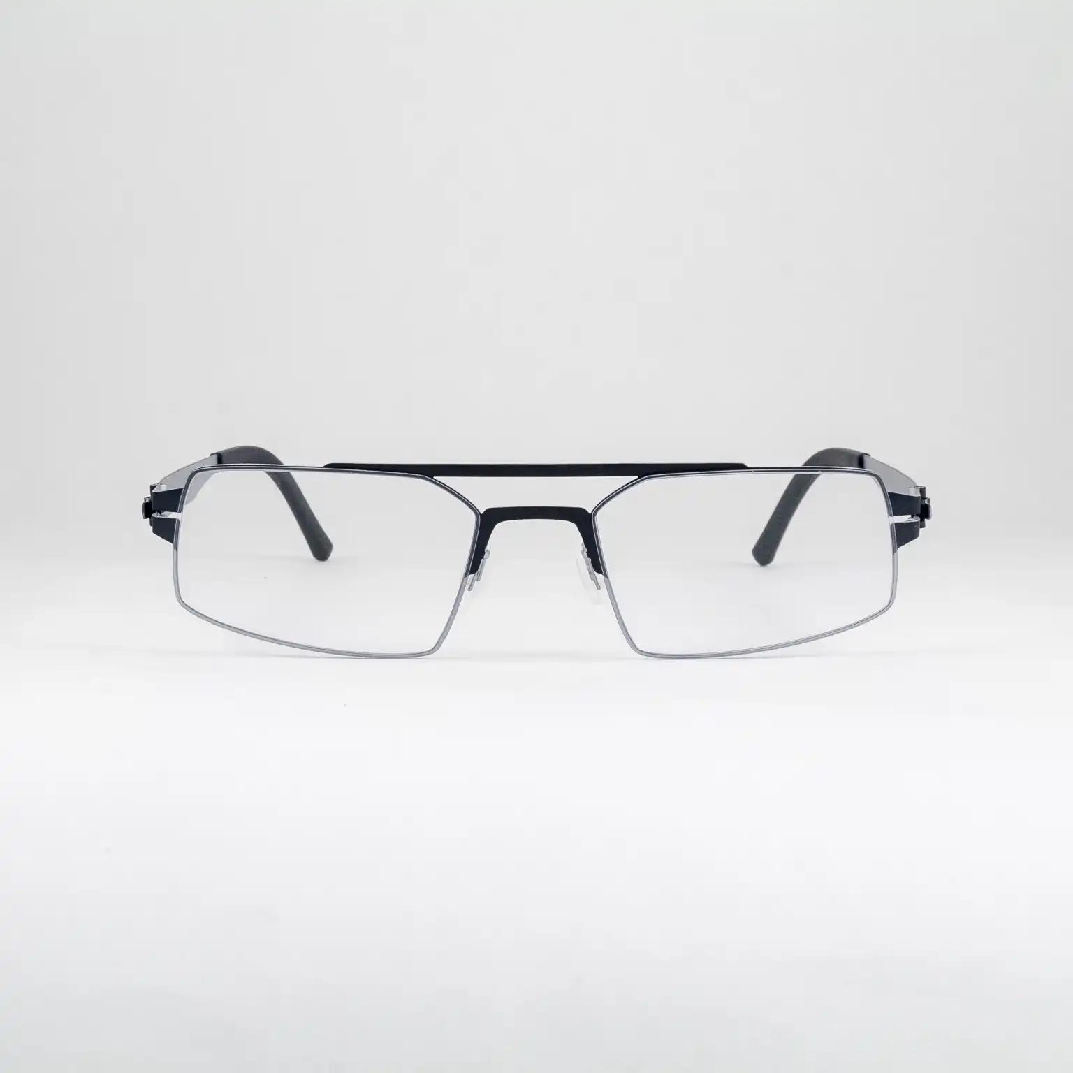 Oprawki męskie z kolekcji Johnny Modista, od polskiego producenta Liw Lewant. Wykonane z wysokiej jakości stali nierdzewnej, wyposażone w warstwę chromu, tytanu i hipoalergicznego lakieru. Konstrukcja bez śrubek, całość niezwykle lekka i elastyczna. Prostokątne tarcze, wyraźniejsza poprzeczka. Dominuje ciemny, matowy kolor granatowy. Matowe srebro od wewnątrz i od dołu tarcz. Gumowe zakończenia zauszników.