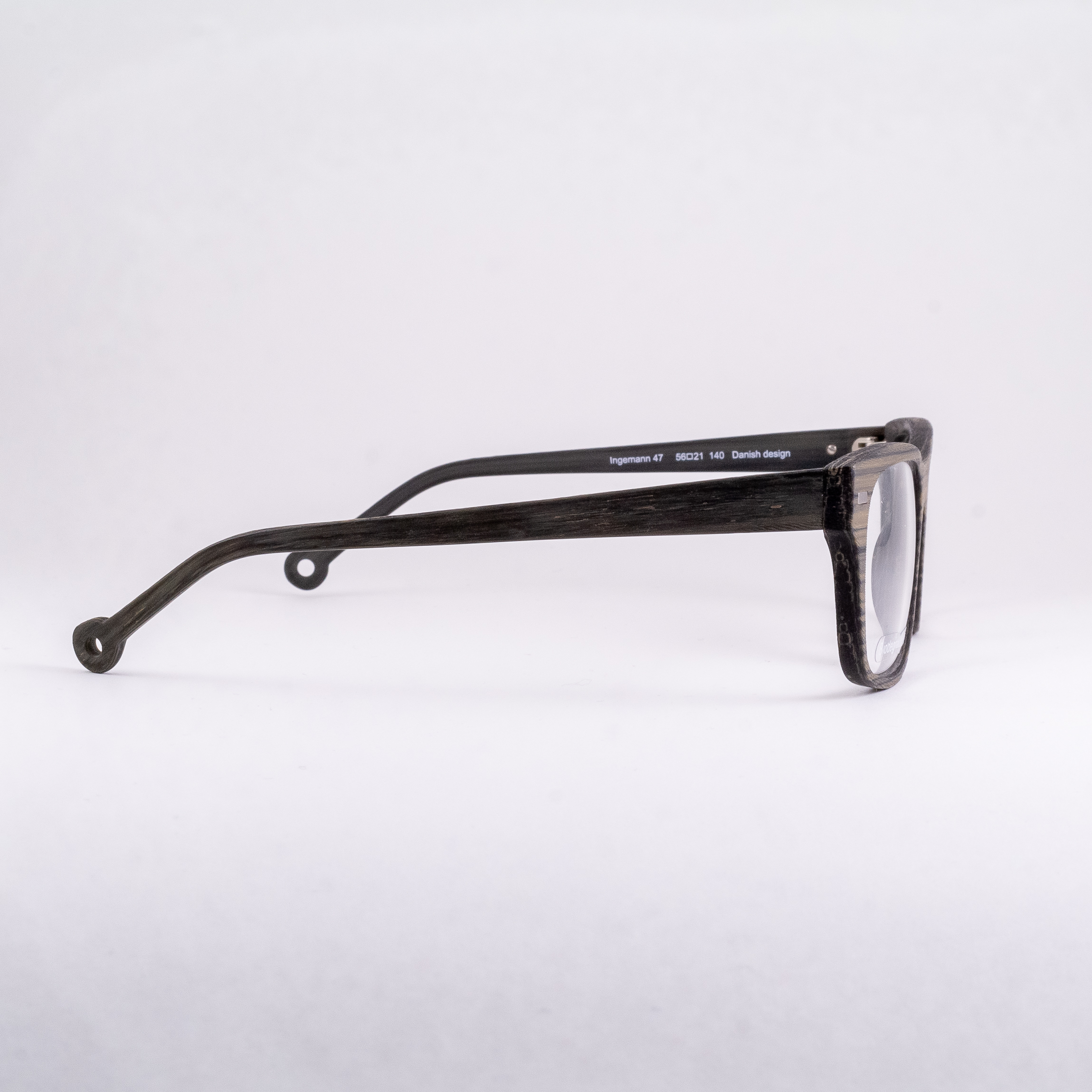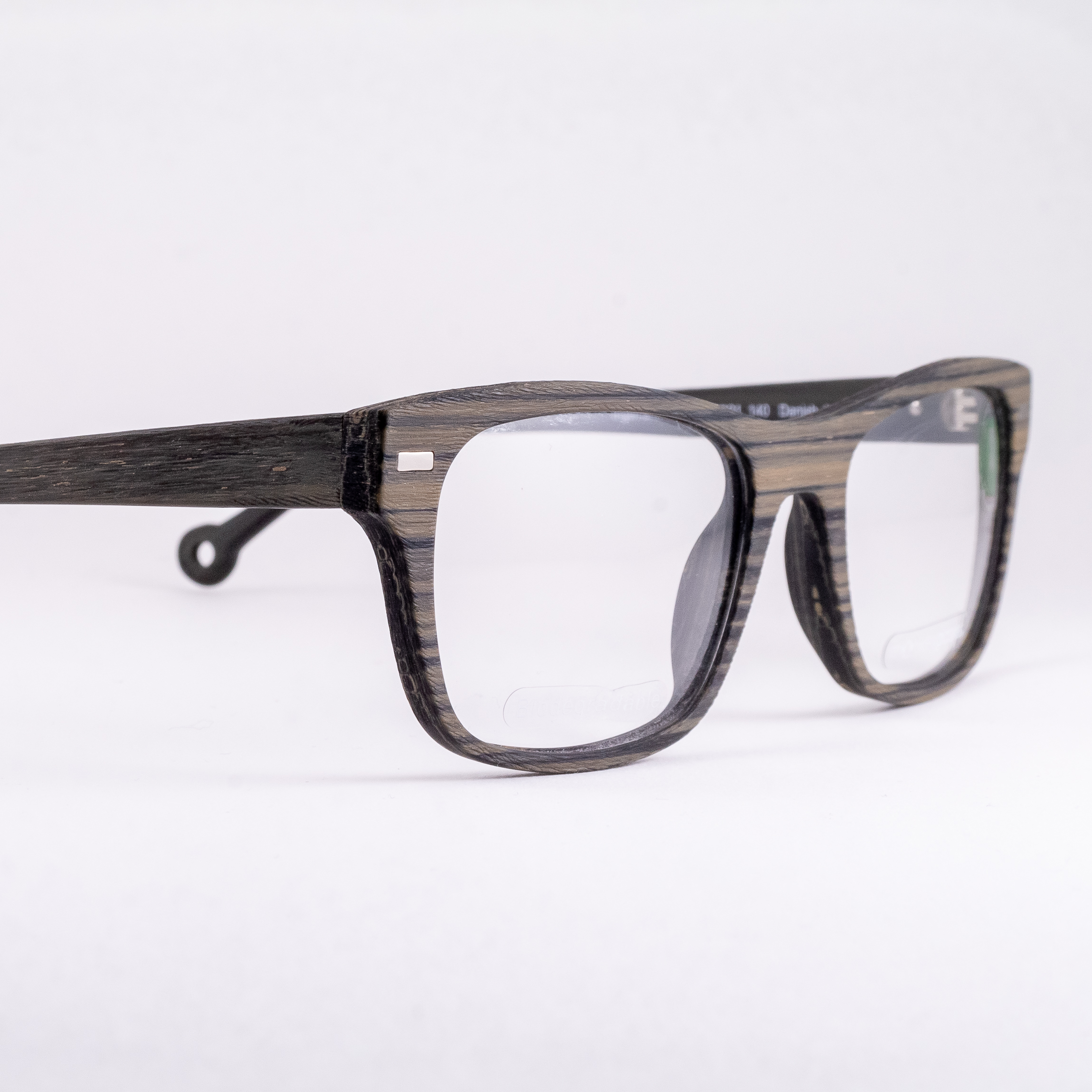Szerokie tarcze – model w dużym rozmiarze. Dominuje chłodny brąz, choć widocznie przebija się ciemnoszary oraz khaki. Matowa faktura przypomina wygładzone drewno. Na lewym zauszniku srebrne logo marki, oryginalne zakończenia zauszników z dziurką.