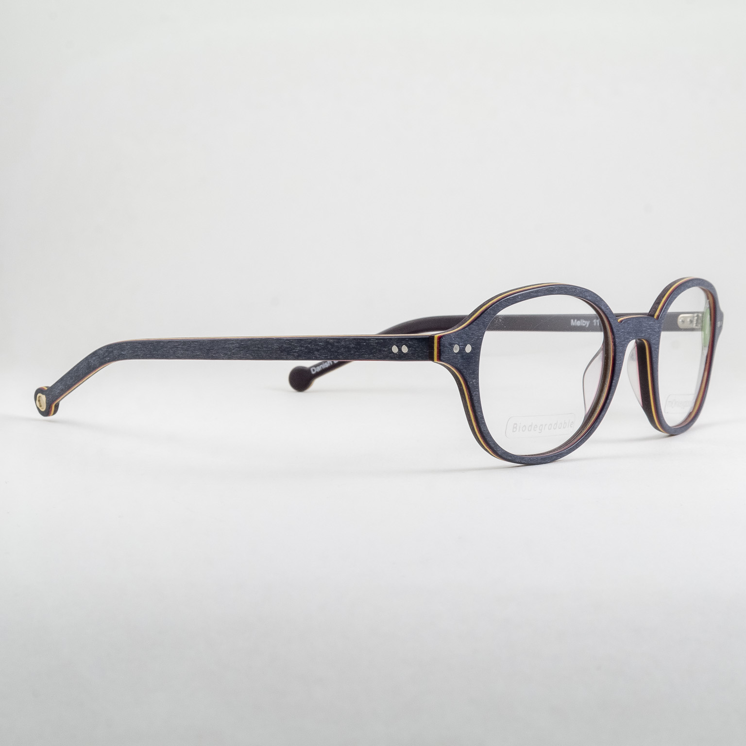 Oprawki do okularów duńskiej marki Monkeyglasses wykonane w większości z tworzywa z recyklingu i wyprodukowane w duchu mody zrównoważonej – materiał biodegradowalny. Owalne tarcze. Oprawki w kolorze granatowym w matowej fakturze imitująca wygładzone drewno. Krawędzie oprawy z żółto-czerwonymi liniami. Oryginalne zakończenia zauszników z dziurką. W Polsce dostaniesz je tylko u nas, gorąco zapraszamy.