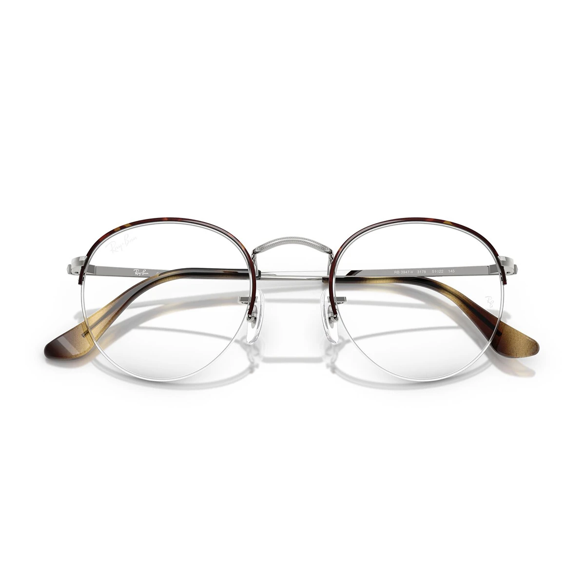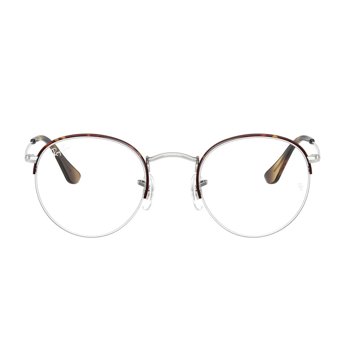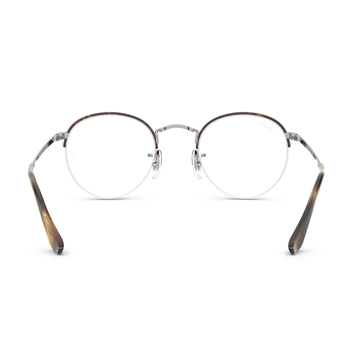 Uniwersalny, metalowy model z montażem na żyłkę – podwieszone szkła. Na tarczach i końcówkach zauszników subtelny szylkret (mieszanka odcieni brązu). Wysoki mostek, charakterystycznie wyprofilowany w kolorze srebrnym, tak jak zauszniki. Elastyczne noski z przezroczystego silikonu pozwalają na indywidualne dopasowanie. Subtelne logo Ray-Ban na zausznikach przy zawiasach.